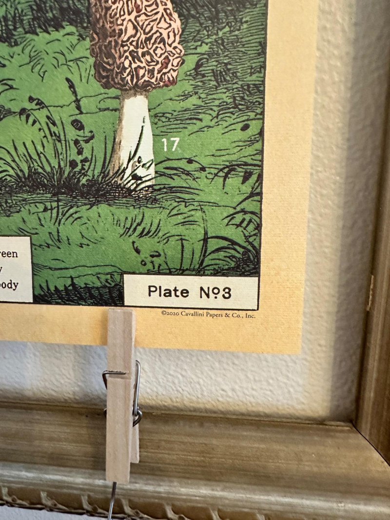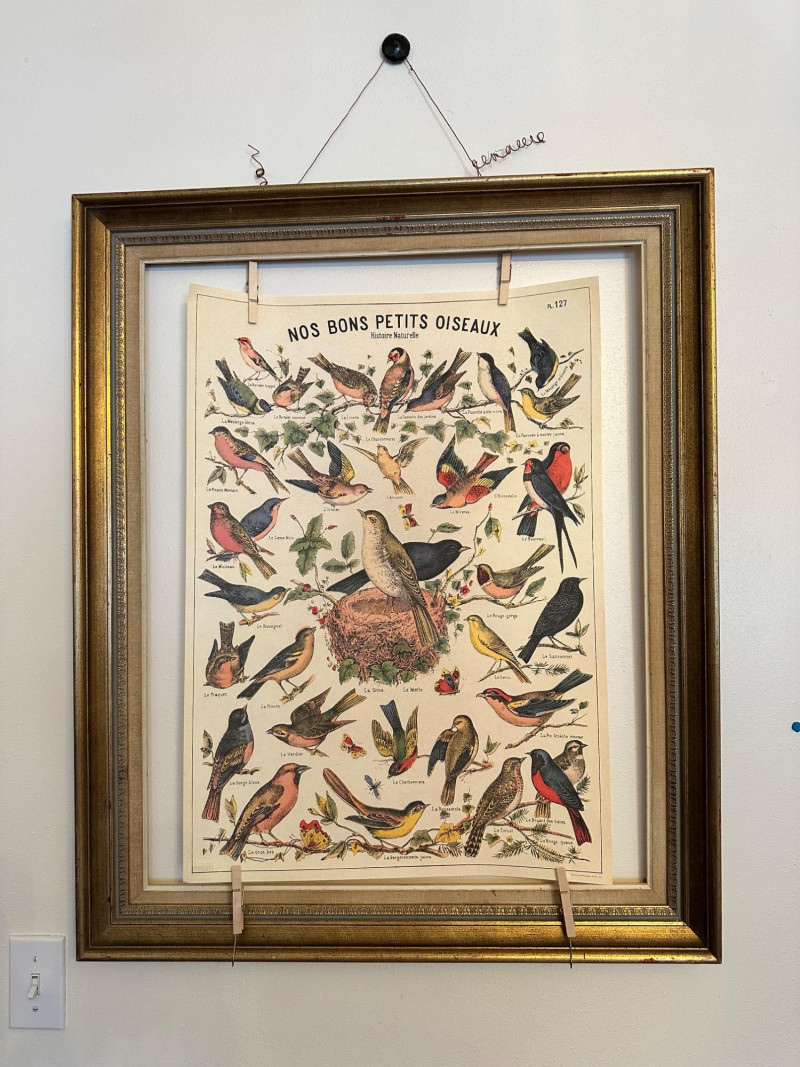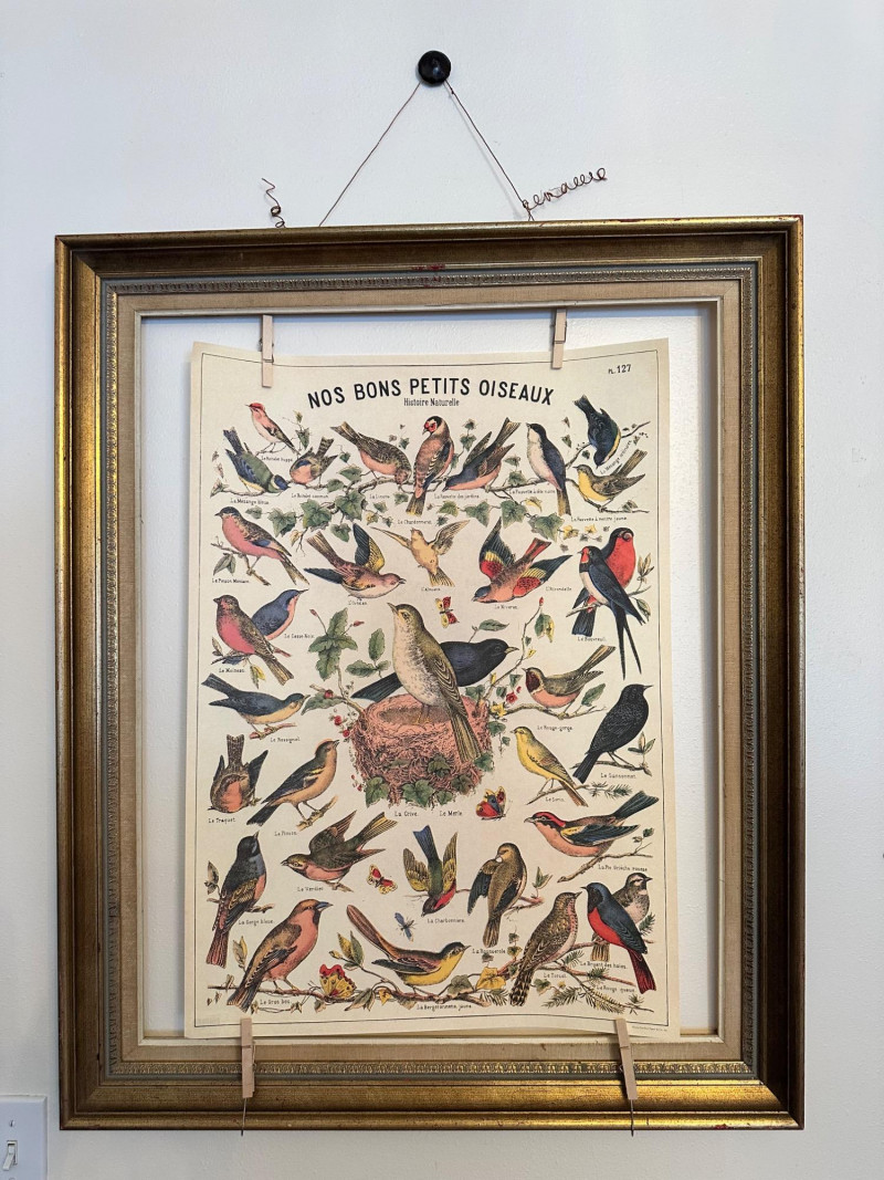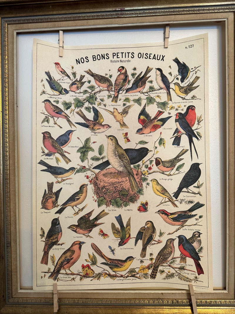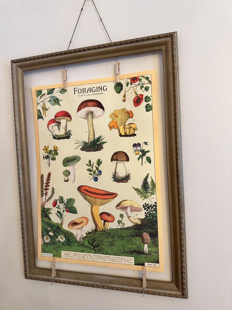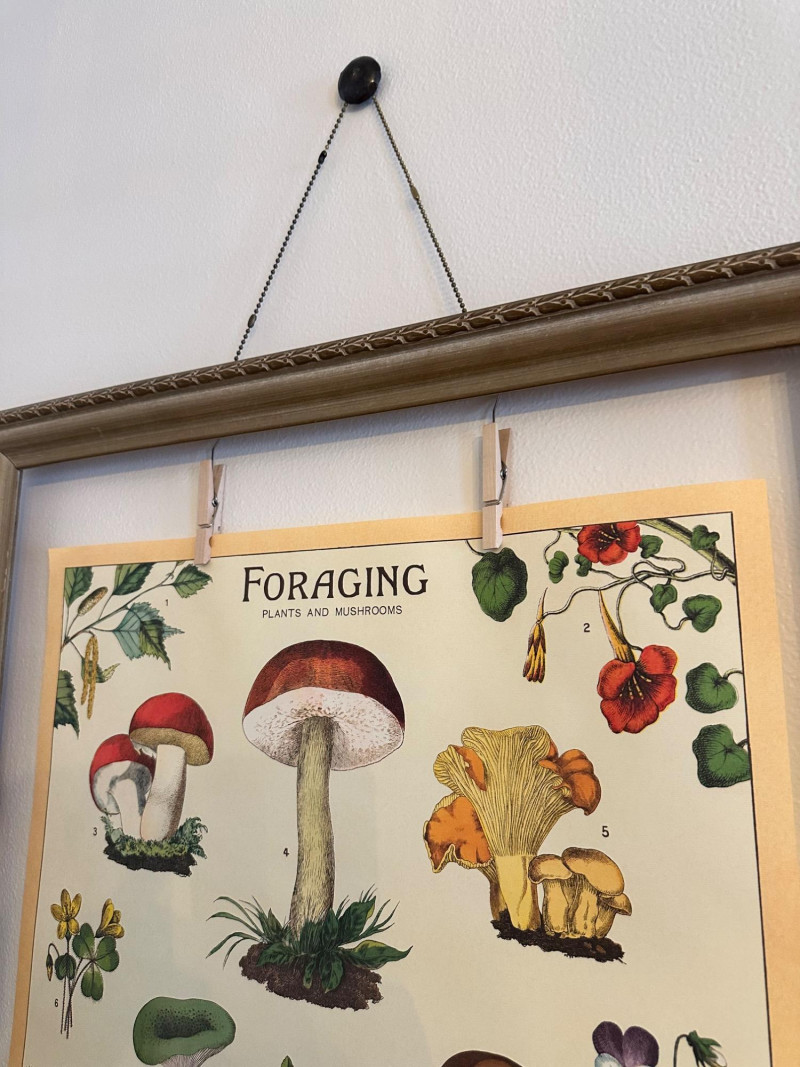 Framed Foraging & Bird Natural History Prints Pair of vintage-style natural history prints displayed in clip-mounted wood frames. One print, titled Foraging: Plants and Mushrooms, features detailed illustrations of edible mushrooms, herbs, and plants, labeled with names such as Chanterelle, Slippery Jack, and Wild Strawberry. The second print, Nos Bons Petits Oiseaux, depicts a variety of European songbirds with French labels, including Le Rouge-Gorge and La Mésange Bleue. Both are printed on aged-look paper and framed under glass with metal hanging chains. Measurements: