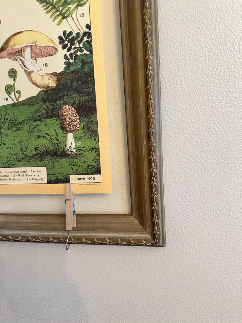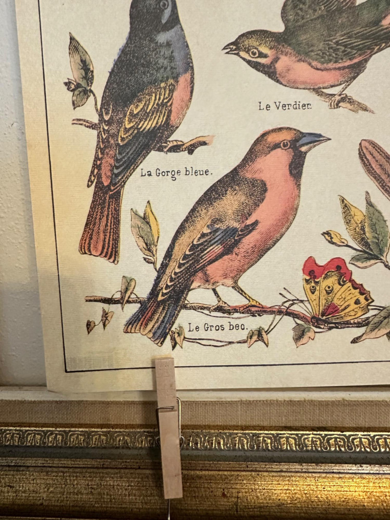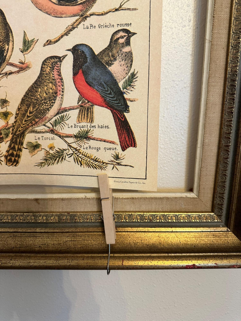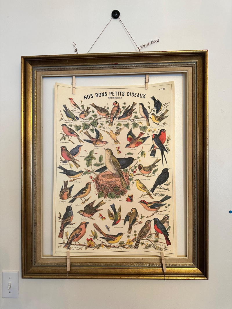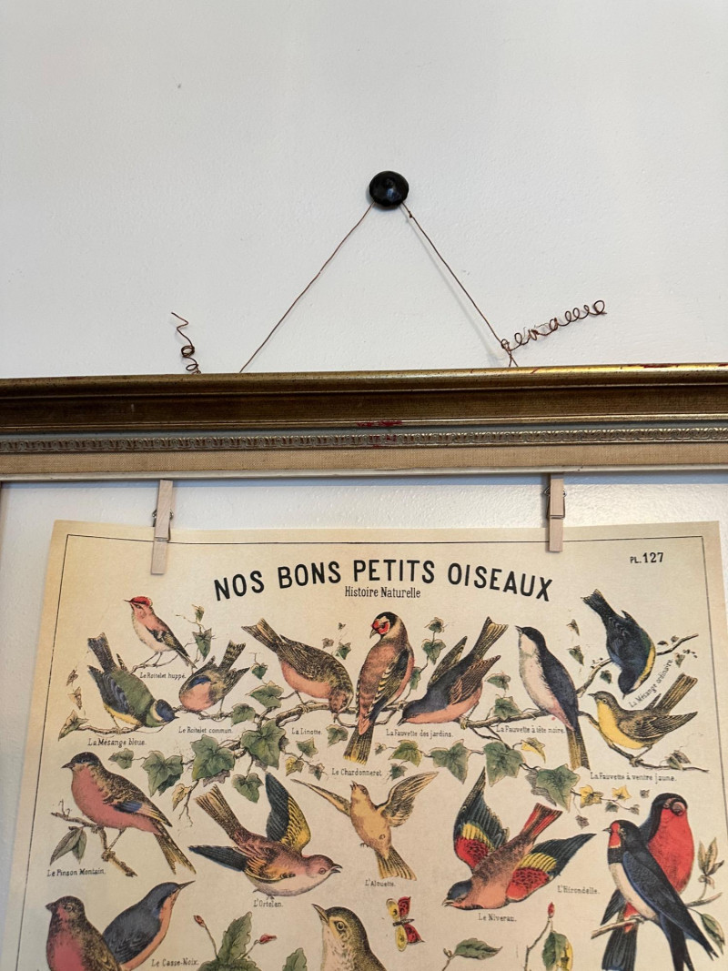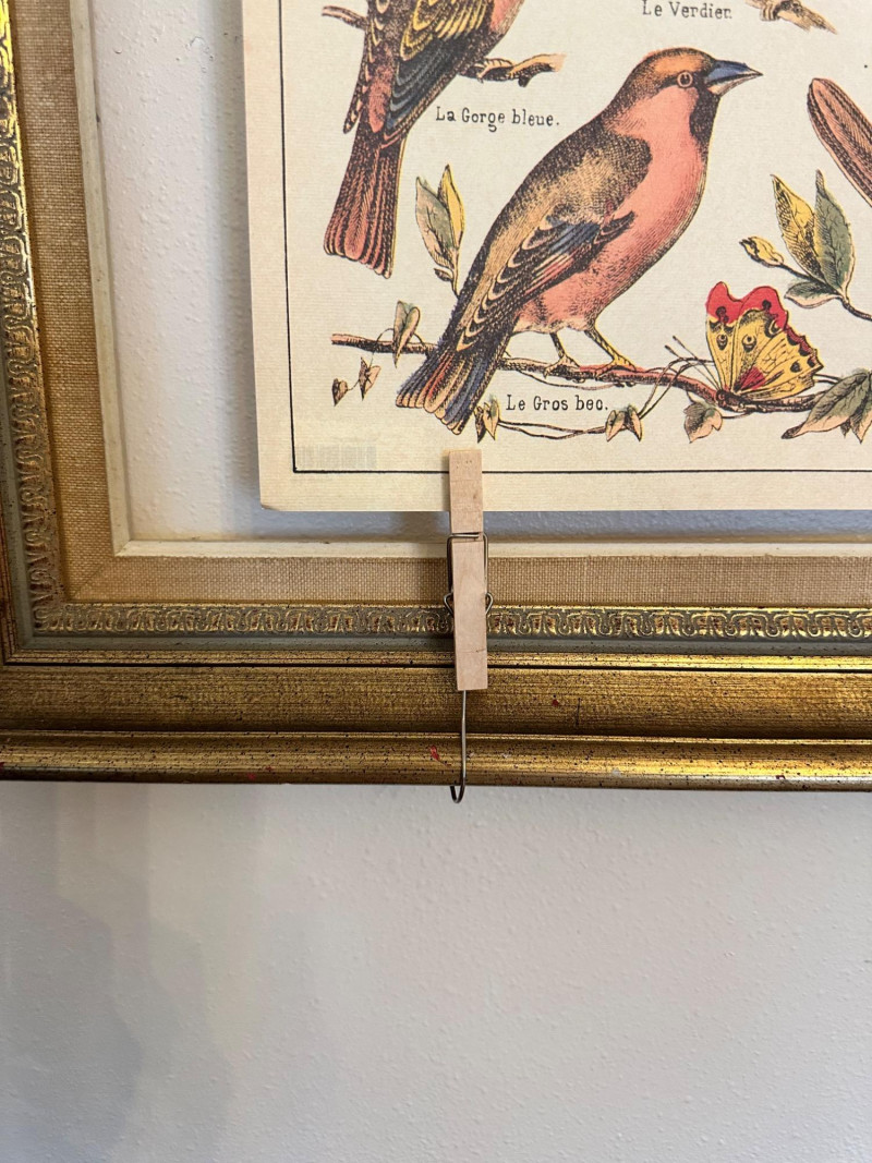 Framed Foraging & Bird Natural History Prints Pair of vintage-style natural history prints displayed in clip-mounted wood frames. One print, titled Foraging: Plants and Mushrooms, features detailed illustrations of edible mushrooms, herbs, and plants, labeled with names such as Chanterelle, Slippery Jack, and Wild Strawberry. The second print, Nos Bons Petits Oiseaux, depicts a variety of European songbirds with French labels, including Le Rouge-Gorge and La Mésange Bleue. Both are printed on aged-look paper and framed under glass with metal hanging chains. Measurements: