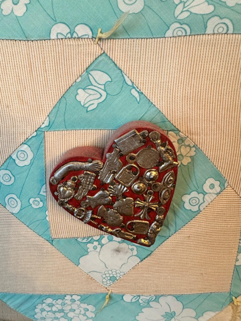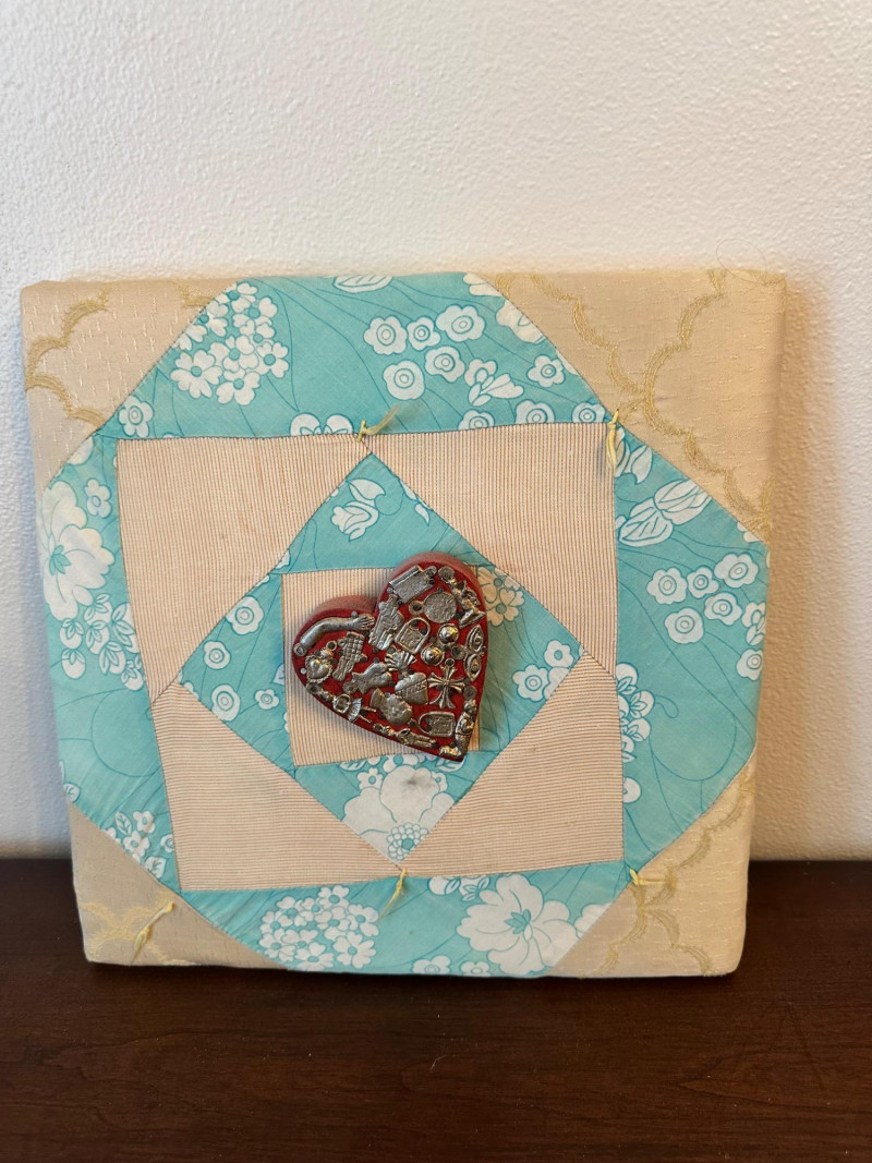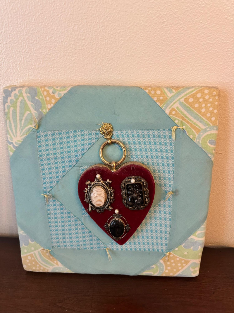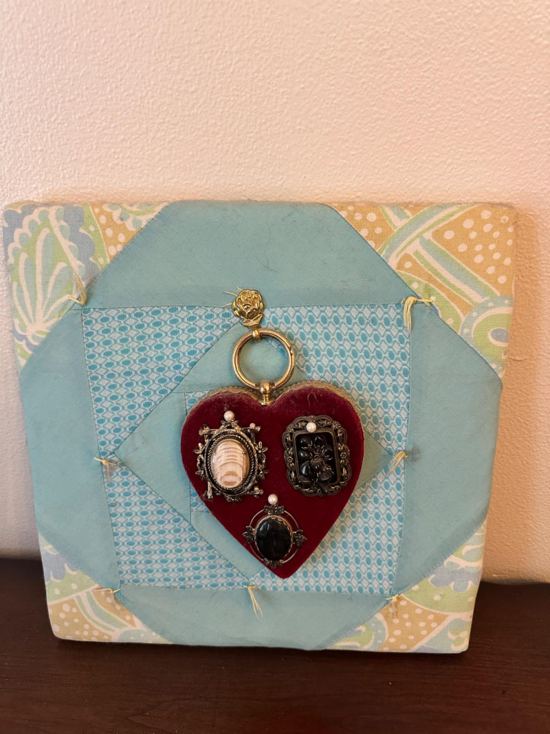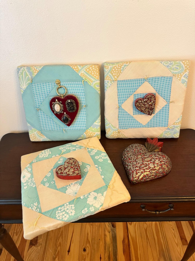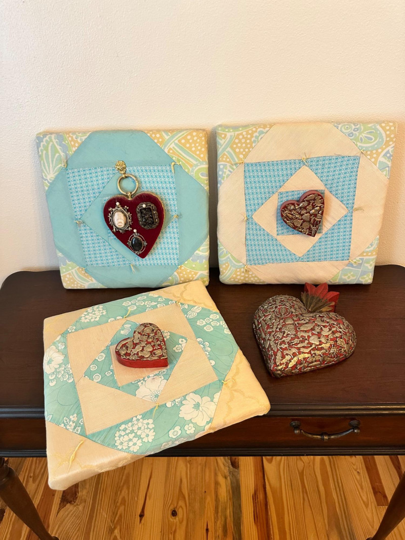 Framed Quilted Heart Assemblage A set of three quilted fabric-mounted heart assemblages. Each frame features a geometric textile pattern and a unique heart centerpiece. Two of the hearts are embellished with metallic milagro-style charms, and one is adorned with vintage cameo brooches on a red velvet heart. Measurements: