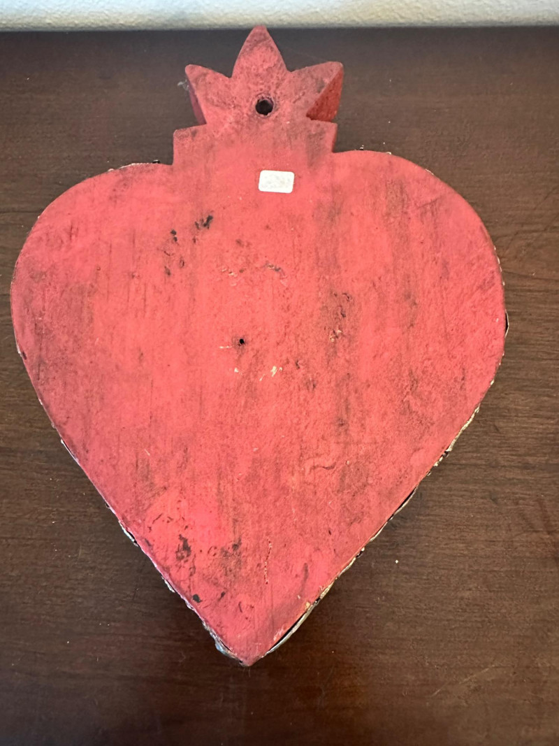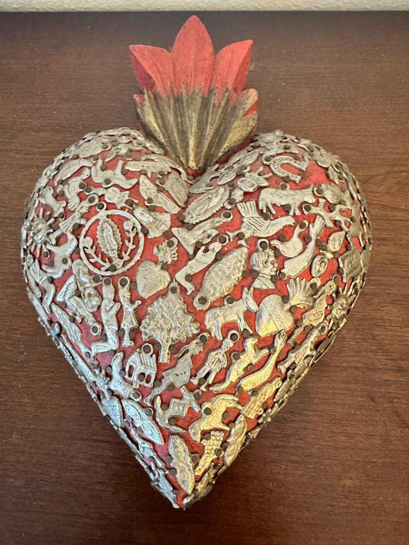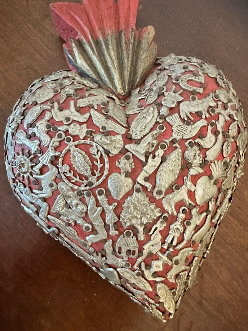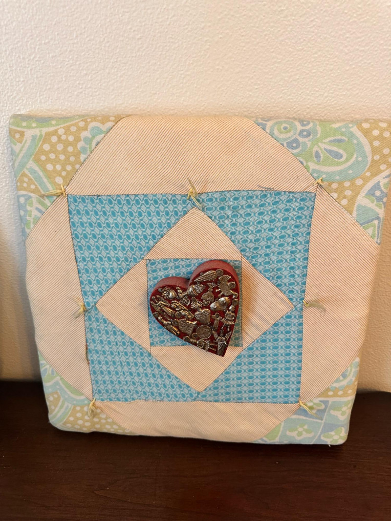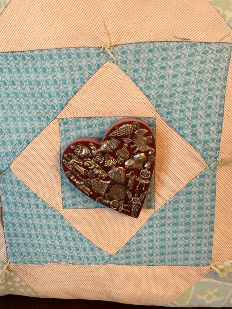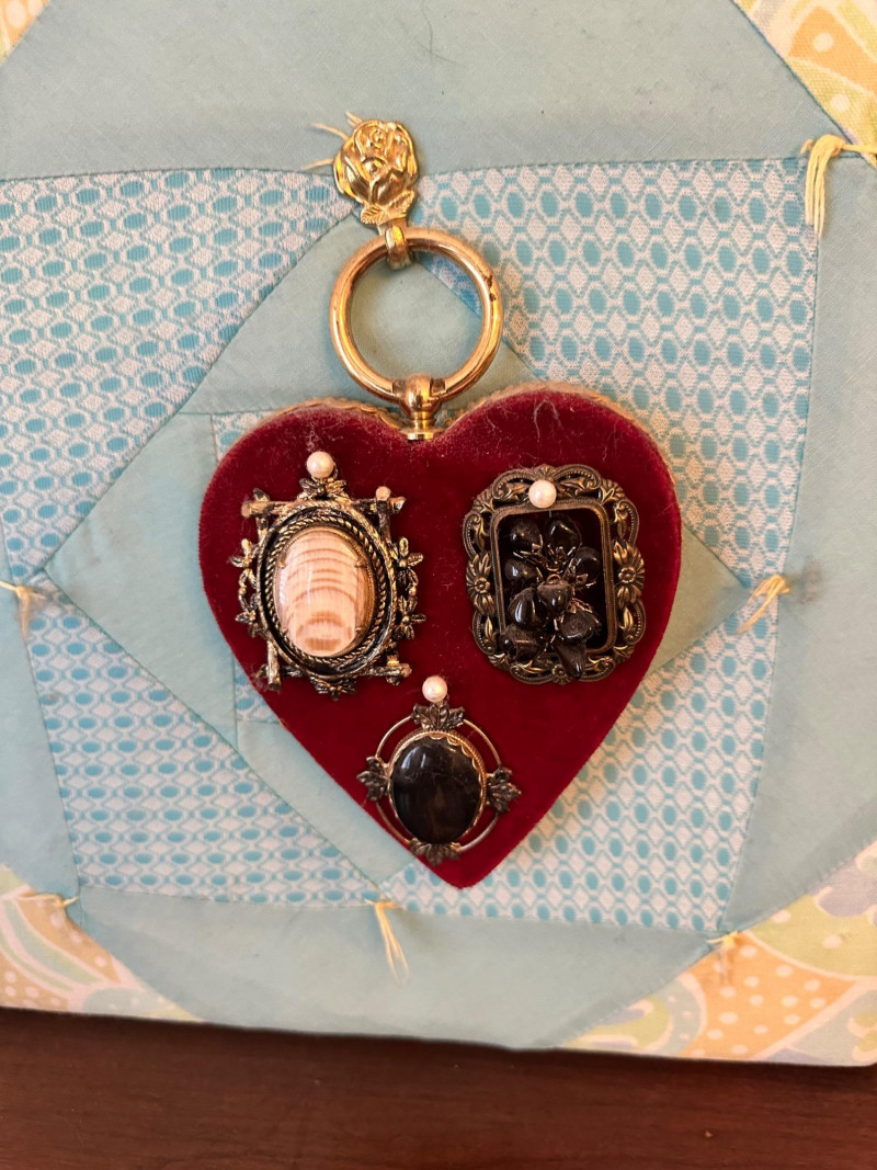 Framed Quilted Heart Assemblage A set of three quilted fabric-mounted heart assemblages. Each frame features a geometric textile pattern and a unique heart centerpiece. Two of the hearts are embellished with metallic milagro-style charms, and one is adorned with vintage cameo brooches on a red velvet heart. Measurements: