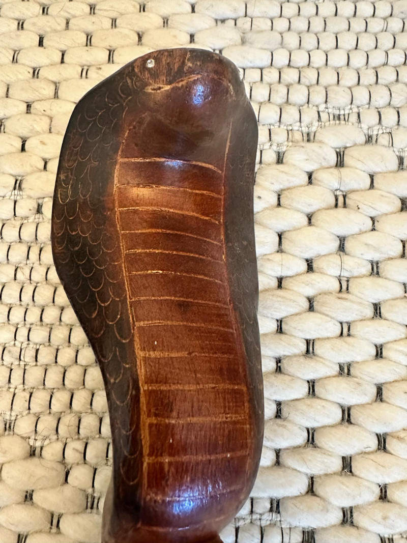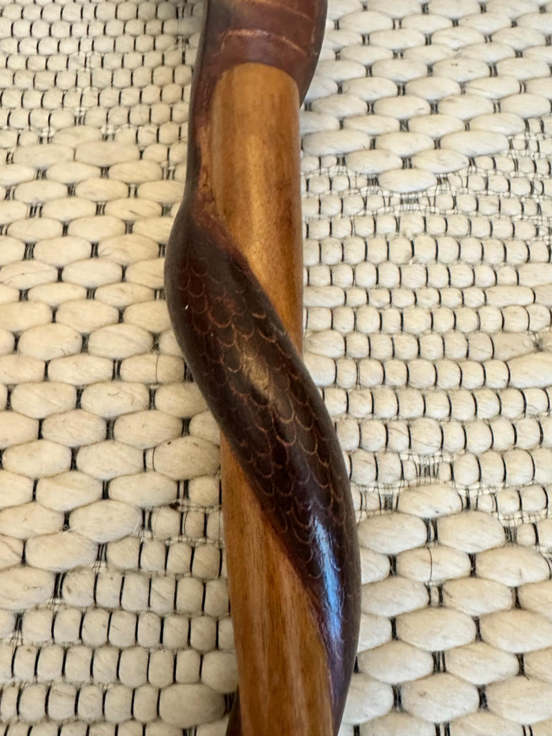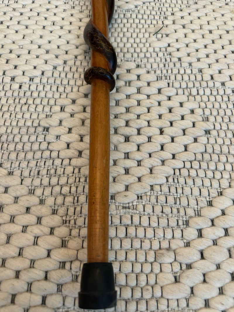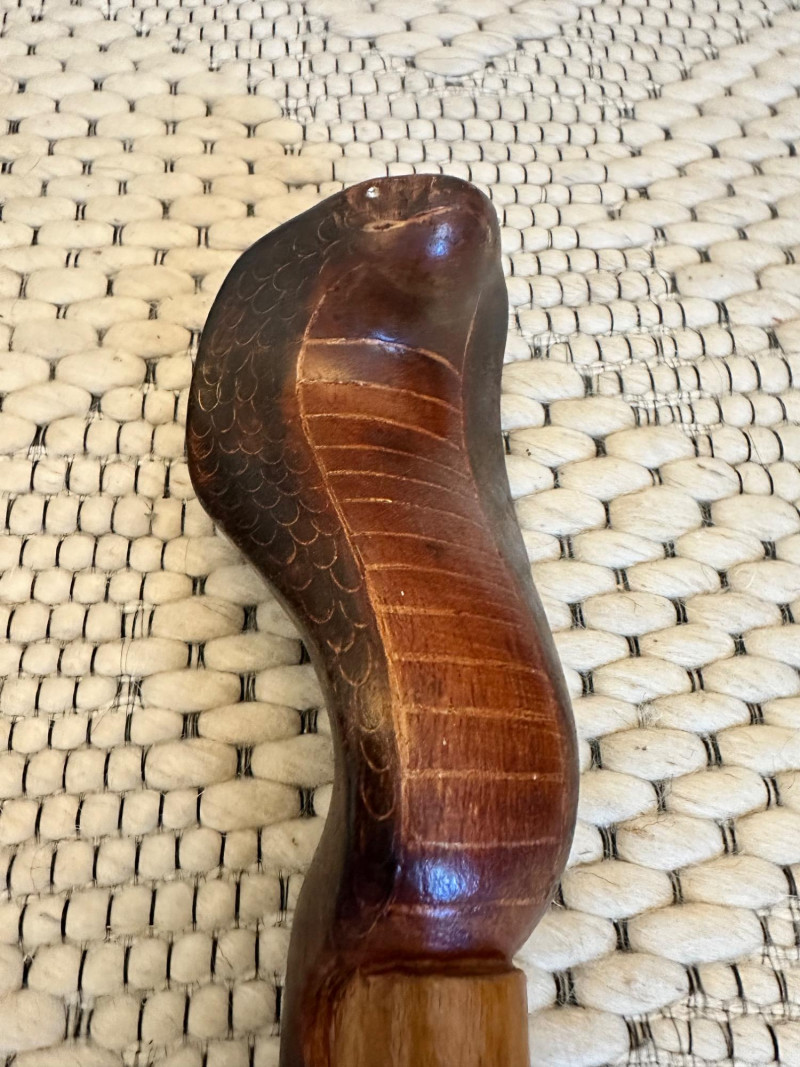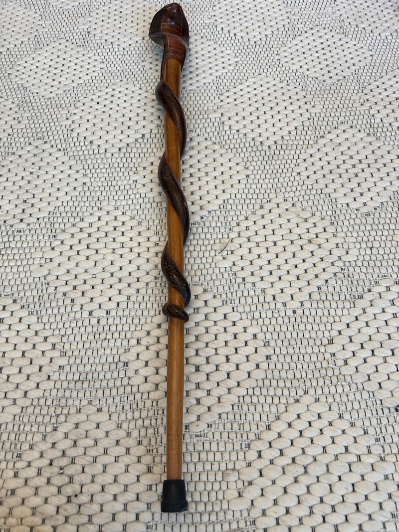 Carved Cobra Cane – 37" Wooden walking cane featuring a hand-carved cobra design coiled around the shaft. The cobra's head forms the handle, complete with detailed scale patterns and painted eyes. The carved serpent spirals down the shaft, giving the appearance of it wrapping around the cane. Finished with a black rubber tip for grip. Measurements: