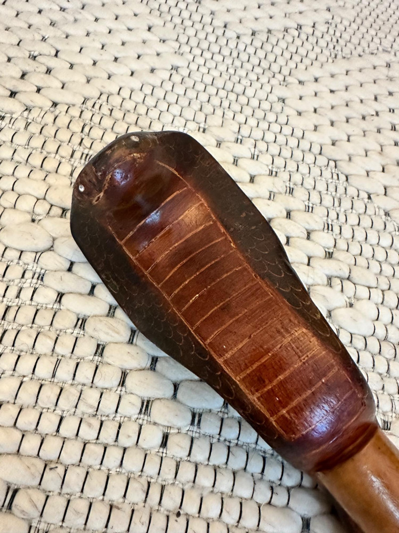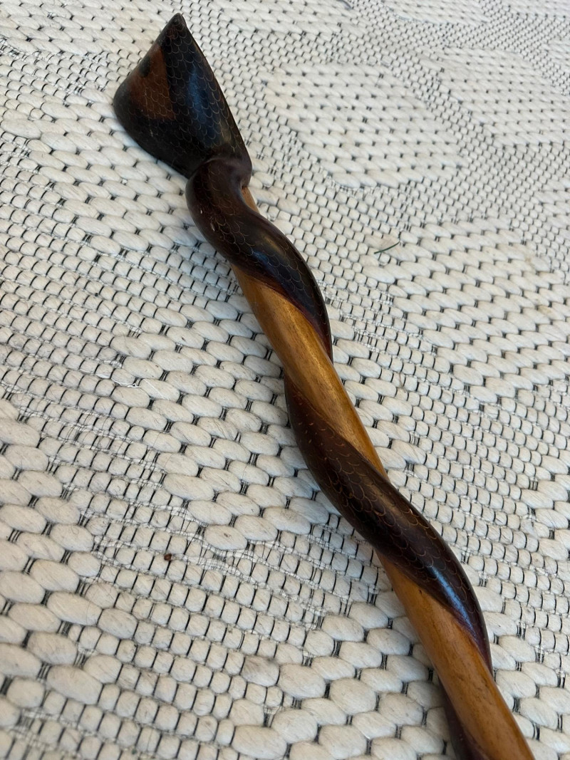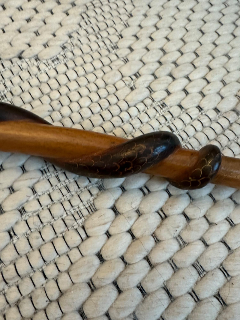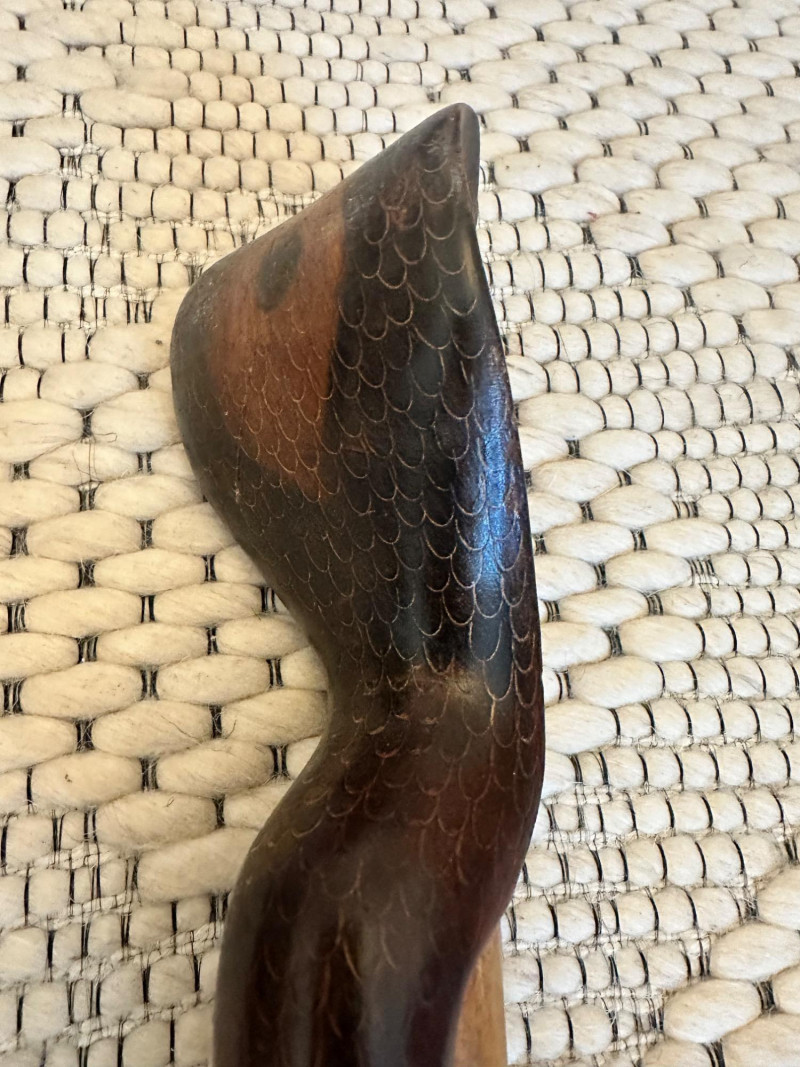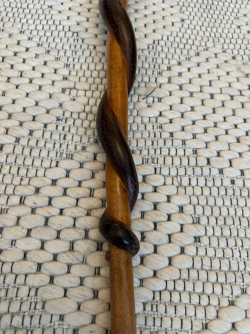 Carved Cobra Cane – 37" Wooden walking cane featuring a hand-carved cobra design coiled around the shaft. The cobra's head forms the handle, complete with detailed scale patterns and painted eyes. The carved serpent spirals down the shaft, giving the appearance of it wrapping around the cane. Finished with a black rubber tip for grip. Measurements: