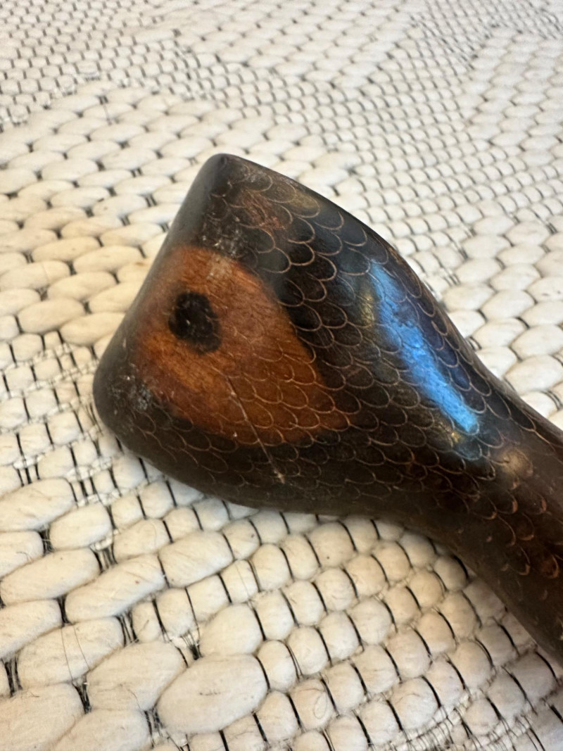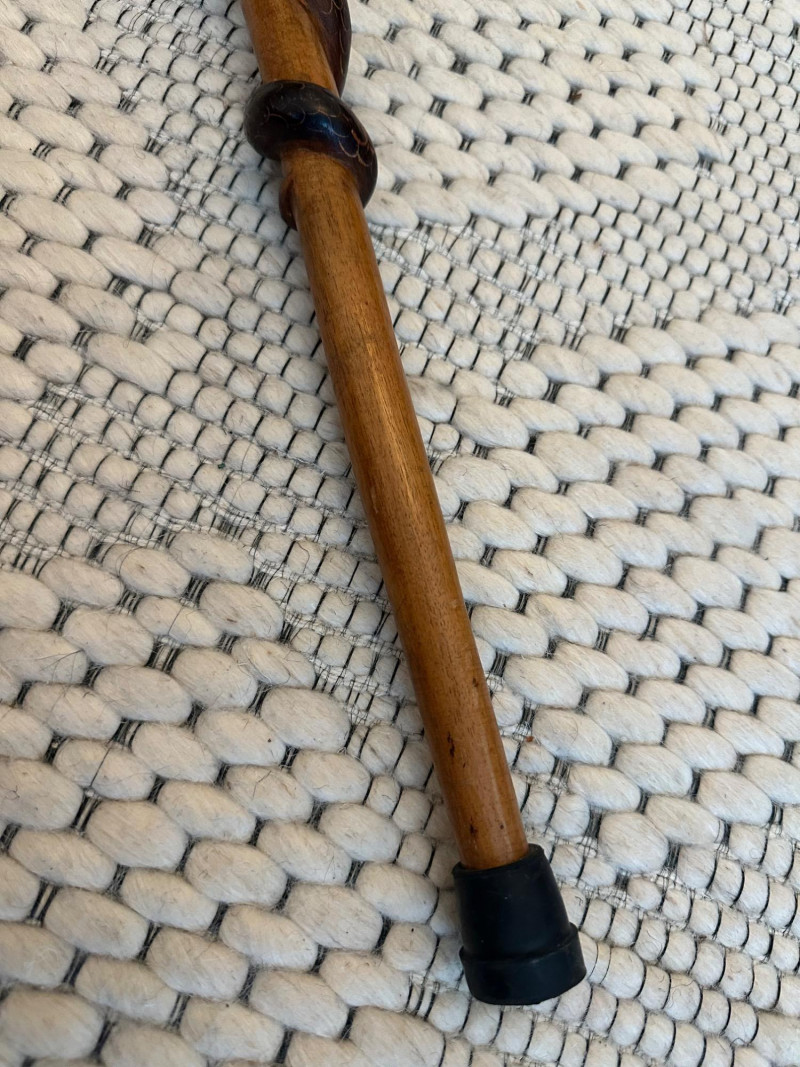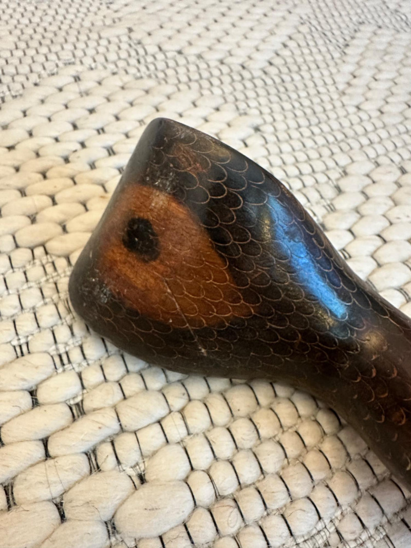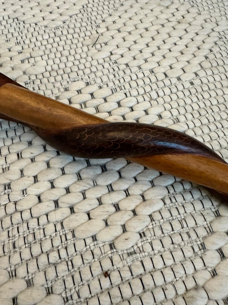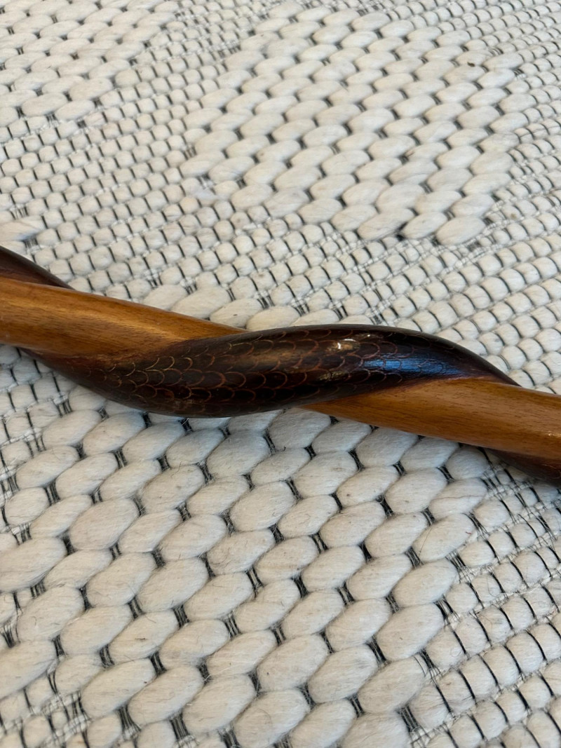 Carved Cobra Cane – 37" Wooden walking cane featuring a hand-carved cobra design coiled around the shaft. The cobra's head forms the handle, complete with detailed scale patterns and painted eyes. The carved serpent spirals down the shaft, giving the appearance of it wrapping around the cane. Finished with a black rubber tip for grip. Measurements:
