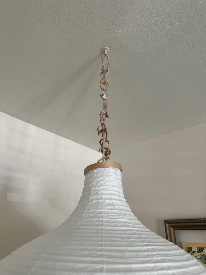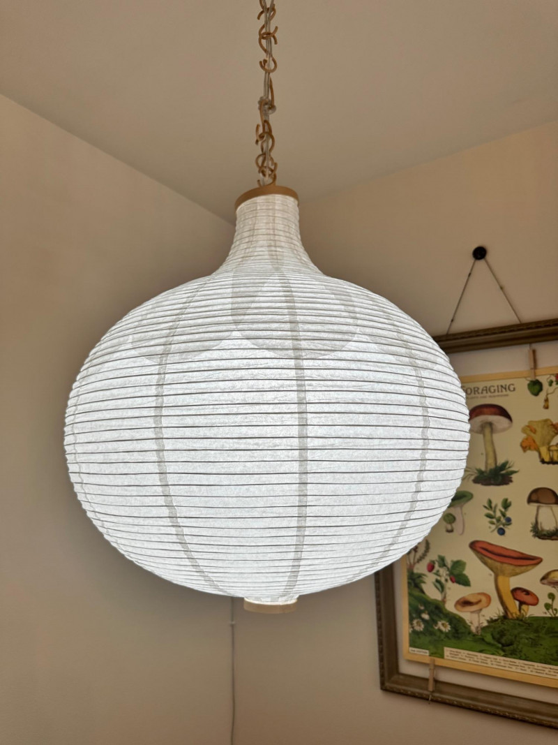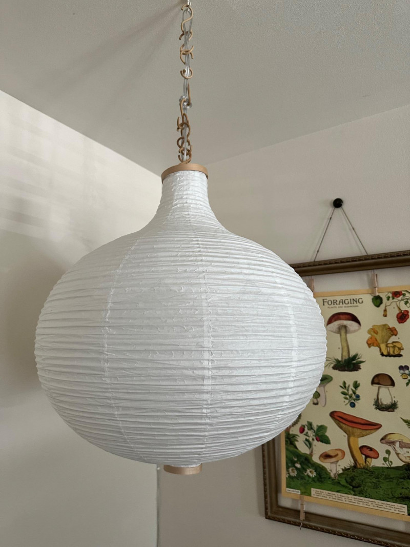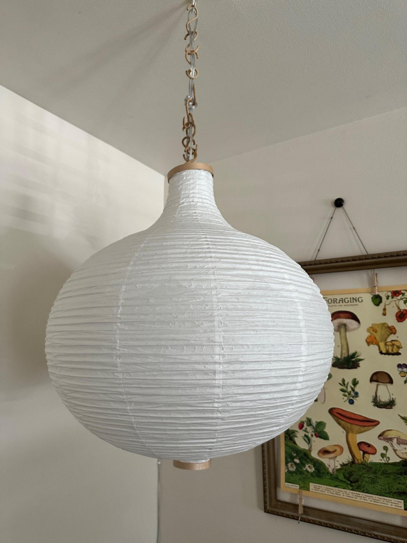 Rice Paper Lantern Lamp – 24" Tall Ceiling-mounted lantern lamp with a rounded rice paper shade and vertical ribbing. Suspended by a linked metal chain, the lamp features reinforced top and bottom openings and emits soft ambient light through the translucent paper material. Measurements: