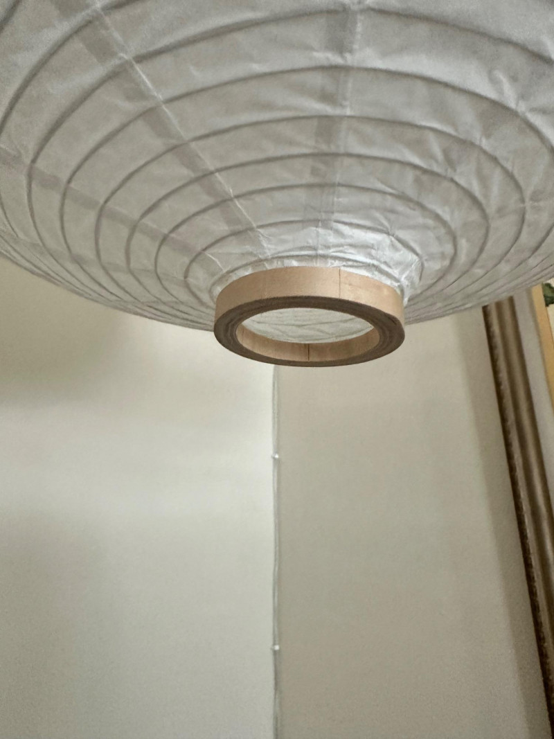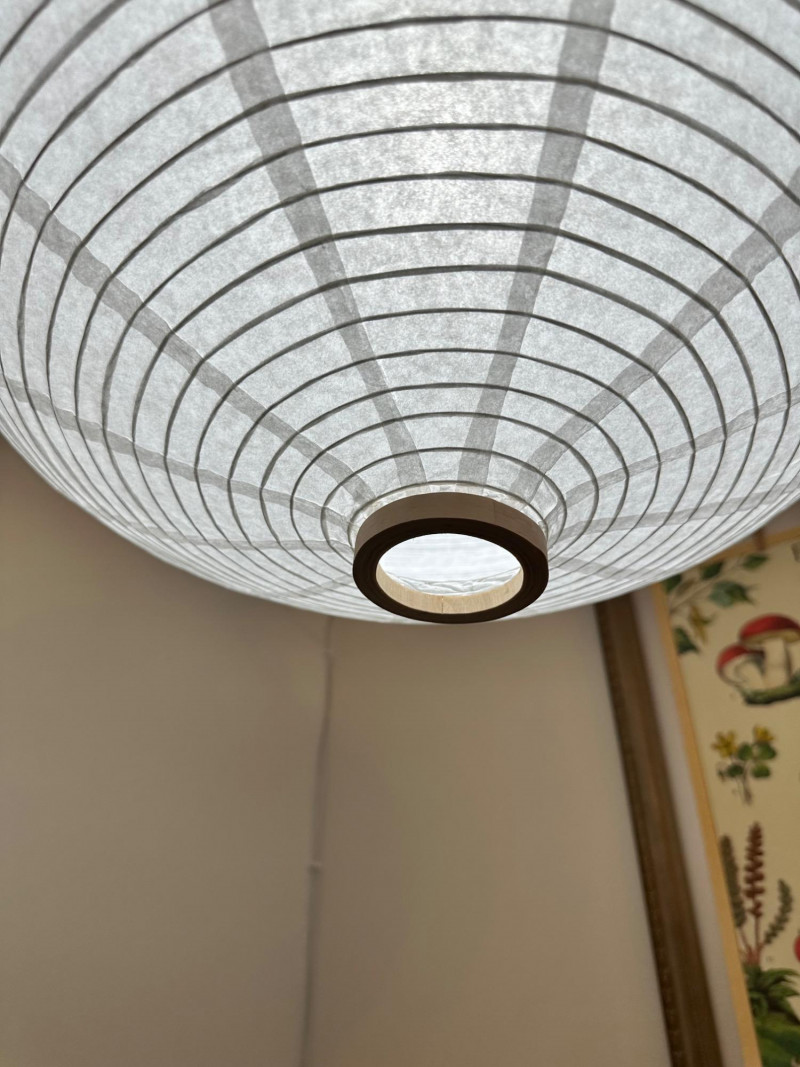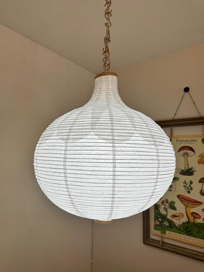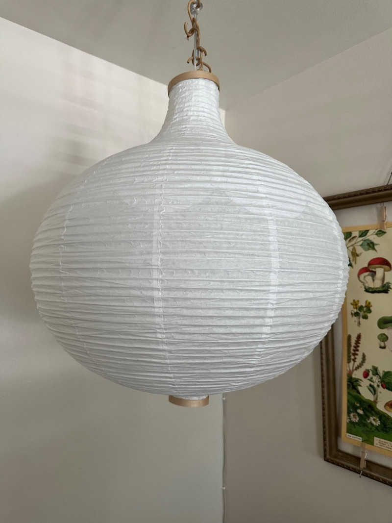 Rice Paper Lantern Lamp – 24" Tall Ceiling-mounted lantern lamp with a rounded rice paper shade and vertical ribbing. Suspended by a linked metal chain, the lamp features reinforced top and bottom openings and emits soft ambient light through the translucent paper material. Measurements: