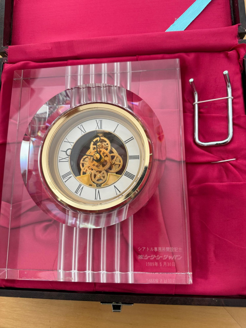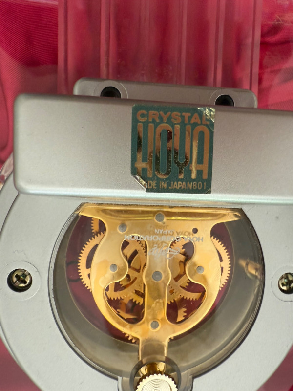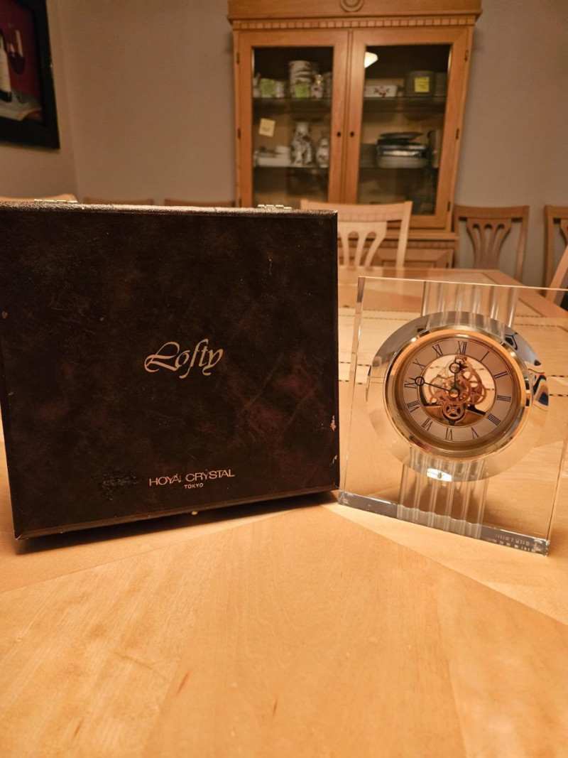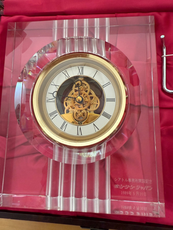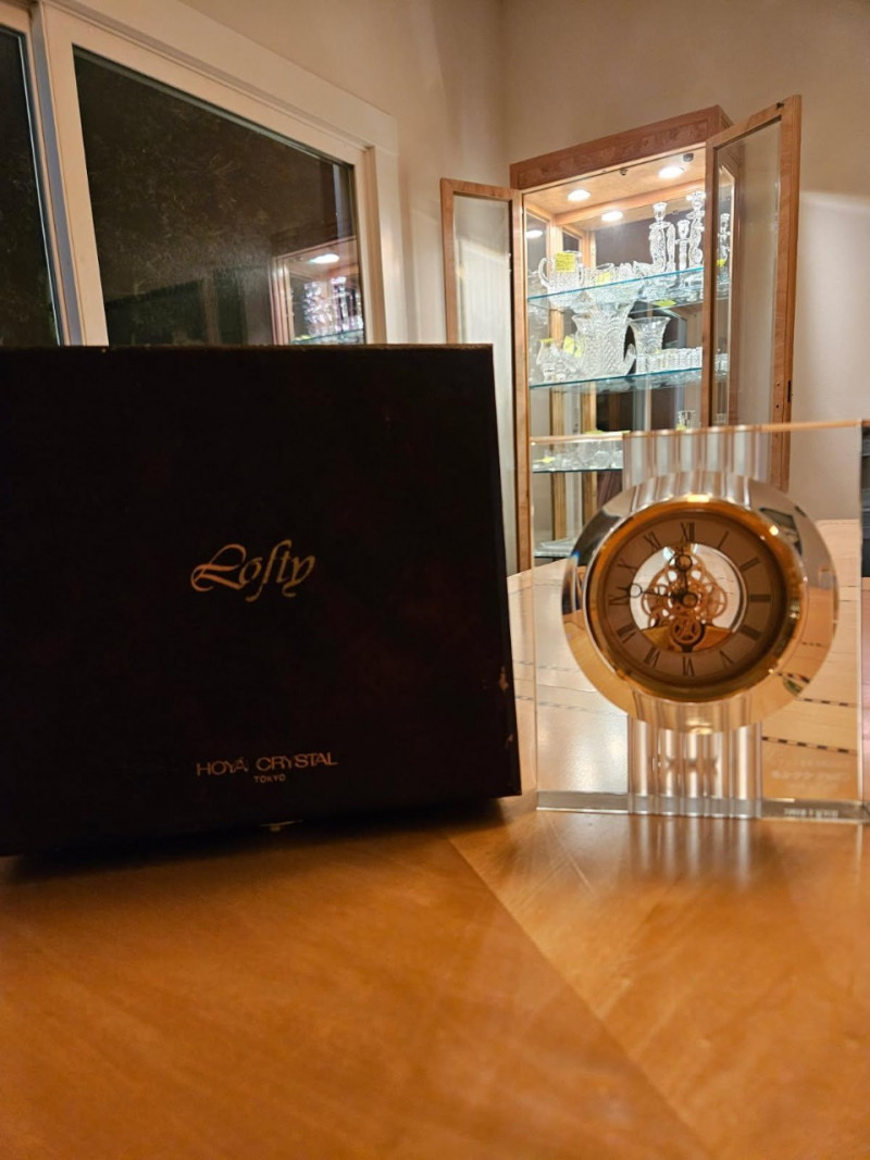 Hoya Crystal Clock in Original Box – Highly Collectible Mechanical desk clock encased in clear crystal with visible skeleton movement. Roman numeral dial with gold-tone bezel. Inscription on the lower right marks it as a commemorative piece for the opening of the Seattle office by CGC Japan, dated May 30, 1989. Includes original Lofty branded box labeled “Hoya Crystal Tokyo.” Clock is in like new condition. Dimensions: