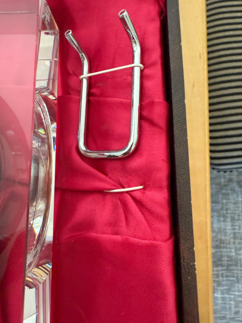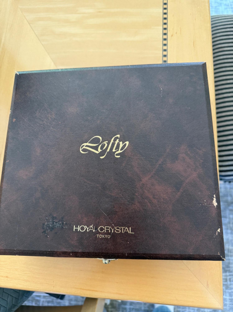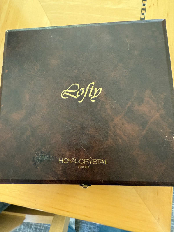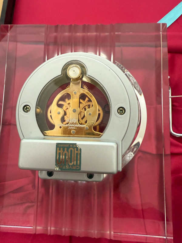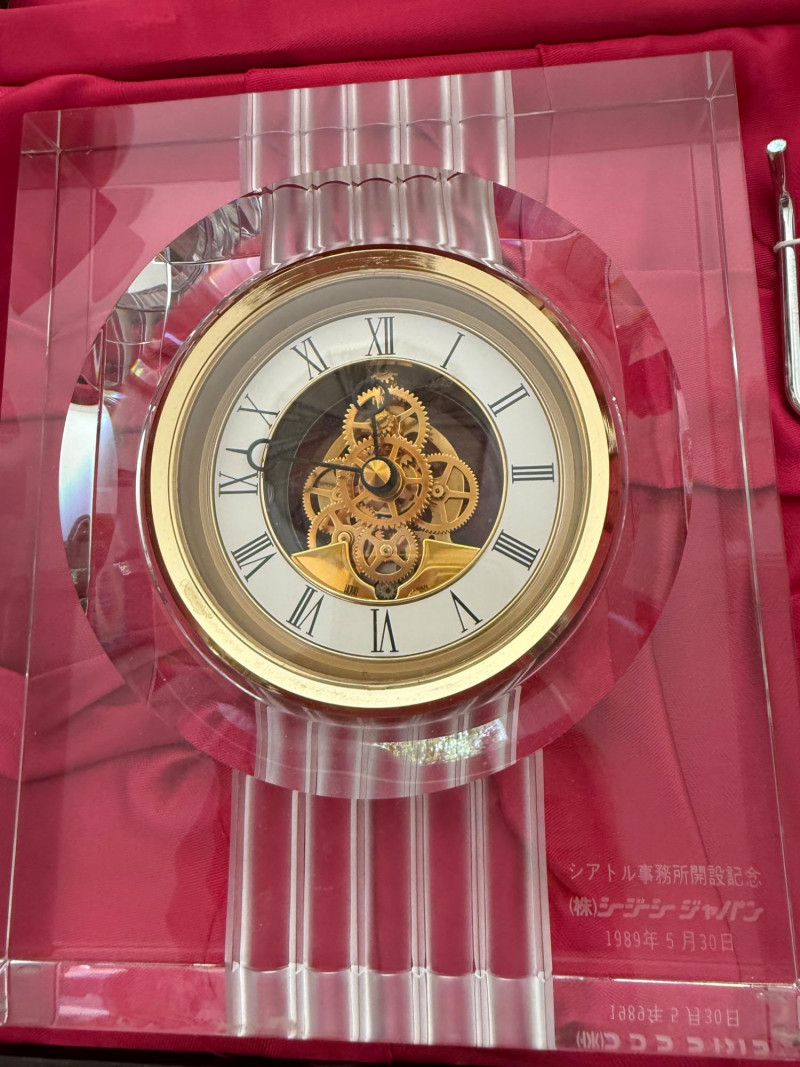 Hoya Crystal Clock in Original Box – Highly Collectible Mechanical desk clock encased in clear crystal with visible skeleton movement. Roman numeral dial with gold-tone bezel. Inscription on the lower right marks it as a commemorative piece for the opening of the Seattle office by CGC Japan, dated May 30, 1989. Includes original Lofty branded box labeled “Hoya Crystal Tokyo.” Clock is in like new condition. Dimensions: