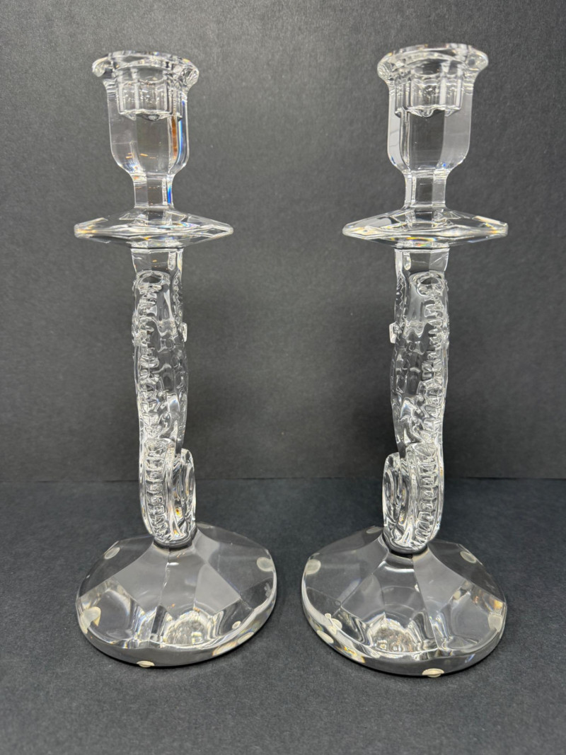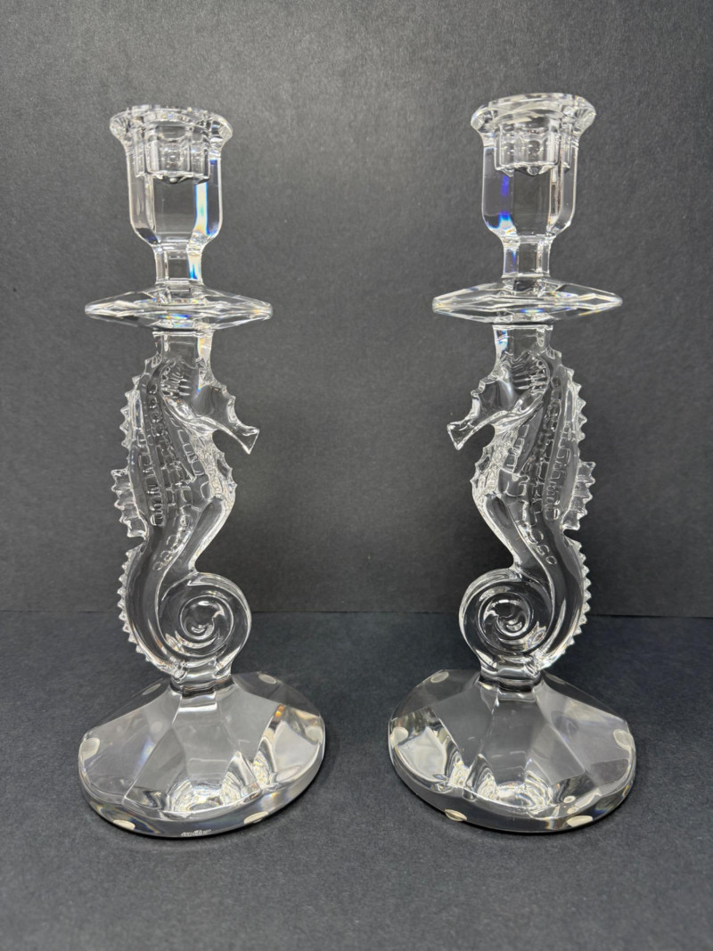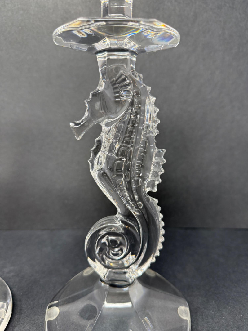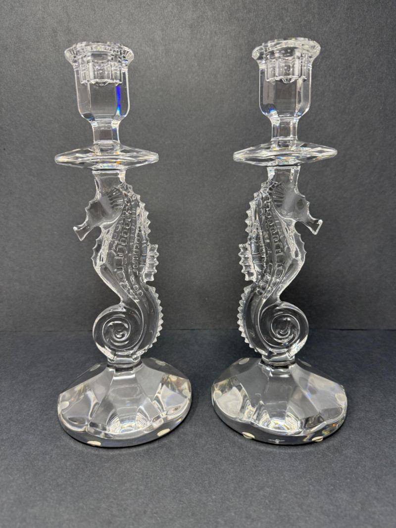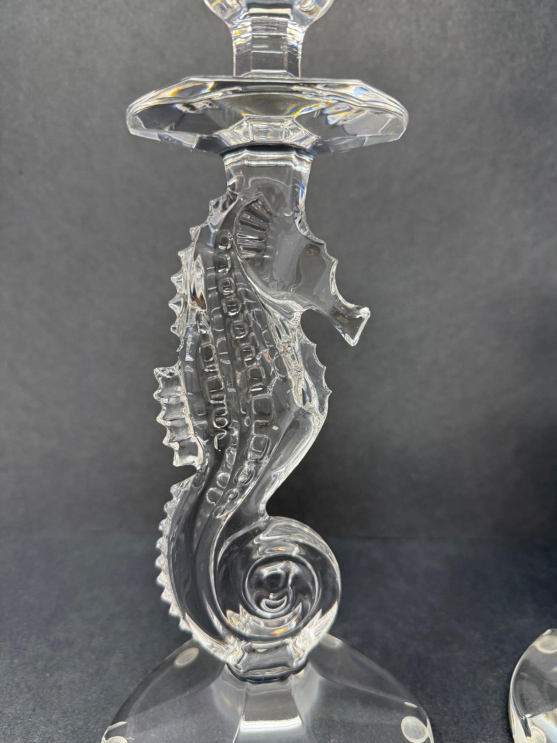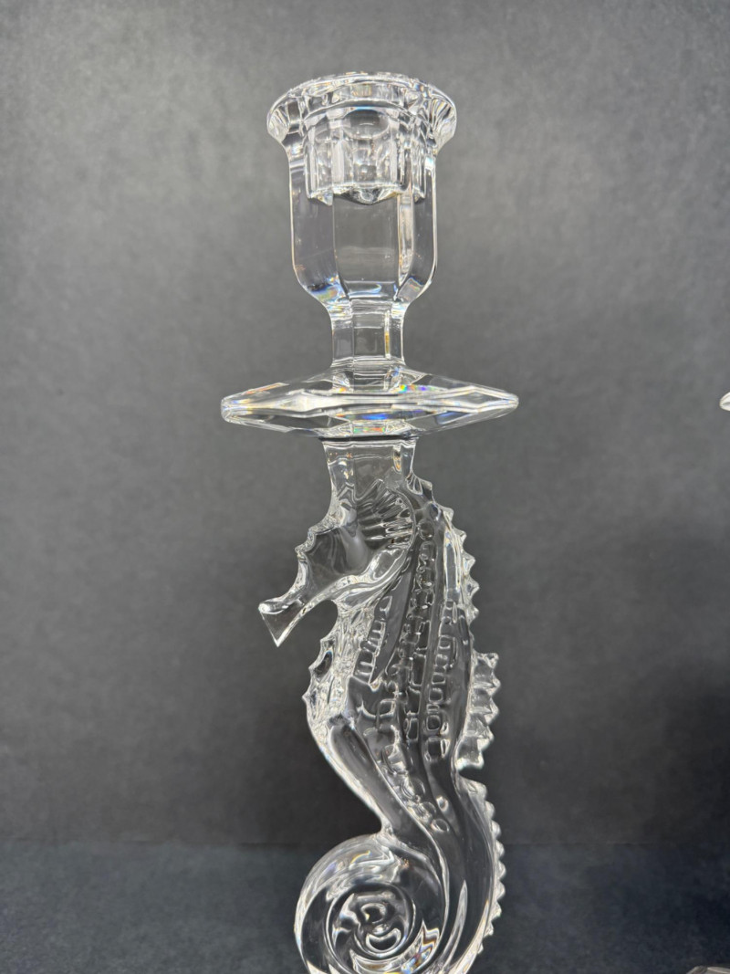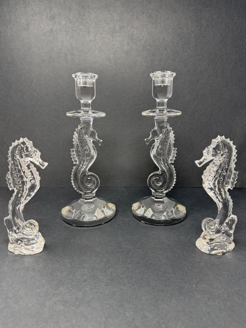 Waterford Seahorse Candlestick Holders and Figurines – Set of 4 Set of four clear crystal pieces featuring Waterford's seahorse motif, including: Two candlestick holders, each formed with a central seahorse figure and faceted base. Two standalone seahorse figurines with matching detailing and molded bases. Measurements: Candlestick holders: 11.5" height x 4.5" diameter Seahorse figurines: 7.25" height x 2.5" length x 1.5" width