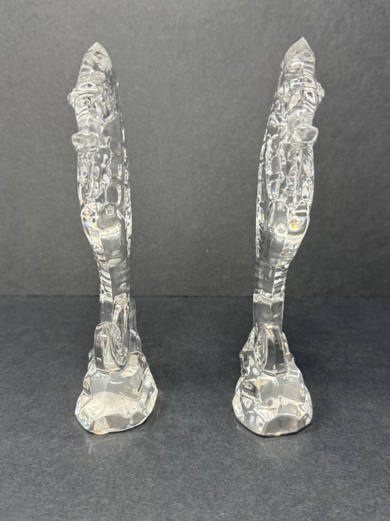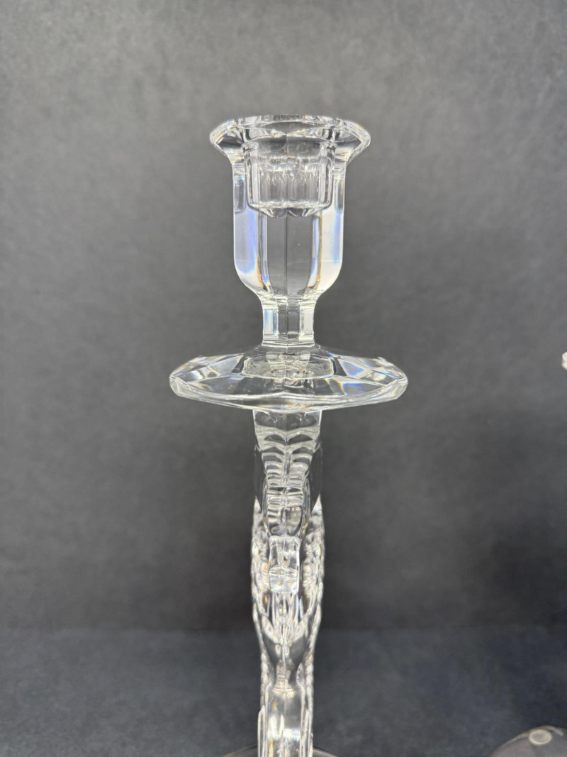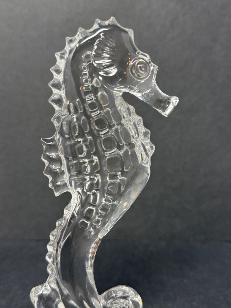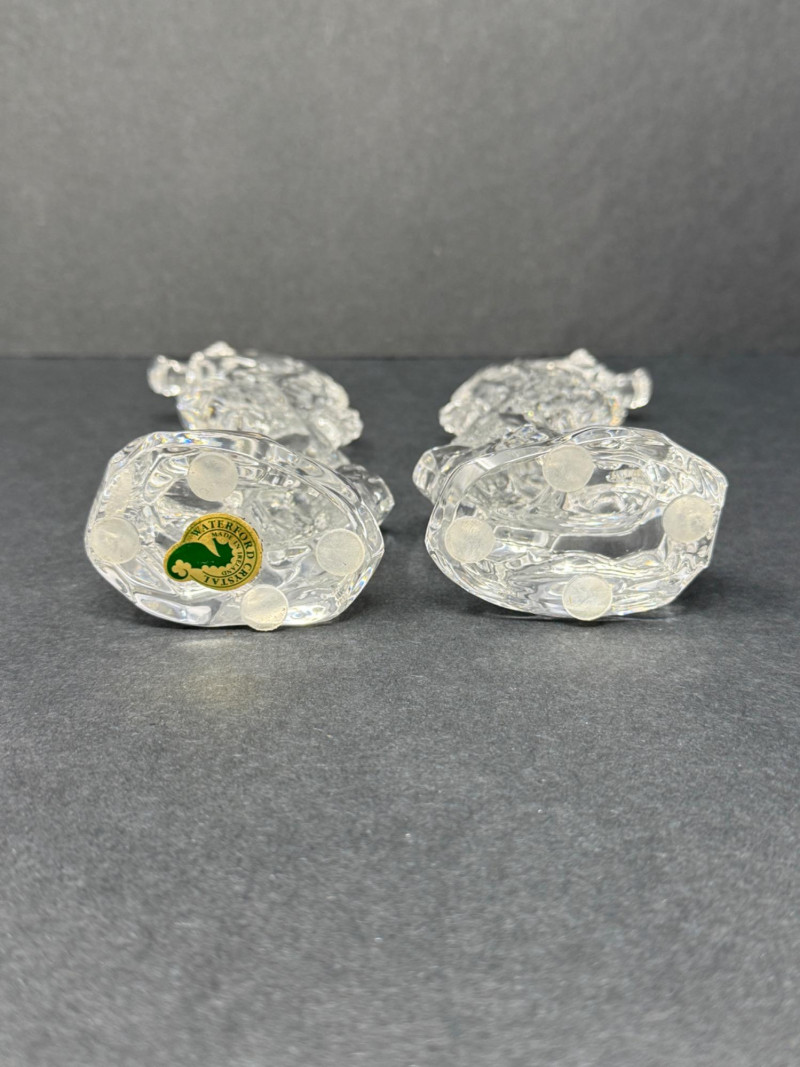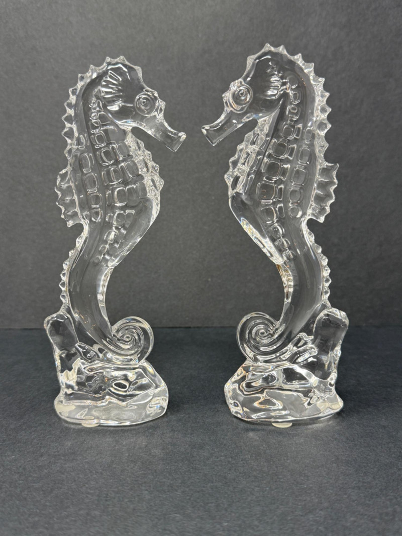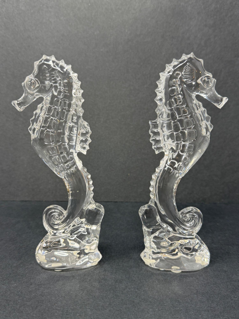 Waterford Seahorse Candlestick Holders and Figurines – Set of 4 Set of four clear crystal pieces featuring Waterford's seahorse motif, including: Two candlestick holders, each formed with a central seahorse figure and faceted base. Two standalone seahorse figurines with matching detailing and molded bases. Measurements: Candlestick holders: 11.5" height x 4.5" diameter Seahorse figurines: 7.25" height x 2.5" length x 1.5" width