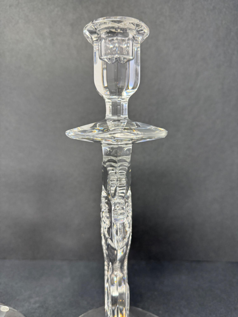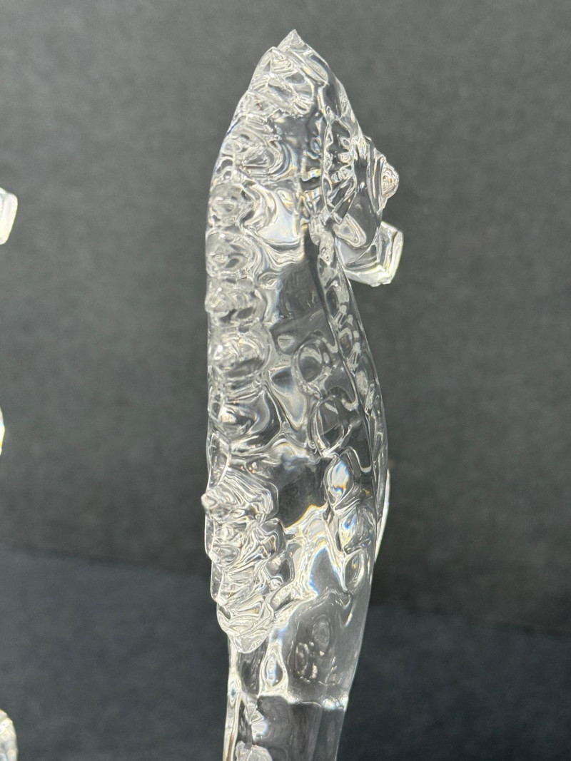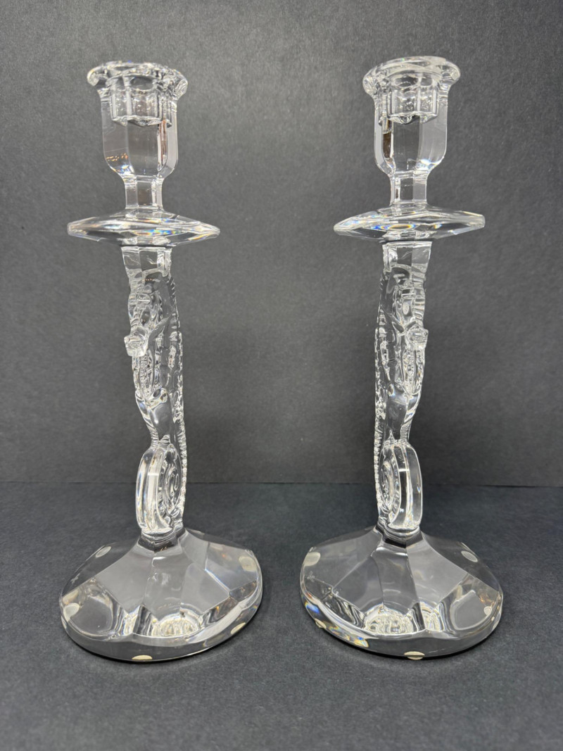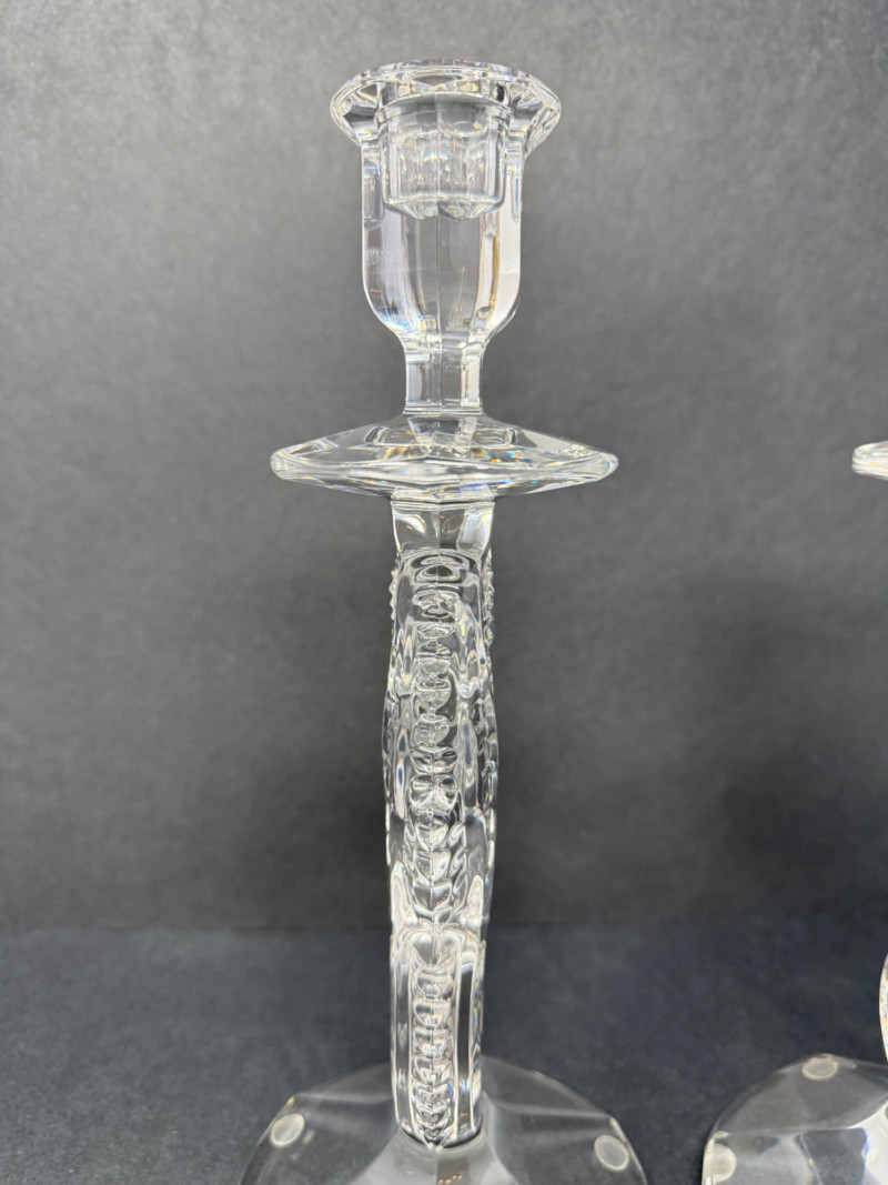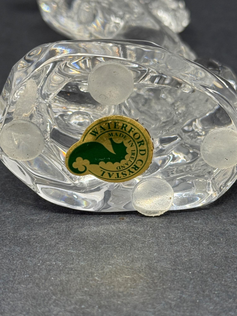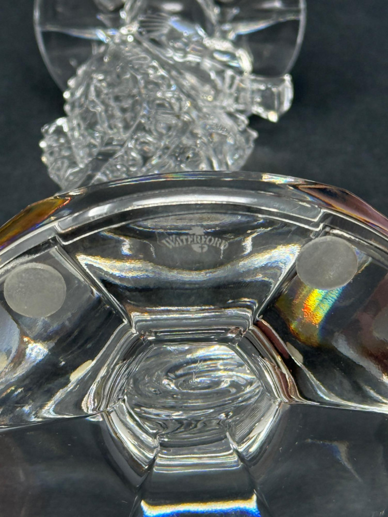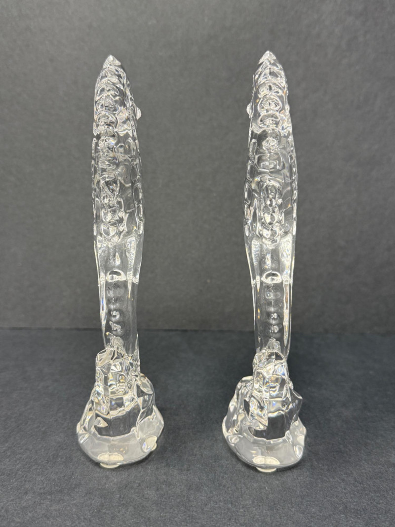 Waterford Seahorse Candlestick Holders and Figurines – Set of 4 Set of four clear crystal pieces featuring Waterford's seahorse motif, including: Two candlestick holders, each formed with a central seahorse figure and faceted base. Two standalone seahorse figurines with matching detailing and molded bases. Measurements: Candlestick holders: 11.5" height x 4.5" diameter Seahorse figurines: 7.25" height x 2.5" length x 1.5" width