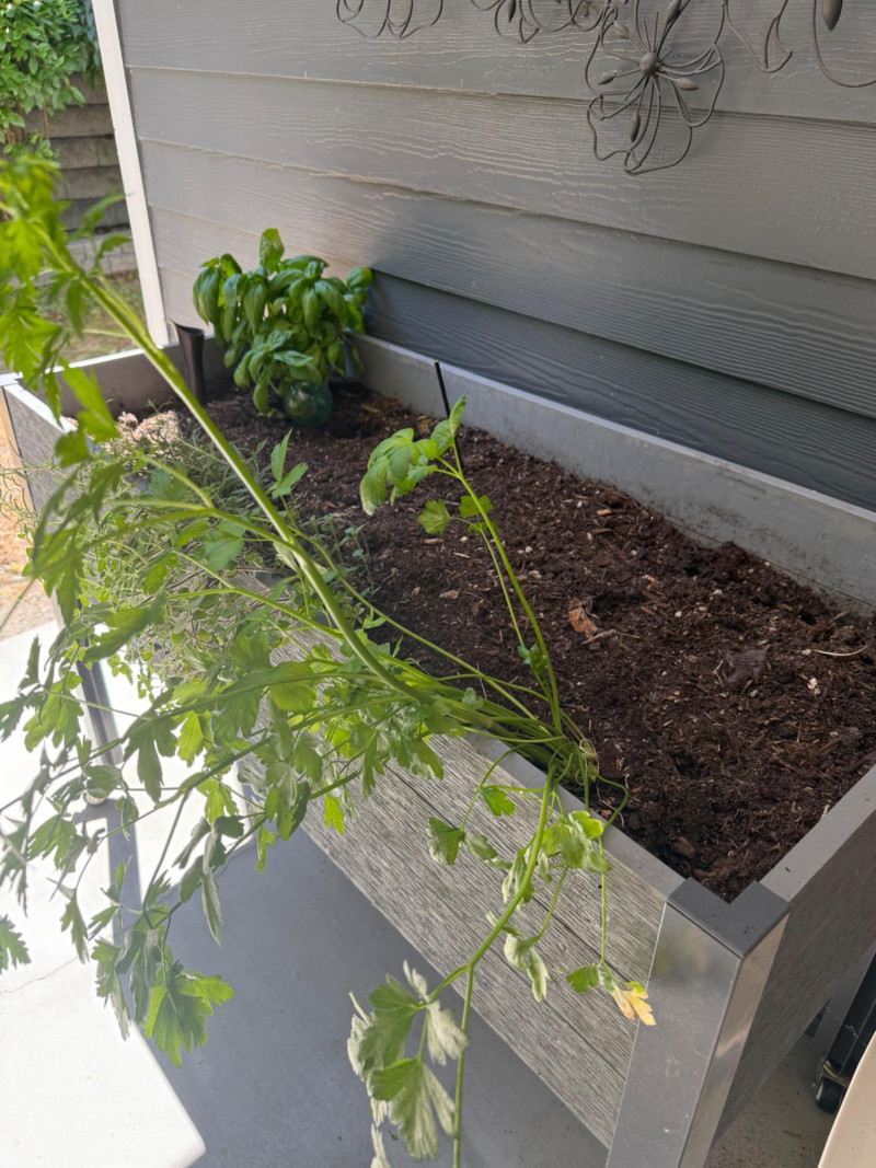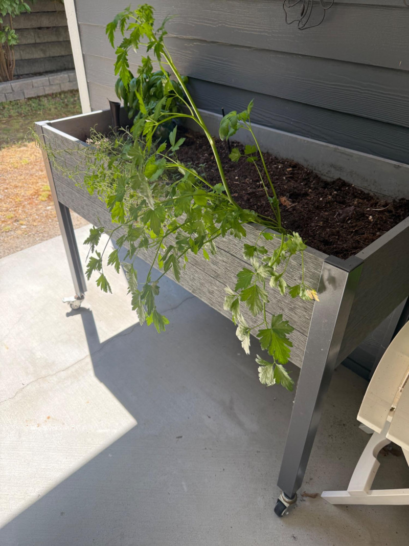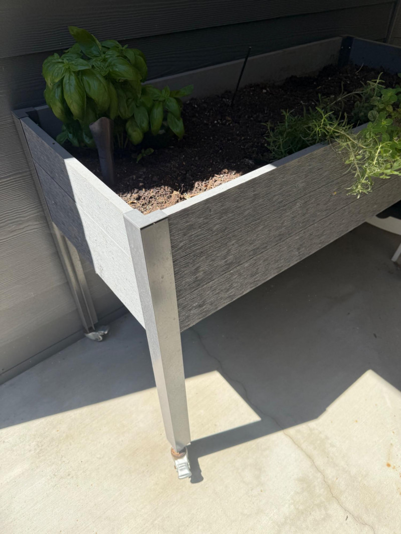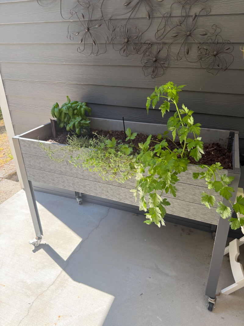 Portable Rolling Herb Planter Box – Herbs Included Elevated rectangular planter on wheels with metal frame and wood-style paneling. Includes planted herbs: visible basil, parsley, and dill. Suitable for patios or balconies. Box has drainage and ample soil depth for herb growth. Measurements: