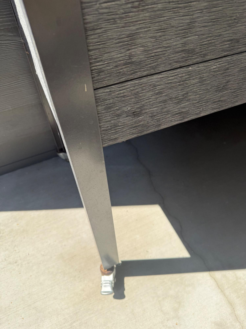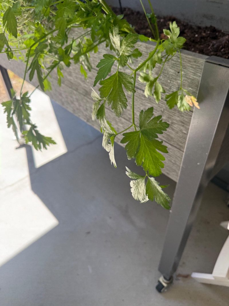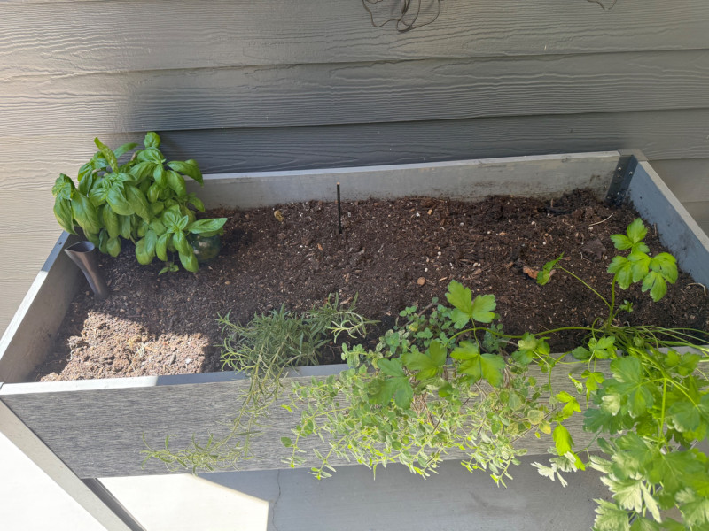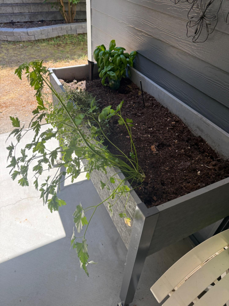 Portable Rolling Herb Planter Box – Herbs Included Elevated rectangular planter on wheels with metal frame and wood-style paneling. Includes planted herbs: visible basil, parsley, and dill. Suitable for patios or balconies. Box has drainage and ample soil depth for herb growth. Measurements: