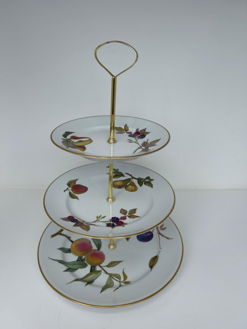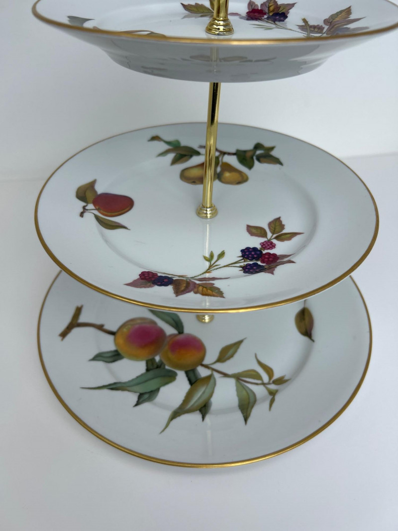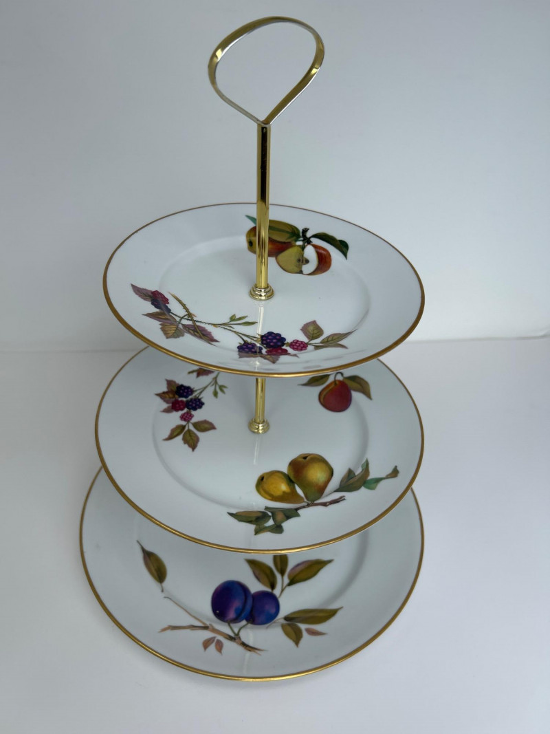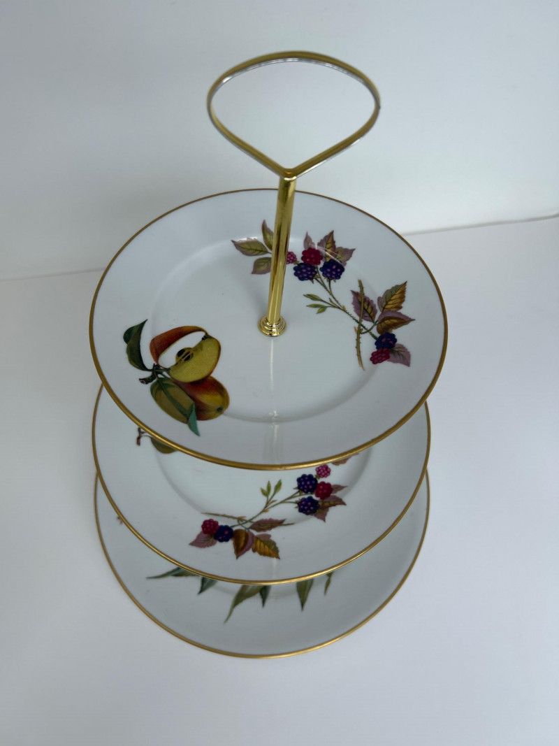 Royal Worcester Evesham Gold Three-Tier Porcelain Cake Stand Three-tiered cake stand made of fine porcelain by Royal Worcester in the Evesham Gold pattern. Features fruit motif on each tier with gold trim and a central gold-tone metal handle. Pattern: Evesham Gold Material: Fine porcelain Tiers: 3 Total height: 14.5" Fruit designs vary per plate Gold-tone metal handle with loop grip Condition: