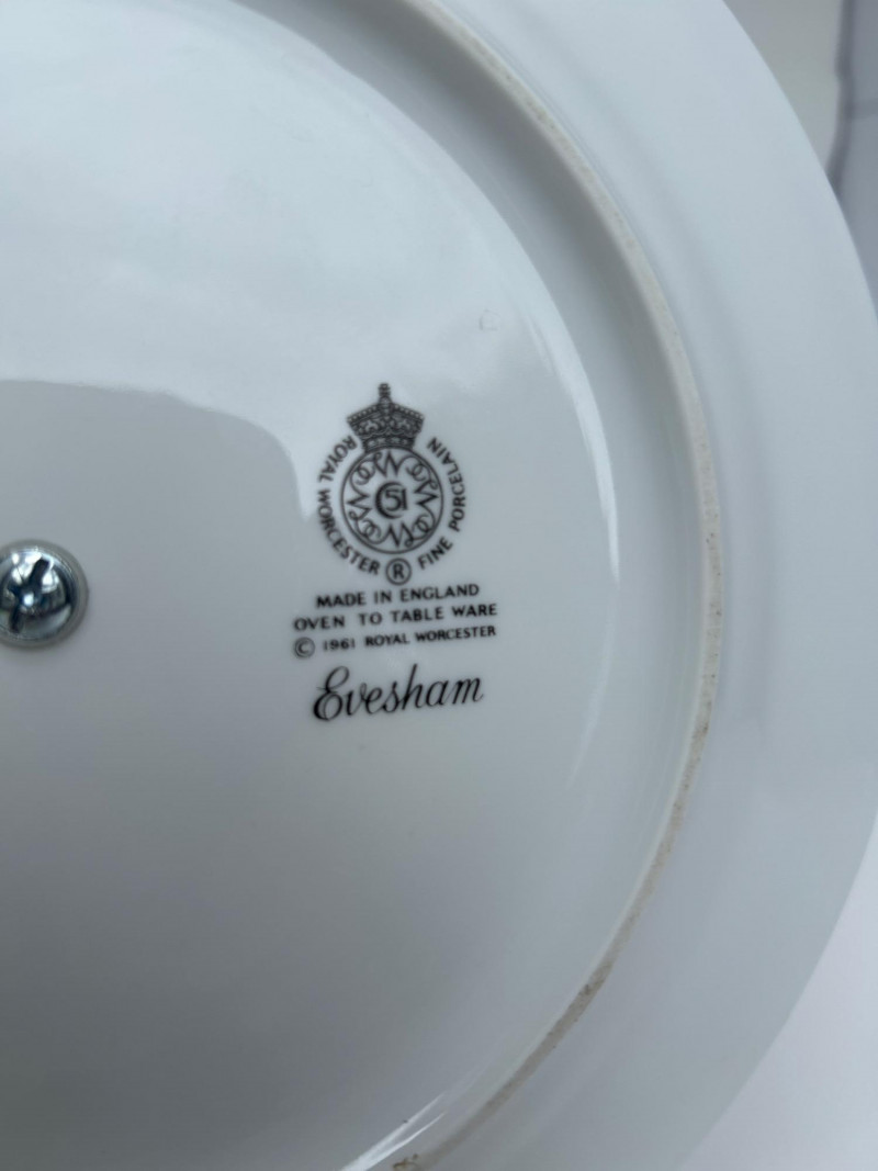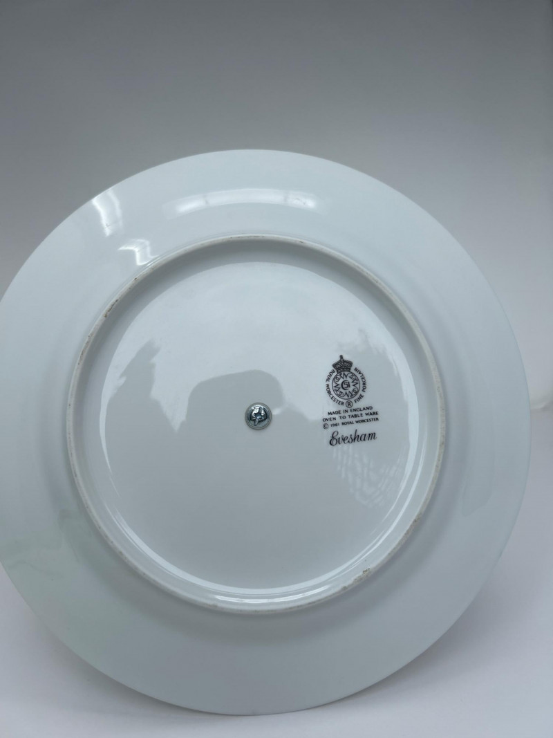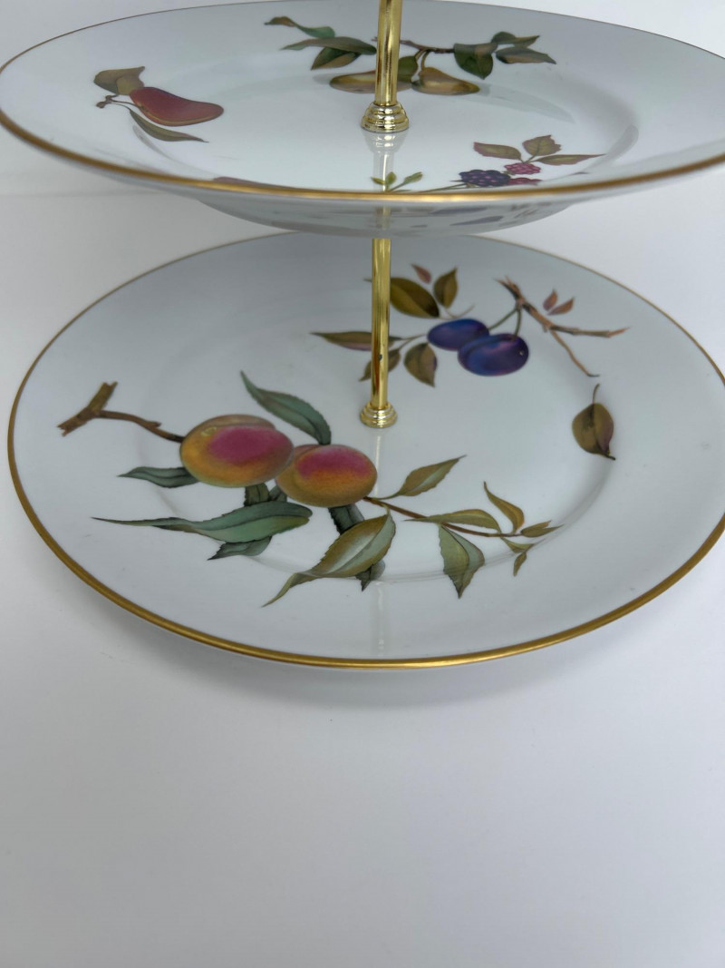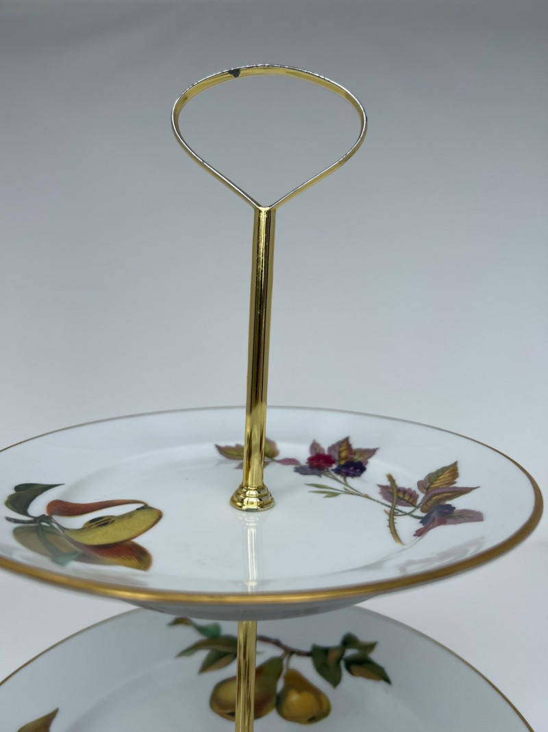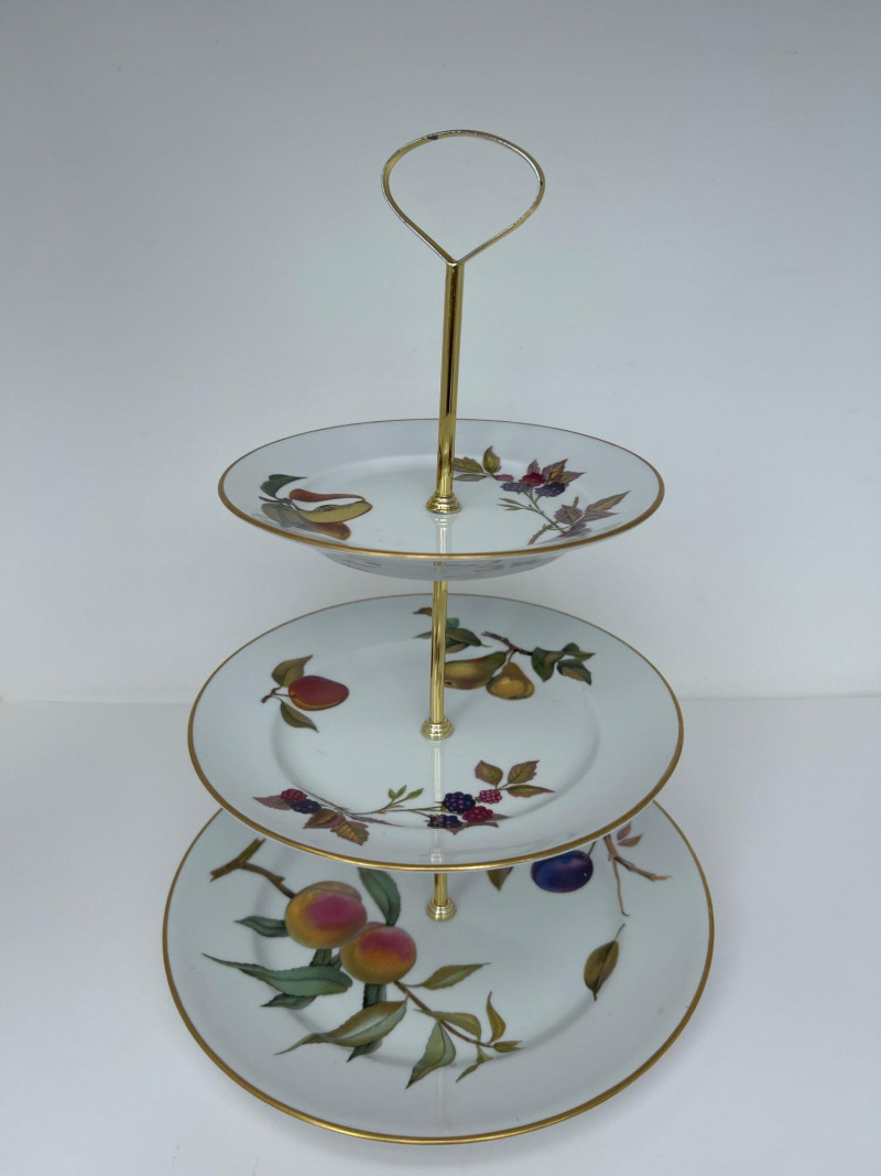 Royal Worcester Evesham Gold Three-Tier Porcelain Cake Stand Three-tiered cake stand made of fine porcelain by Royal Worcester in the Evesham Gold pattern. Features fruit motif on each tier with gold trim and a central gold-tone metal handle. Pattern: Evesham Gold Material: Fine porcelain Tiers: 3 Total height: 14.5" Fruit designs vary per plate Gold-tone metal handle with loop grip Condition: