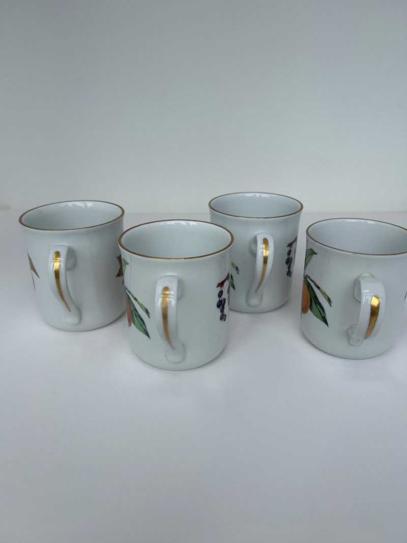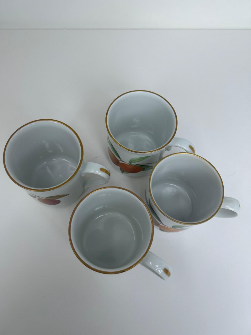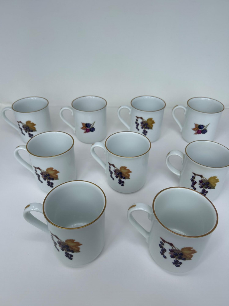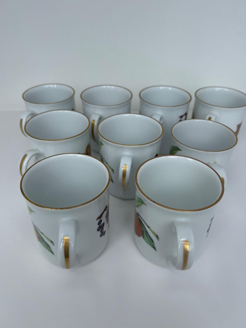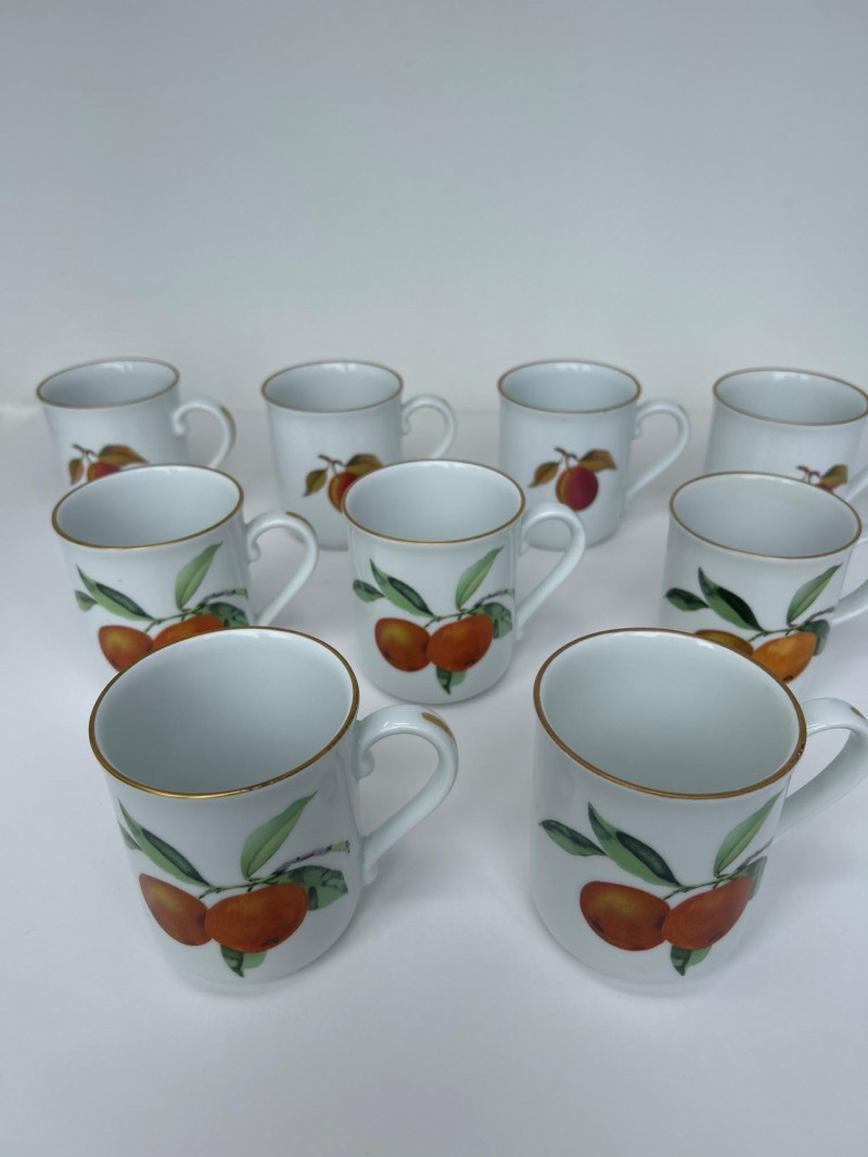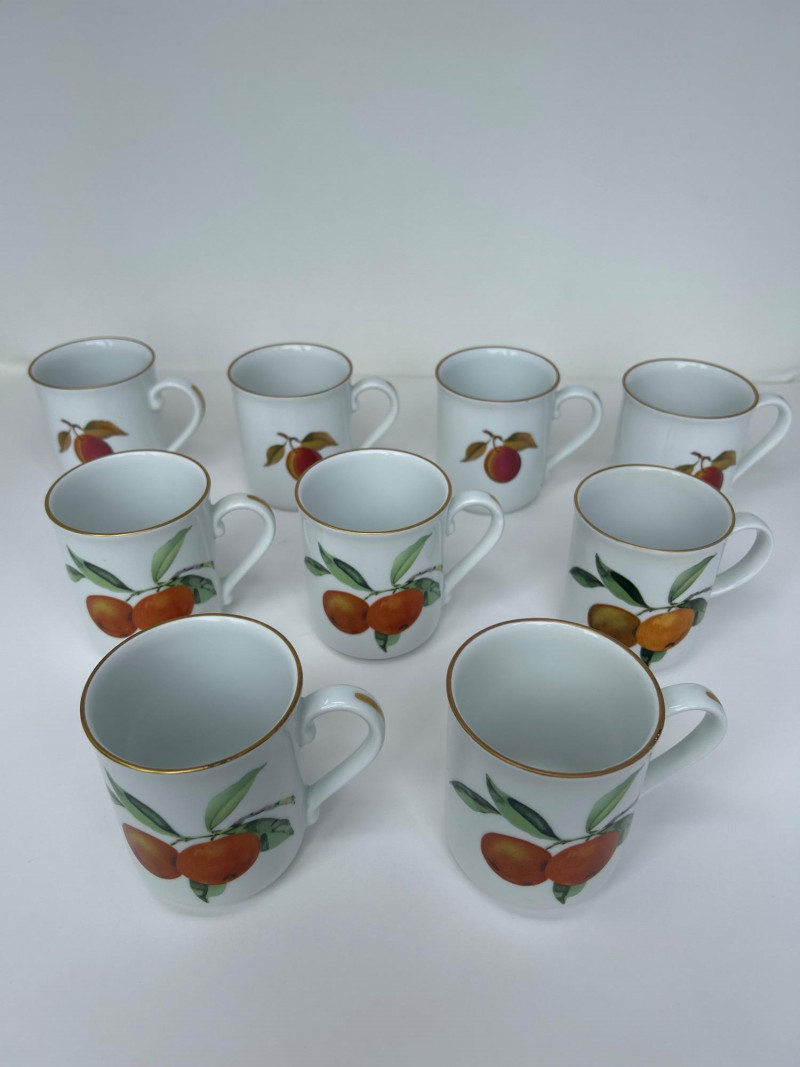 Royal Worcester Evesham Gold Fine Porcelain Mugs – Set of 9 Set of nine fine porcelain mugs by Royal Worcester in the Evesham Gold pattern. Each mug features fruit motifs with green leaves and a gold rim accent. Pattern: Evesham Gold Material: Fine porcelain Quantity: 9 mugs Approximate height: 3.75" Maker: Royal Worcester