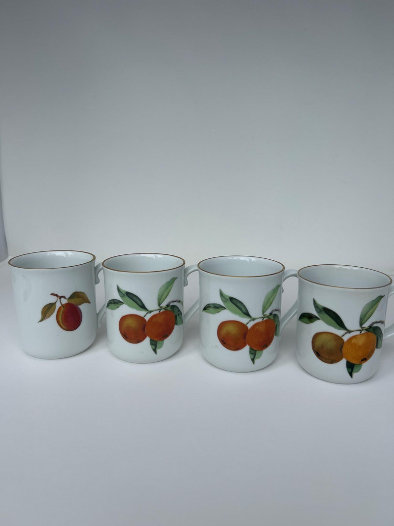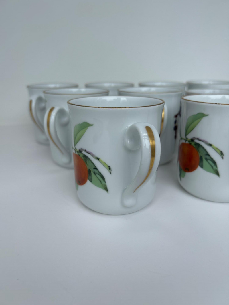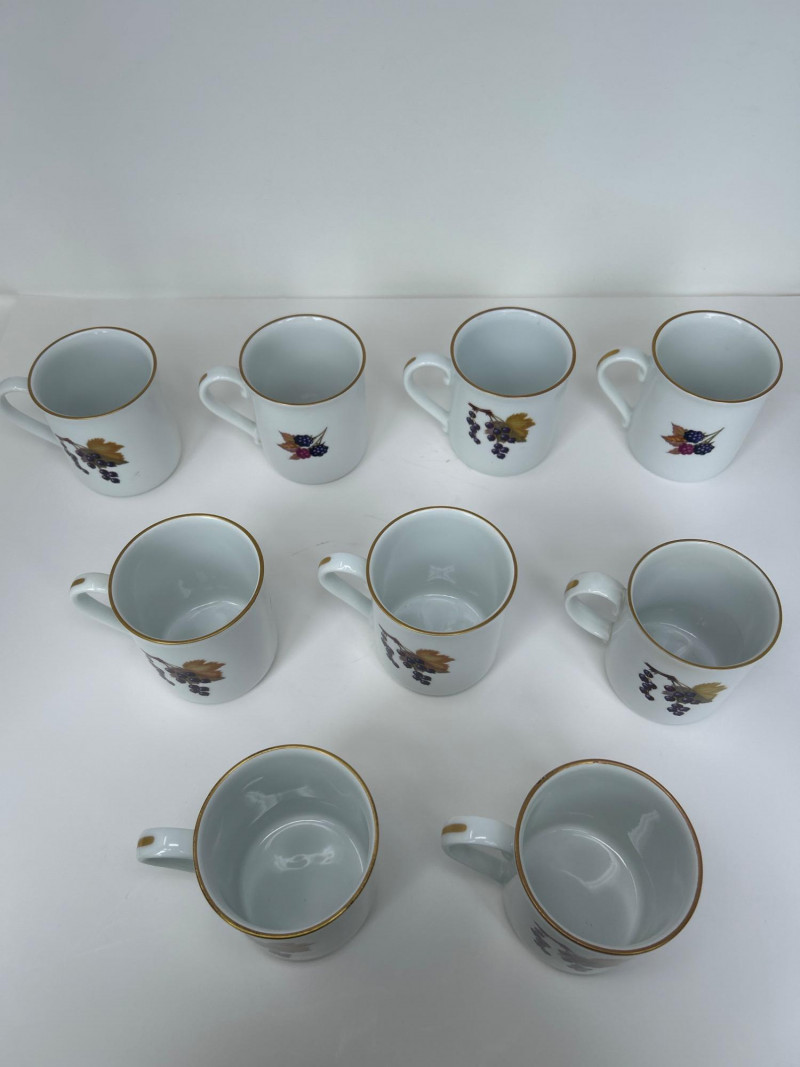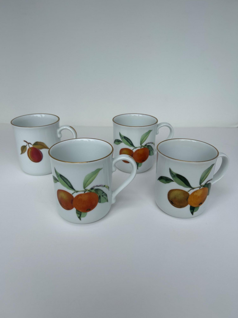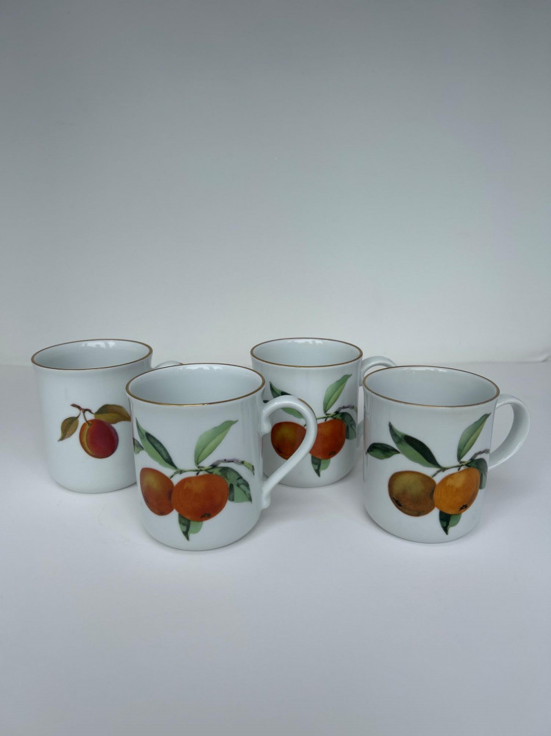 Royal Worcester Evesham Gold Fine Porcelain Mugs – Set of 9 Set of nine fine porcelain mugs by Royal Worcester in the Evesham Gold pattern. Each mug features fruit motifs with green leaves and a gold rim accent. Pattern: Evesham Gold Material: Fine porcelain Quantity: 9 mugs Approximate height: 3.75" Maker: Royal Worcester