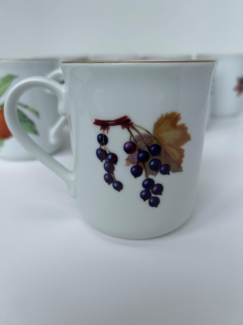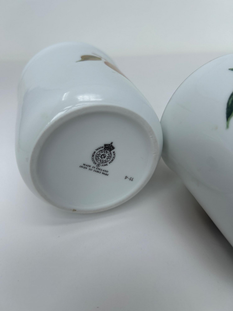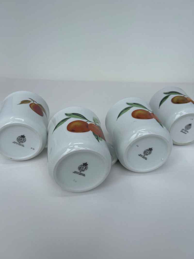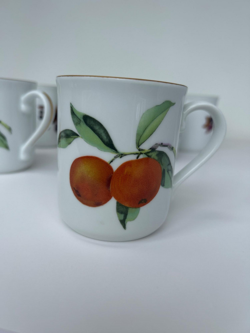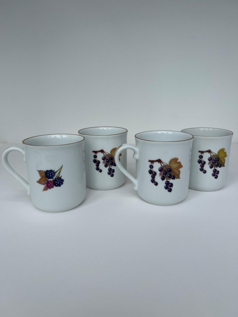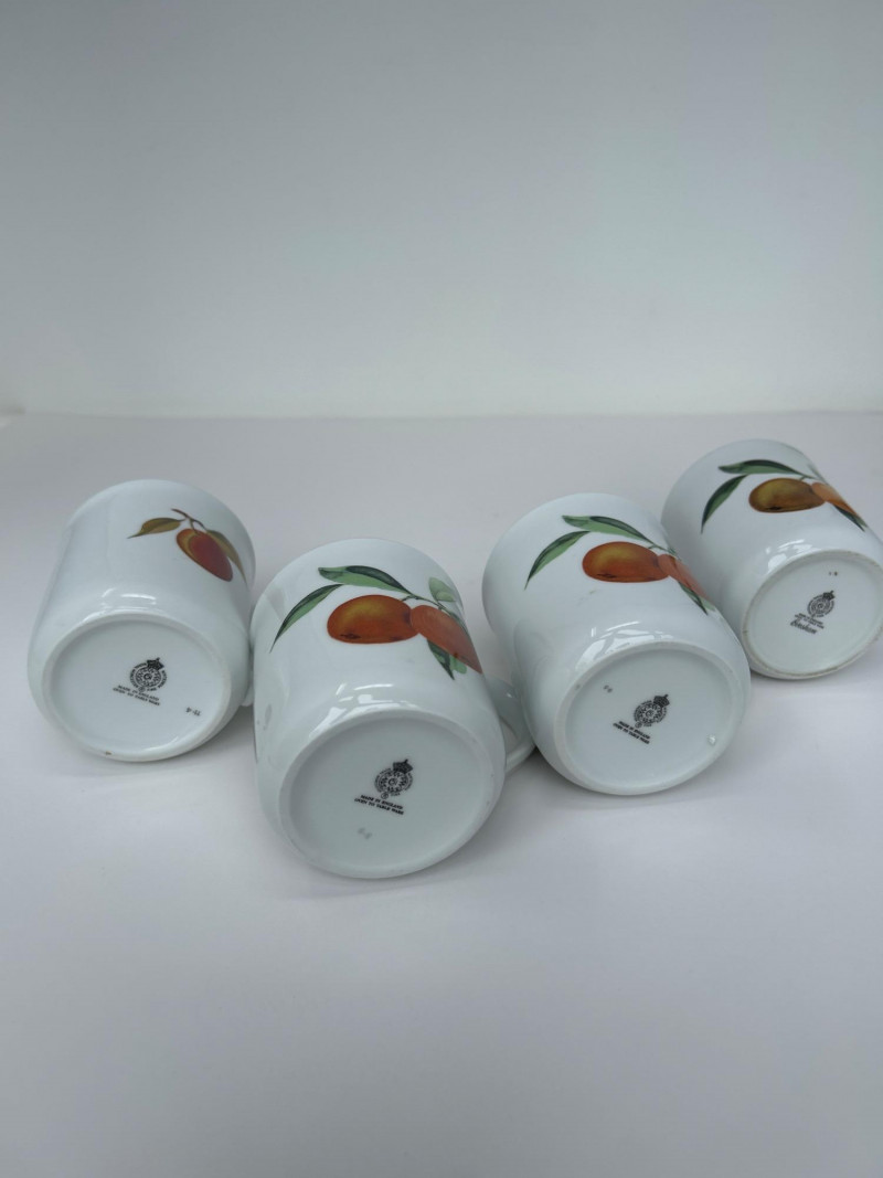 Royal Worcester Evesham Gold Fine Porcelain Mugs – Set of 9 Set of nine fine porcelain mugs by Royal Worcester in the Evesham Gold pattern. Each mug features fruit motifs with green leaves and a gold rim accent. Pattern: Evesham Gold Material: Fine porcelain Quantity: 9 mugs Approximate height: 3.75" Maker: Royal Worcester