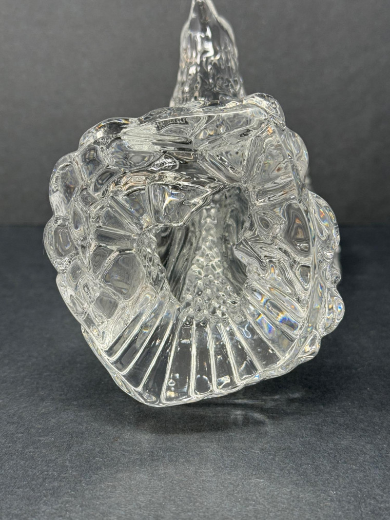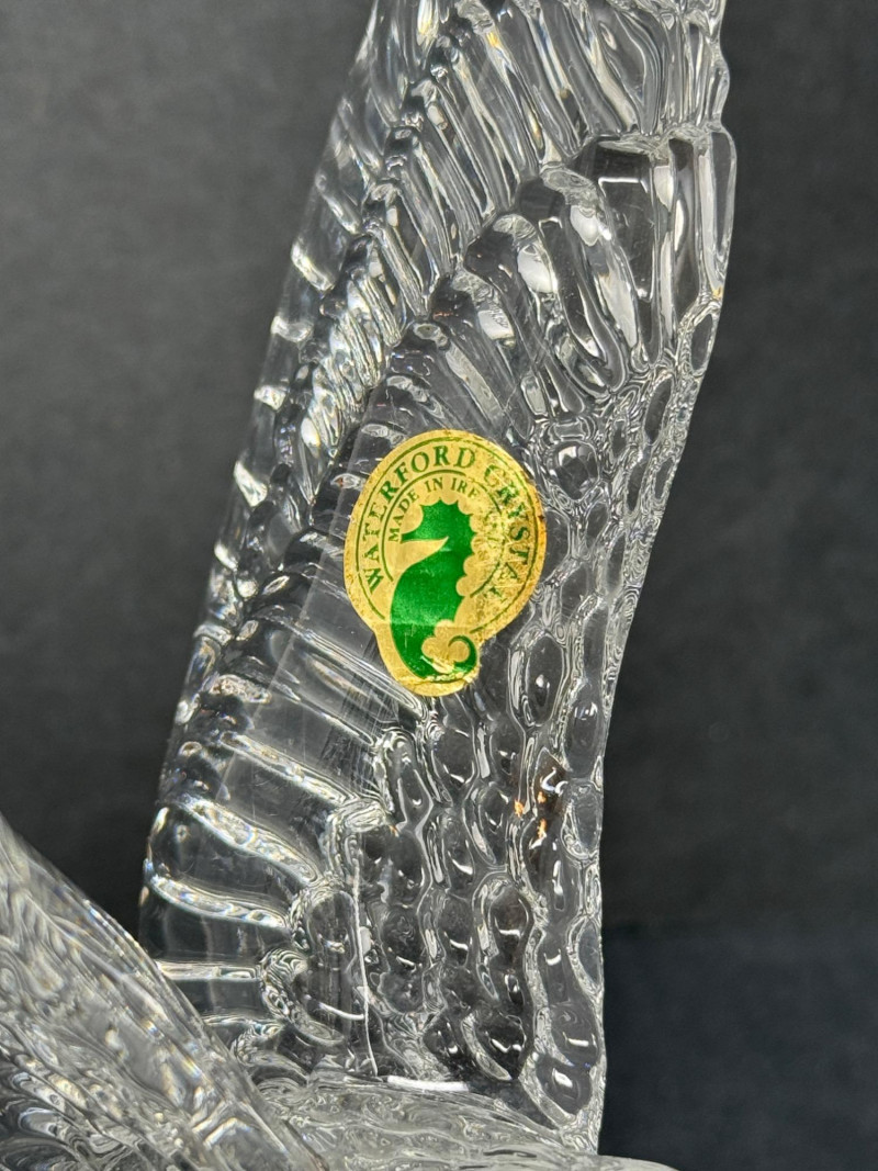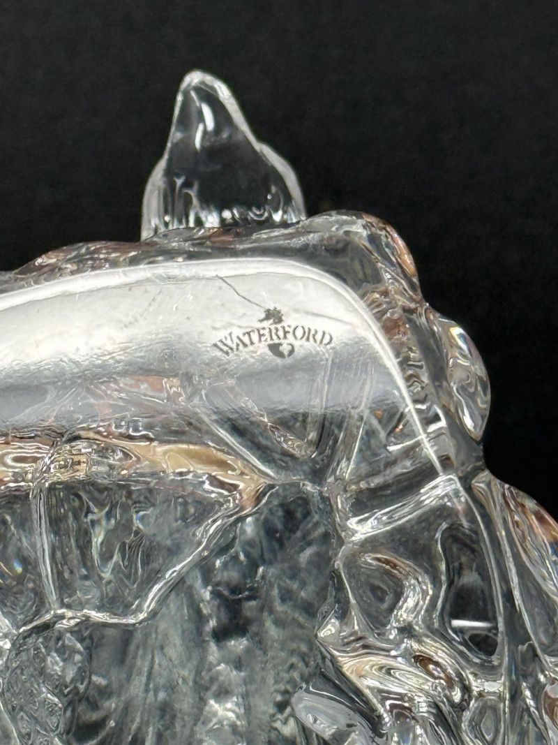Waterford Crystal Eagle Sculpture by Fred Curtis – 8" H Clear crystal eagle sculpture by Waterford, designed by Fred Curtis. The eagle is captured in mid-flight with wings raised, perched on a textured rocky base. Detailed feather and surface textures throughout. Retains original Waterford foil label. Made in Ireland. Measurements: