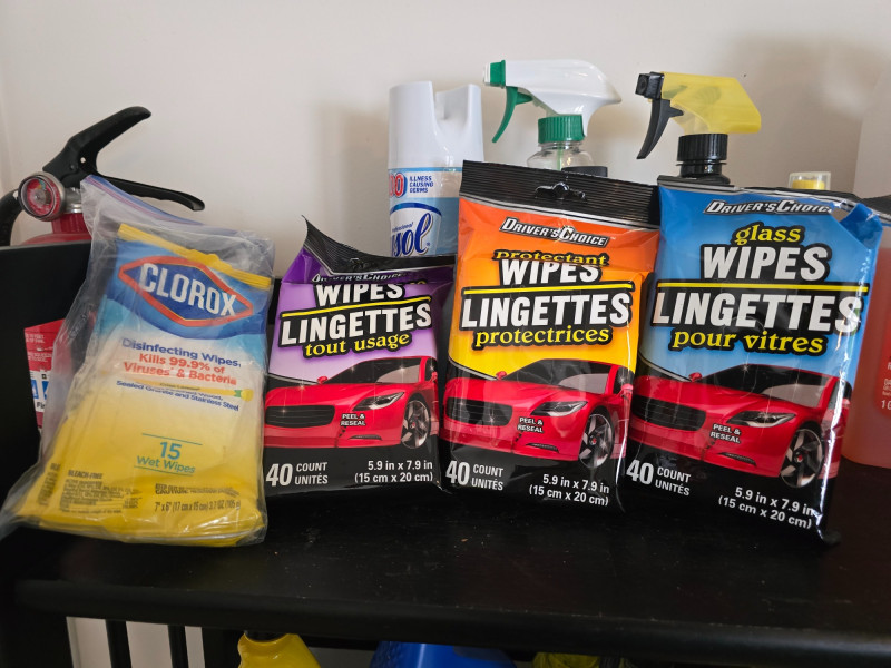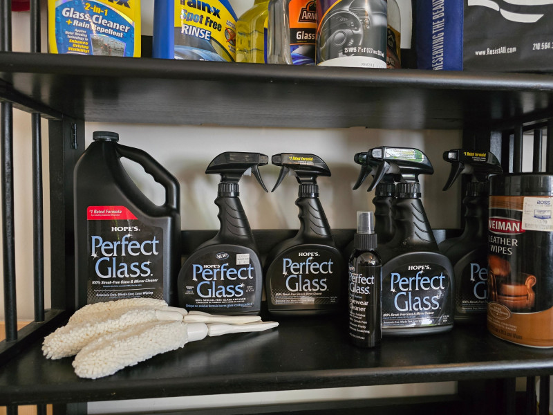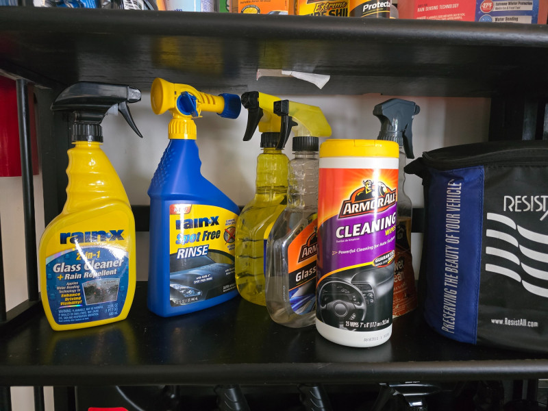 Car Cleaning Supplies – Shelf Included Comprehensive lot of automotive cleaning products and tools, including Armor All wash and wax extreme tire shine, original protectant, cleaning wipes, and glass cleaner; Prestone all-season windshield washer fluid; a complete "Resist All" cleaning kit for renew, wash, shine, preserve, clean, and protect; Rain-X water repellent glass cleaner; Hopes Perfect Glass cleaner; along with various cleaning tools and wipes. All items are organized on a multi-tier shelf, which is included with the lot.