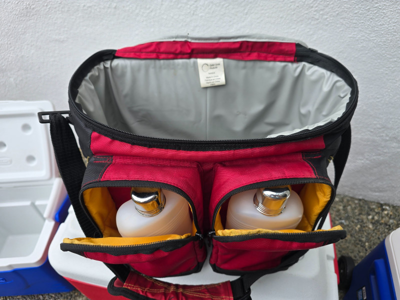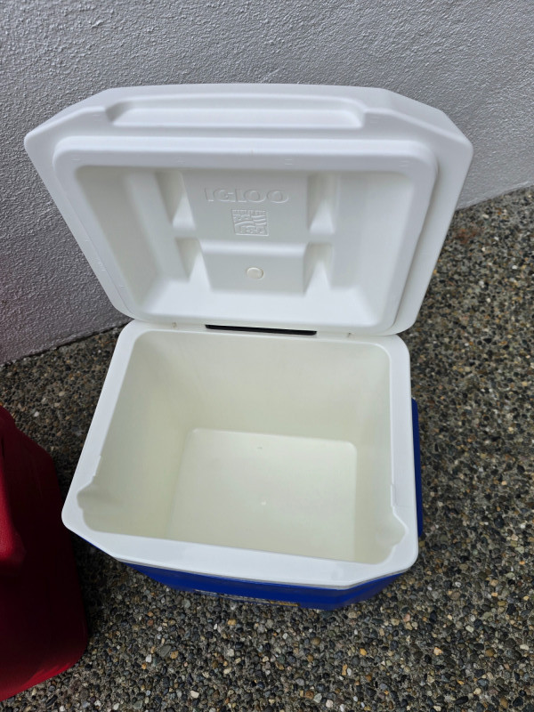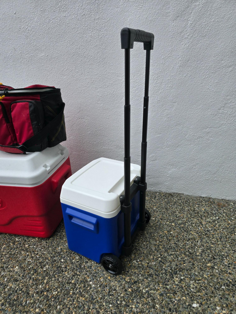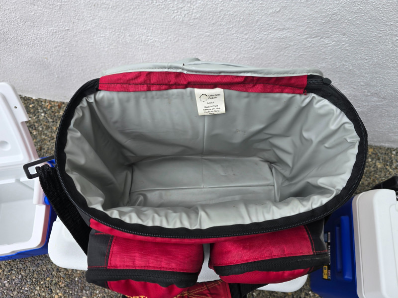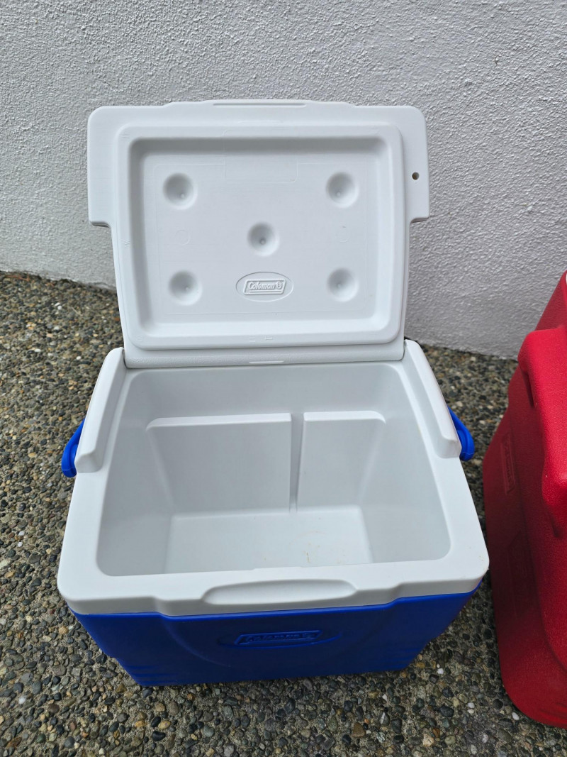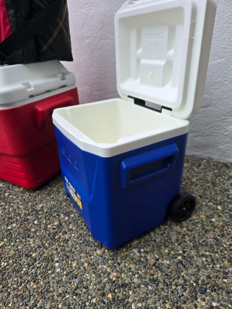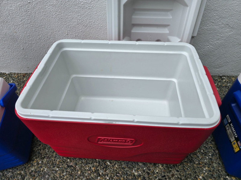 Four-Piece Outdoor Cooler Lot Collection of four coolers suitable for outdoor use, including wheeled, hard-sided, and soft-sided models. Designed to accommodate various needs such as transporting food, storing drinks, or carrying lunch. Coolers feature molded or padded handles, secure lids, and insulated interiors to retain cold temperature for extended periods. Ideal for camping, tailgating, picnics, or worksite use. Set includes: (1) Coleman red hard-sided cooler with molded handles and hinged white lid (1) Coleman blue compact hard-sided cooler with side handles (1) Igloo blue wheeled cooler with built-in dolly and telescoping handle (1) Arctic Zone red and black soft-sided cooler with shoulder strap and front zip pockets