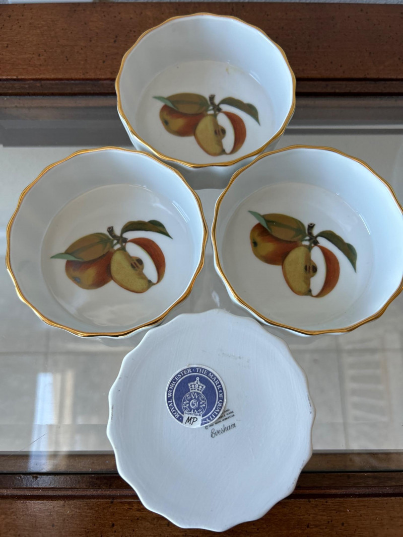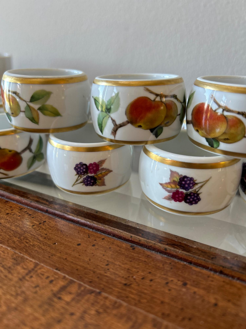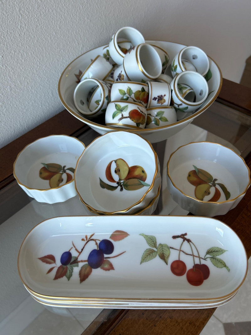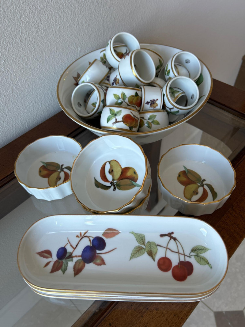 Royal Worcester Tableware – Evesham Gold Pattern Fine porcelain tableware set by Royal Worcester in the Evesham Gold pattern, featuring hand-painted fruit motifs and elegant gold edging. A classic example of English tableware, this set is ideal for both display and functional dining use. The vibrant fruit illustrations include plums, cherries, apples, and peaches, each rendered in rich color on a white porcelain background. This set includes: One large serving bowl (3.25" H x 10" D) – flared rim with gold trim Four oval serving dishes (9" L x 3" W) – each decorated with different fruit patterns Four ramekins (4" D) – fluted sides and gold rims Twenty-one porcelain napkin rings – variety of fruit designs; two are slightly smaller in size Pattern: Evesham Gold