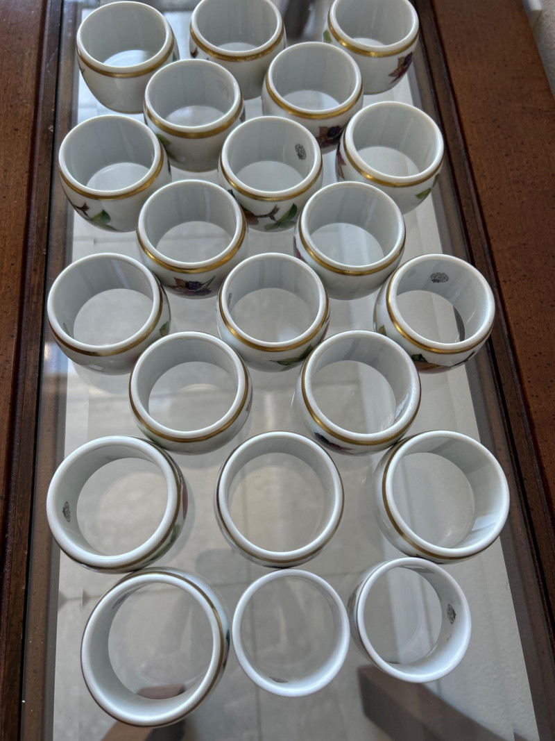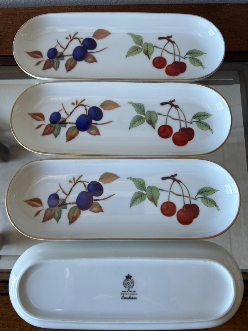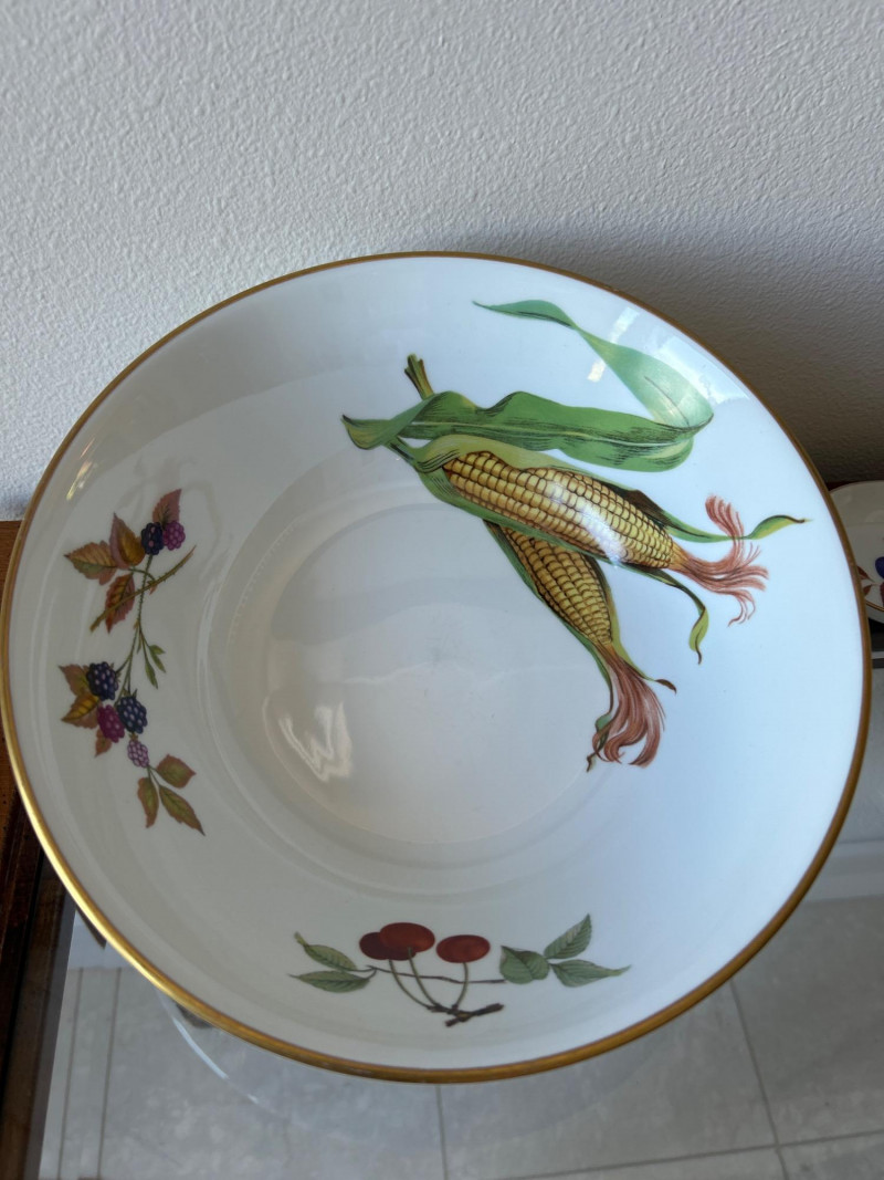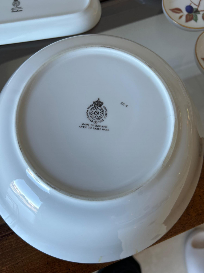 Royal Worcester Tableware – Evesham Gold Pattern Fine porcelain tableware set by Royal Worcester in the Evesham Gold pattern, featuring hand-painted fruit motifs and elegant gold edging. A classic example of English tableware, this set is ideal for both display and functional dining use. The vibrant fruit illustrations include plums, cherries, apples, and peaches, each rendered in rich color on a white porcelain background. This set includes: One large serving bowl (3.25" H x 10" D) – flared rim with gold trim Four oval serving dishes (9" L x 3" W) – each decorated with different fruit patterns Four ramekins (4" D) – fluted sides and gold rims Twenty-one porcelain napkin rings – variety of fruit designs; two are slightly smaller in size Pattern: Evesham Gold
