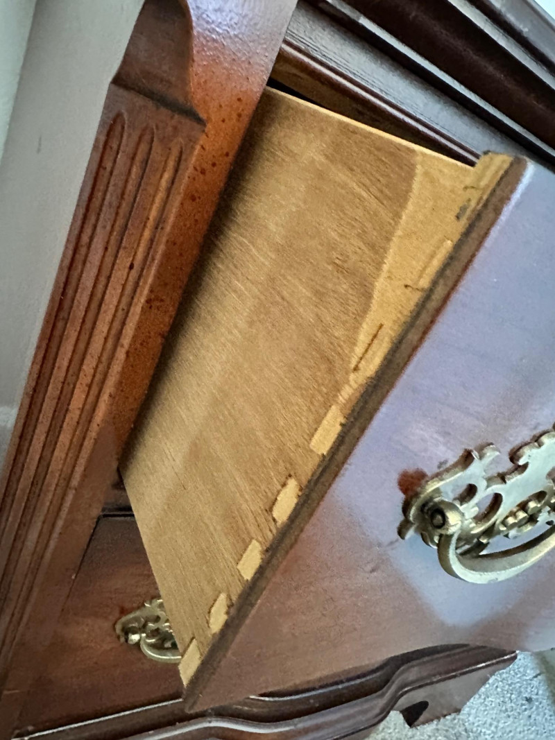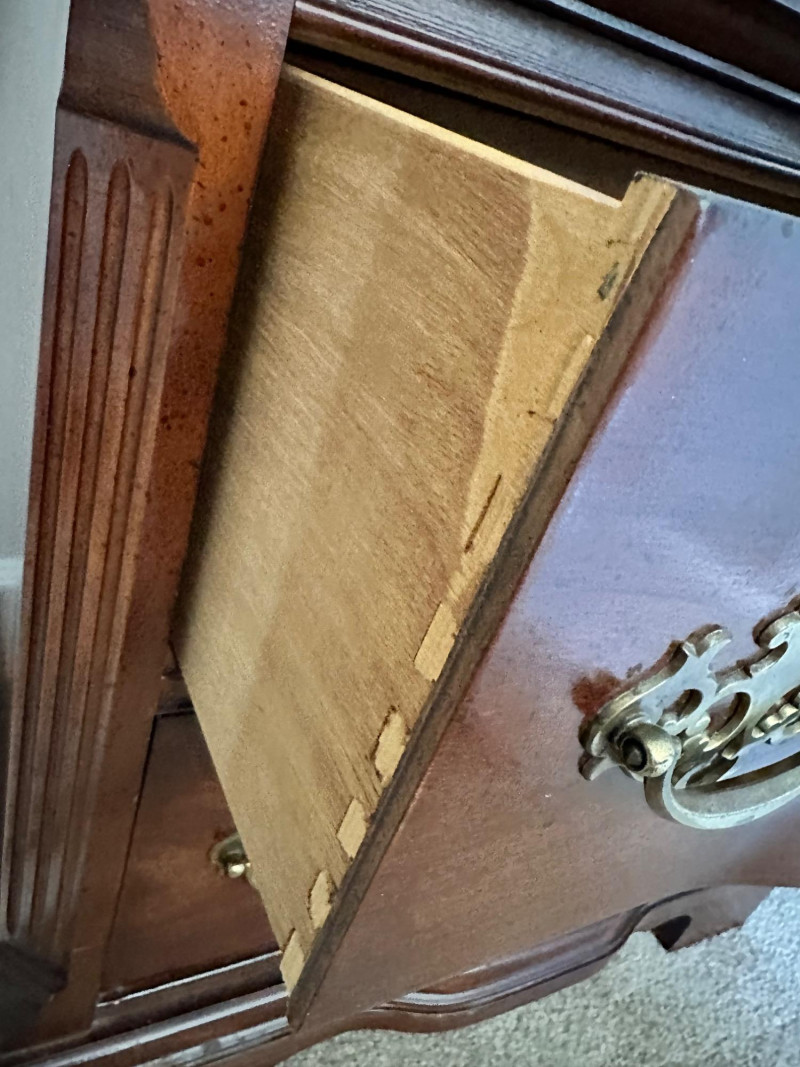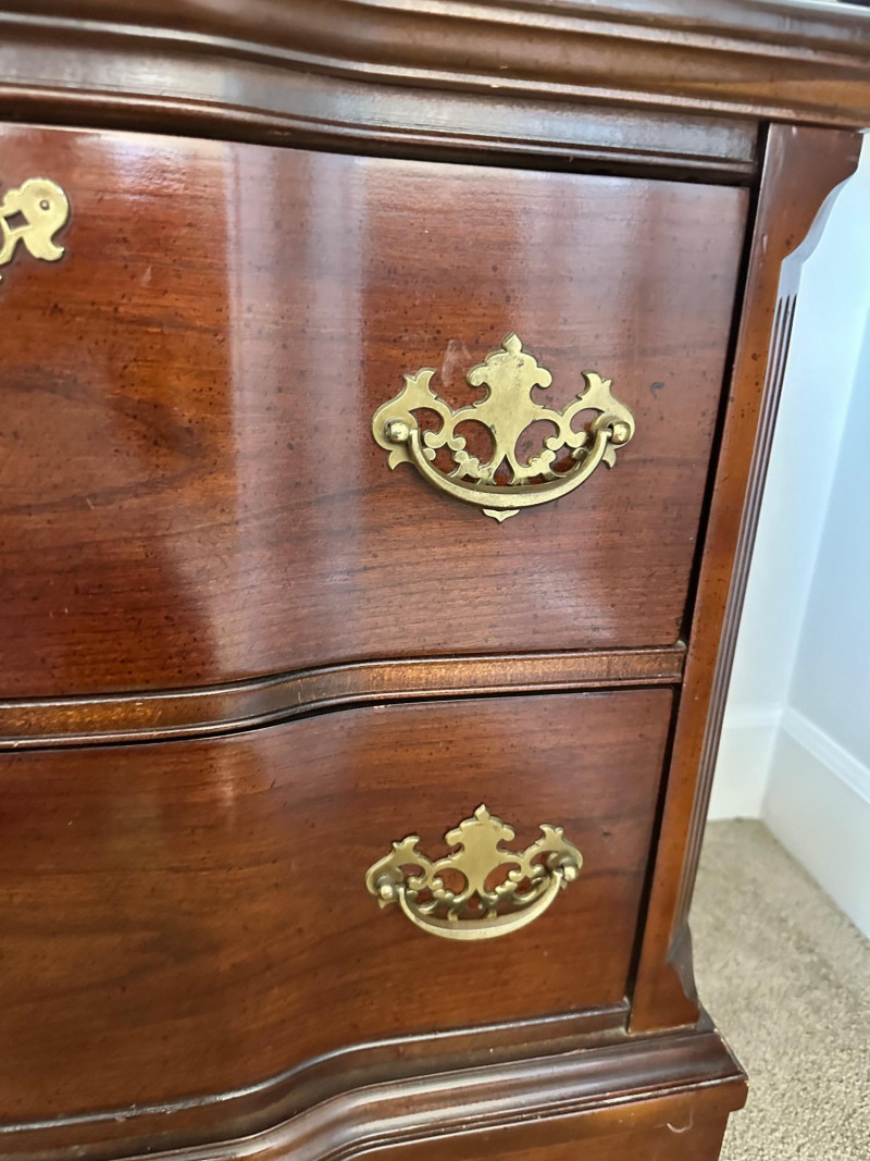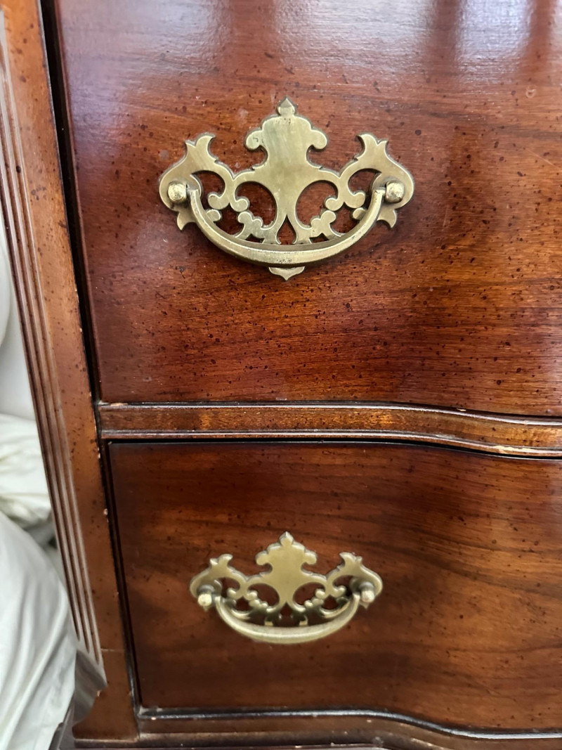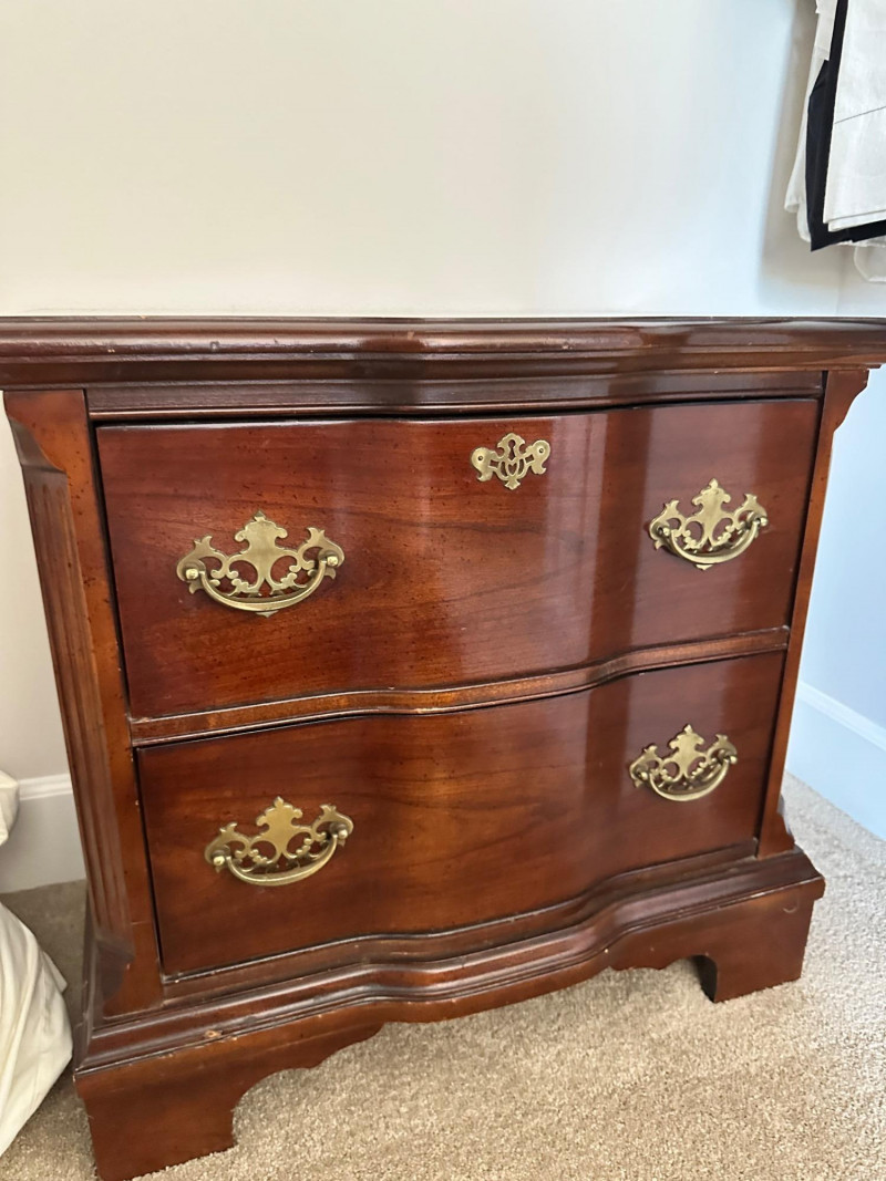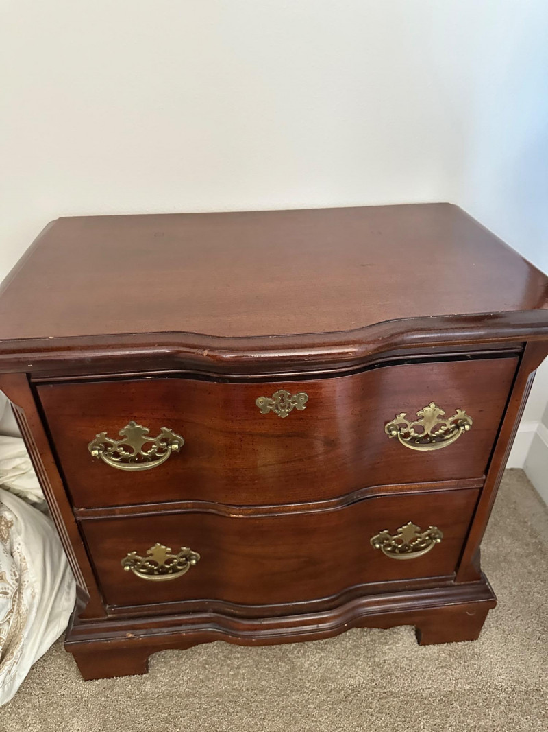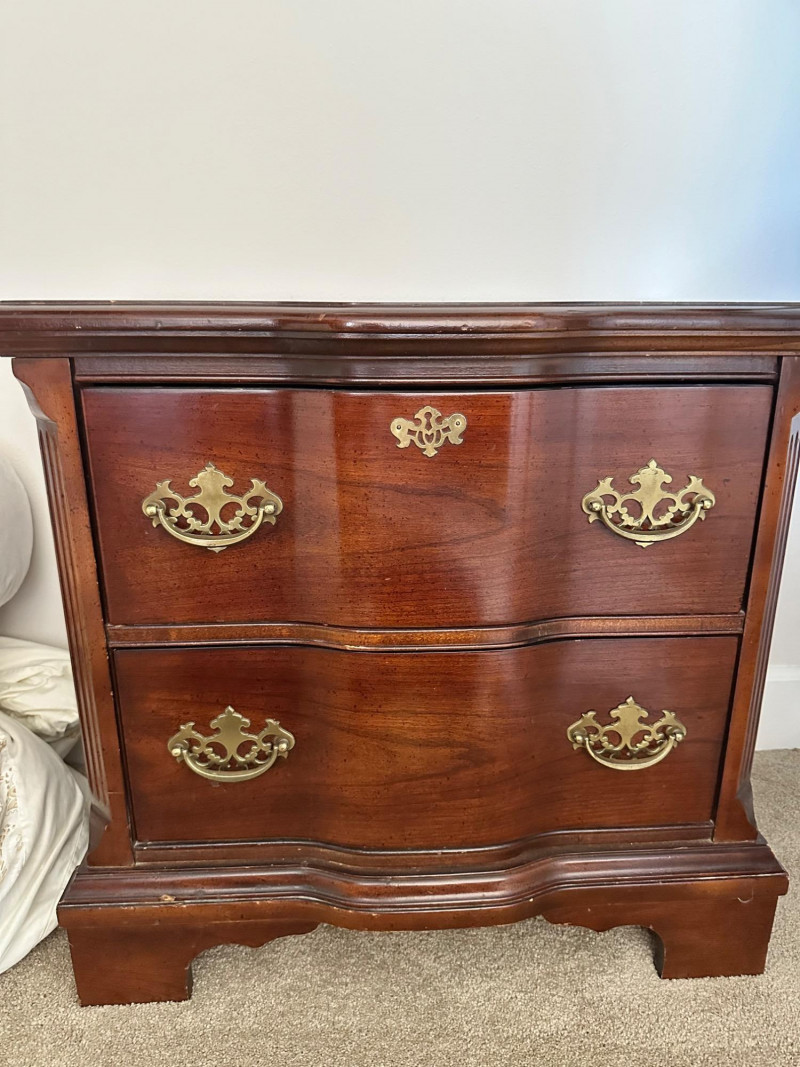 Two Drawer Colonial Nightstand With Brass Pulls Two-drawer wooden nightstand with curved front design and decorative brass pulls. Features dovetail drawer construction and fluted side details. Some finish wear present and signs of drawer use. Measurements: