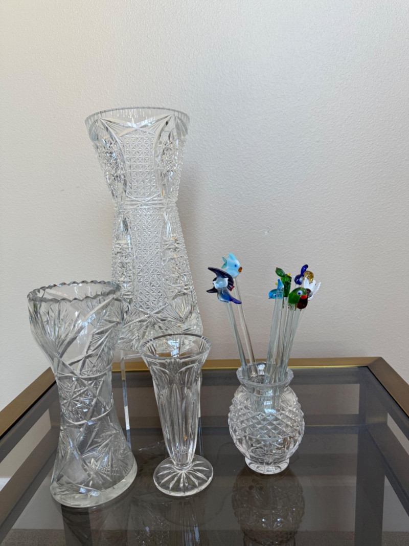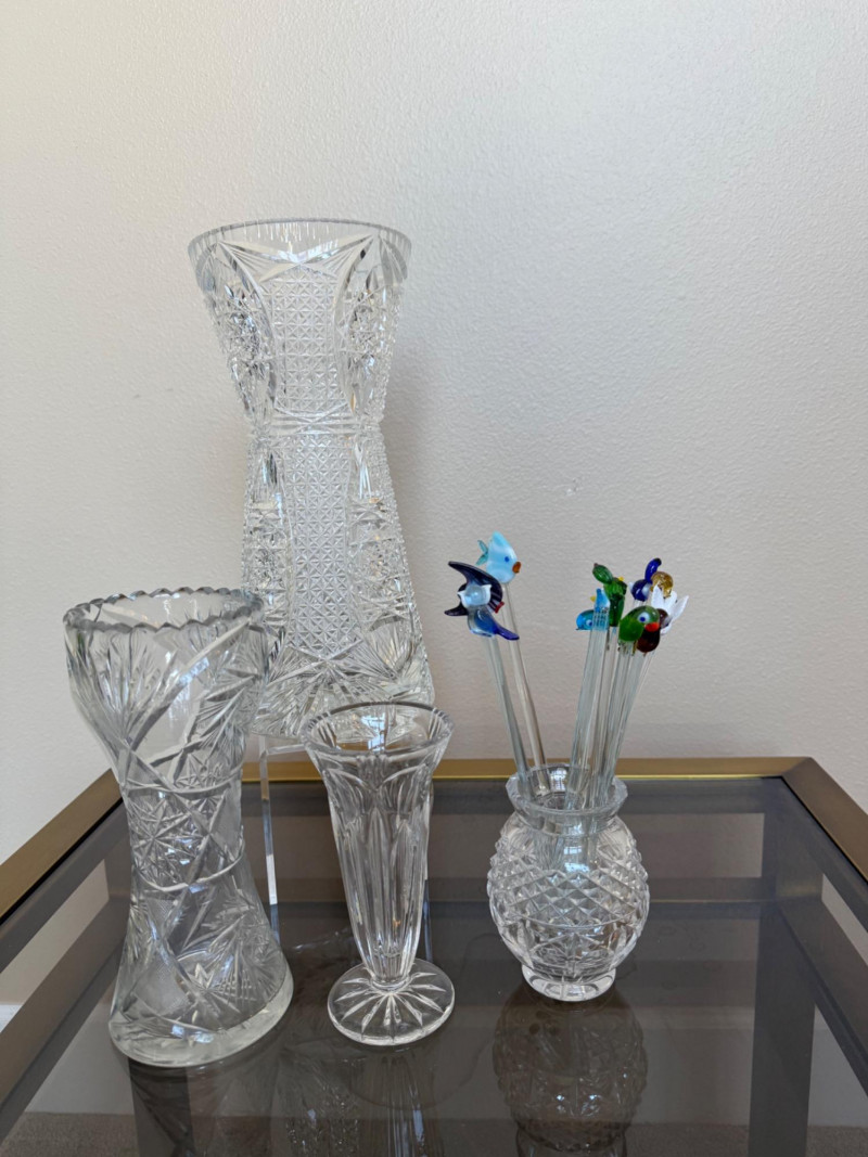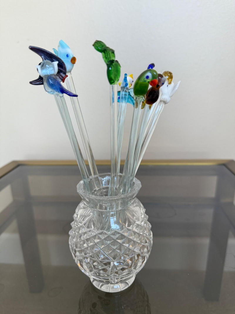 Four Distinctive Cut Glass Vases with Decorative Stir Sticks Set includes four cut glass vases, each featuring unique patterns and shapes. One vase holds six decorative glass stir sticks with colorful animal and bird finials. Measurements (height, smallest to largest):