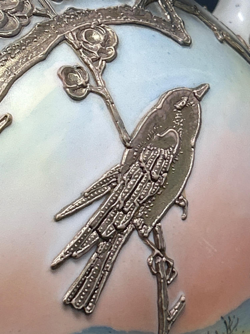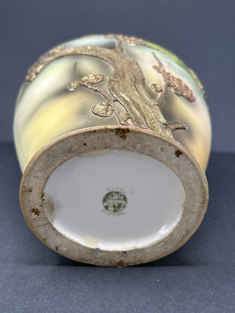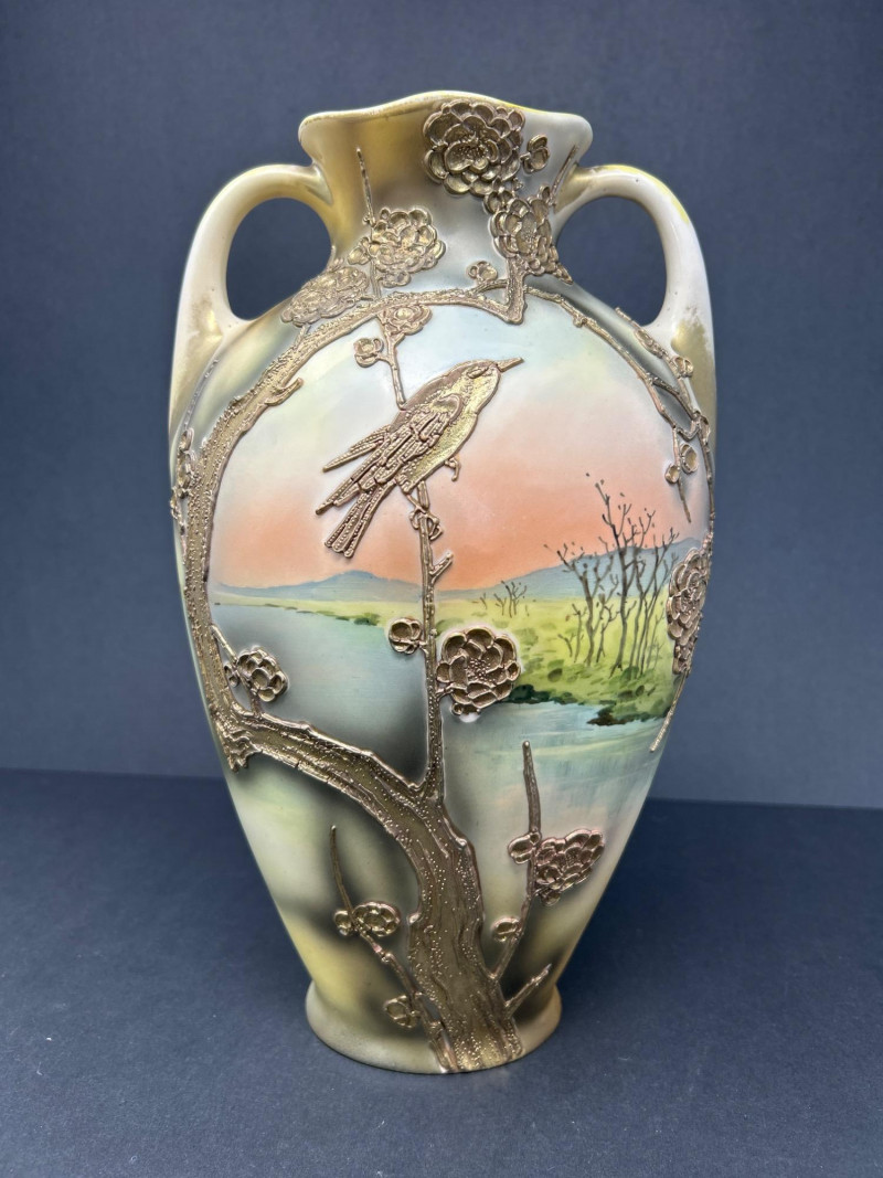 A striking Nippon porcelain vase, hand-painted with a tranquil landscape at sunset. The scene features a bird perched among flowering branches, overlooking a serene lake with distant trees silhouetted against a gradient sky of peach, blue, and green. Raised textured enamels add depth to the floral and scenic elements, enhancing the artistry and tactile appeal. Origin: Japan (Nippon mark, early 20th century)