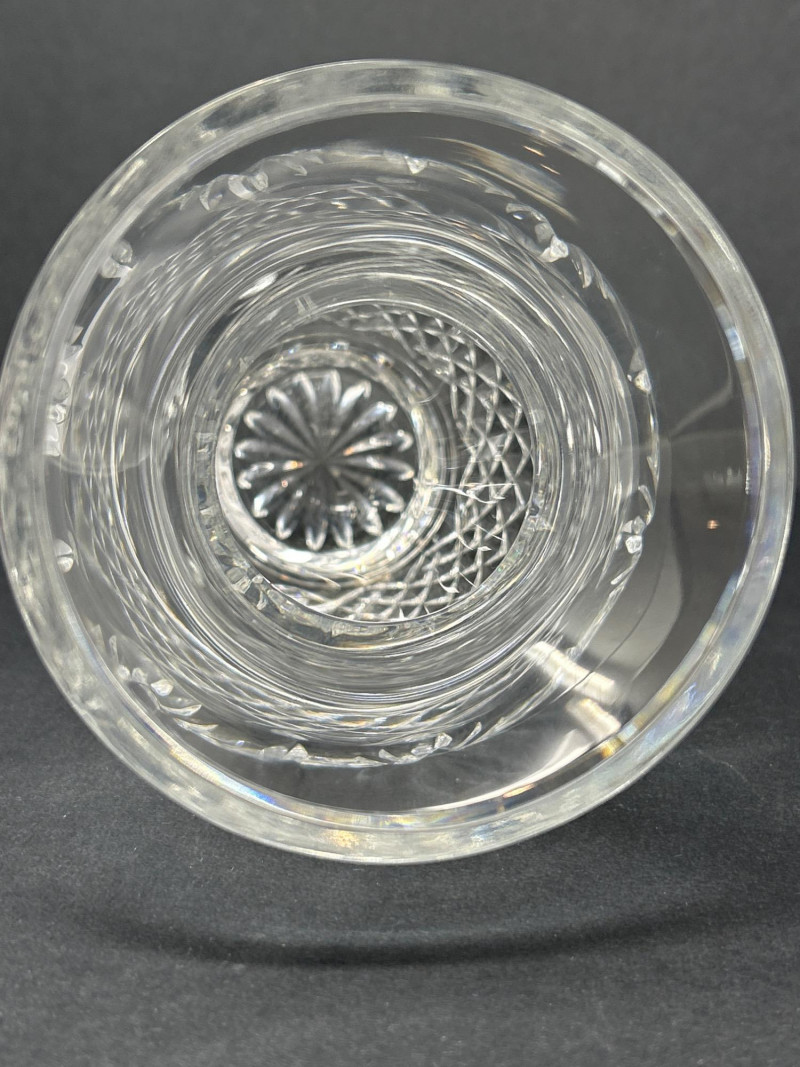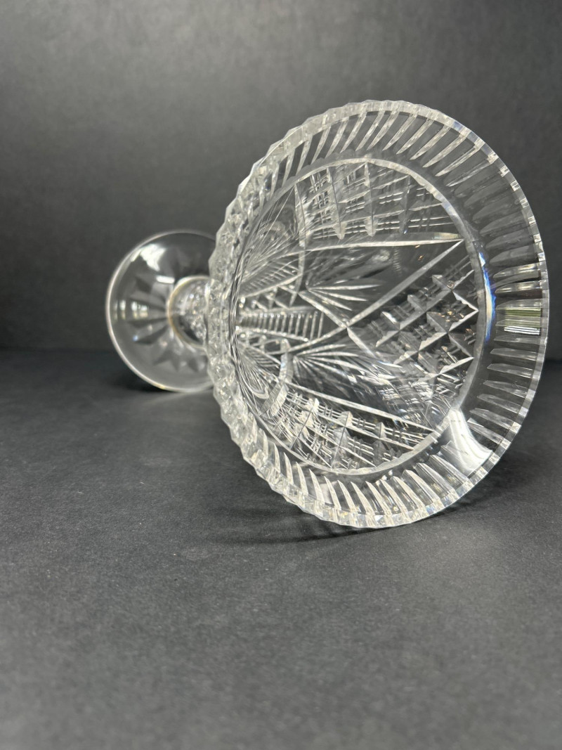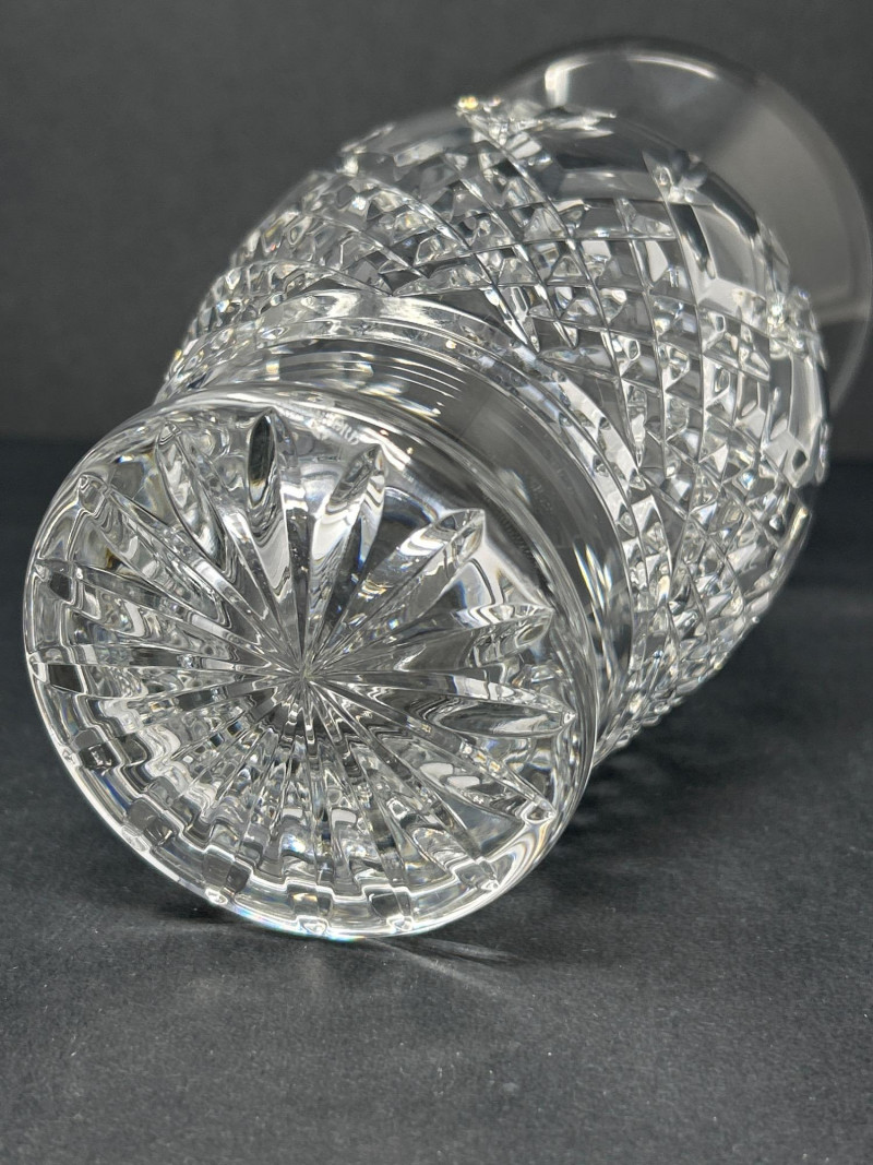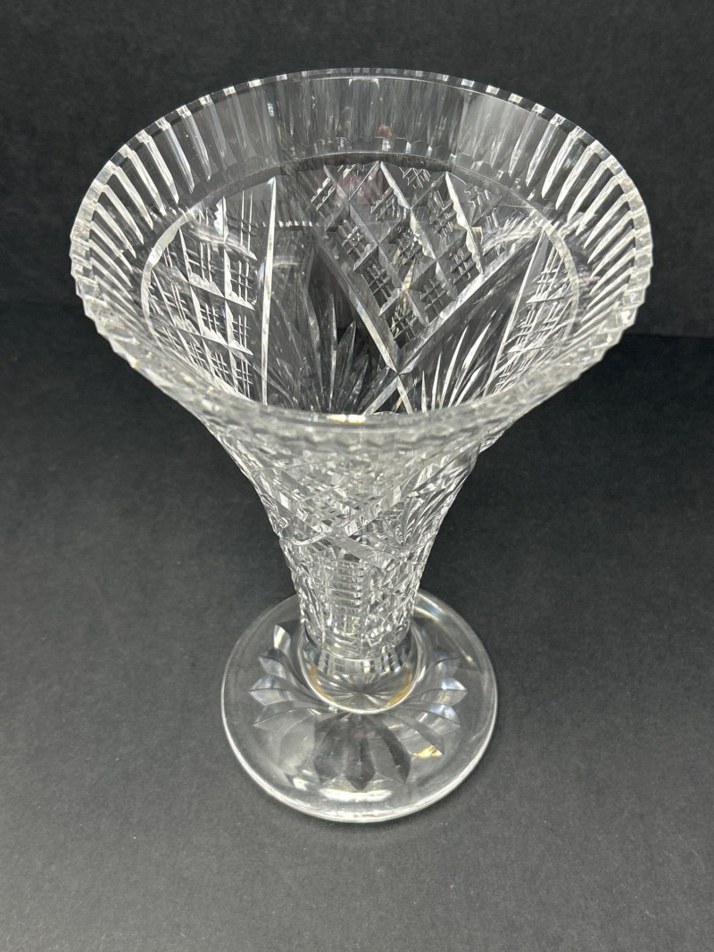 A dazzling pair of Waterford cut crystal vases, each showcasing the brand’s signature brilliance and precision. These pieces exemplify the timeless elegance of Irish crystal, with deeply cut patterns that catch and refract light beautifully. Contents: Flared vase(foreground): Features a wide, trumpet-shaped rim and a sturdy footed base. The body is adorned with Waterford’s classic diamond and starburst cuts, offering exceptional clarity and sparkle Curved vase (background): A more traditional silhouette with a gently rounded body and narrow neck. The surface is richly patterned with cross-hatched diamonds and vertical fluting Design:Intricate hand-cut motifs including diamonds, stars, and vertical panels; both vases exhibit Waterford’s hallmark craftsmanship Materials:Full-lead crystal, known for its weight, clarity, and brilliance Dimensions:Approx. 8" to 10" H (based on visual scale) Collectibility:Waterford crystal remains a benchmark of luxury glassware. These vases are ideal for formal display, floral arrangements, or gifting. Comparable pieces often retail for $100–$300 each depending on pattern and condition Historical Note:Founded in 1783, Waterford Crystal became renowned for its masterful cutting and clarity. These vases reflect the brand’s enduring legacy and appeal to collectors of fine European glass.