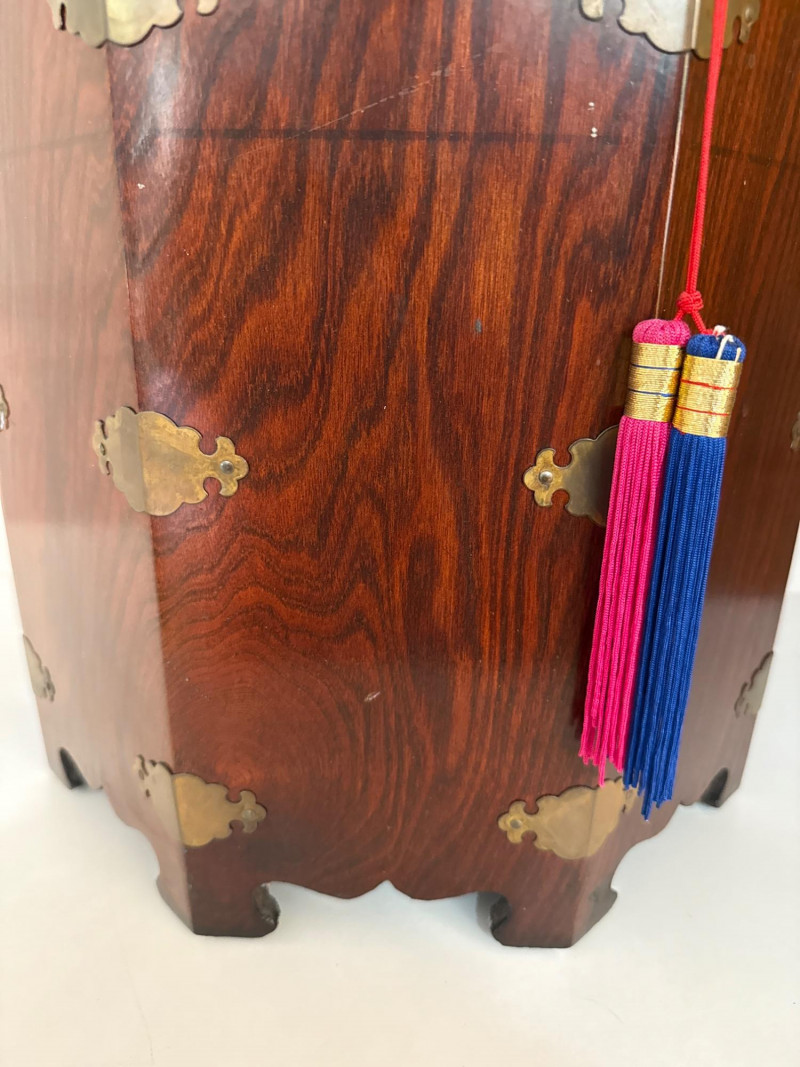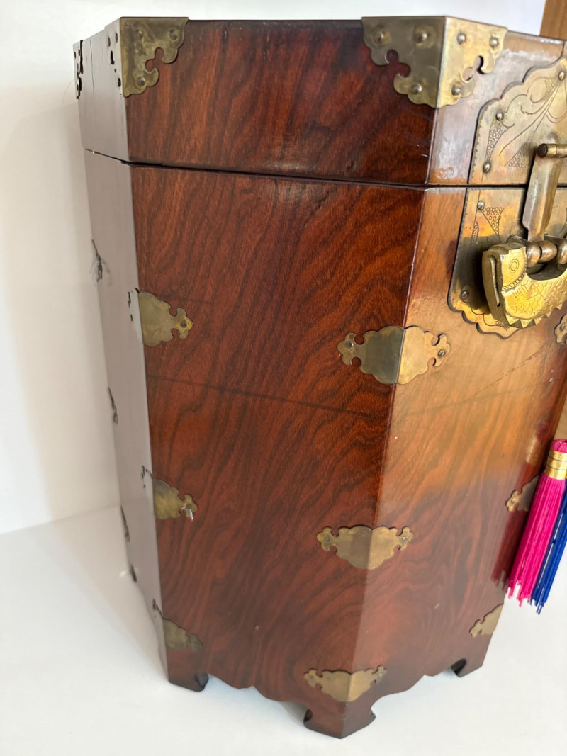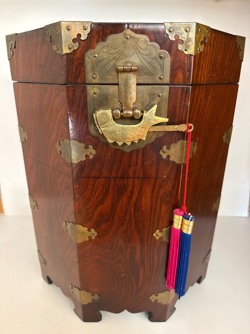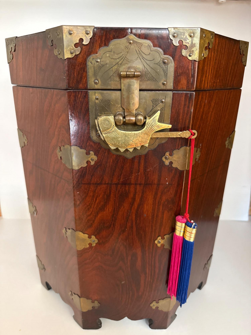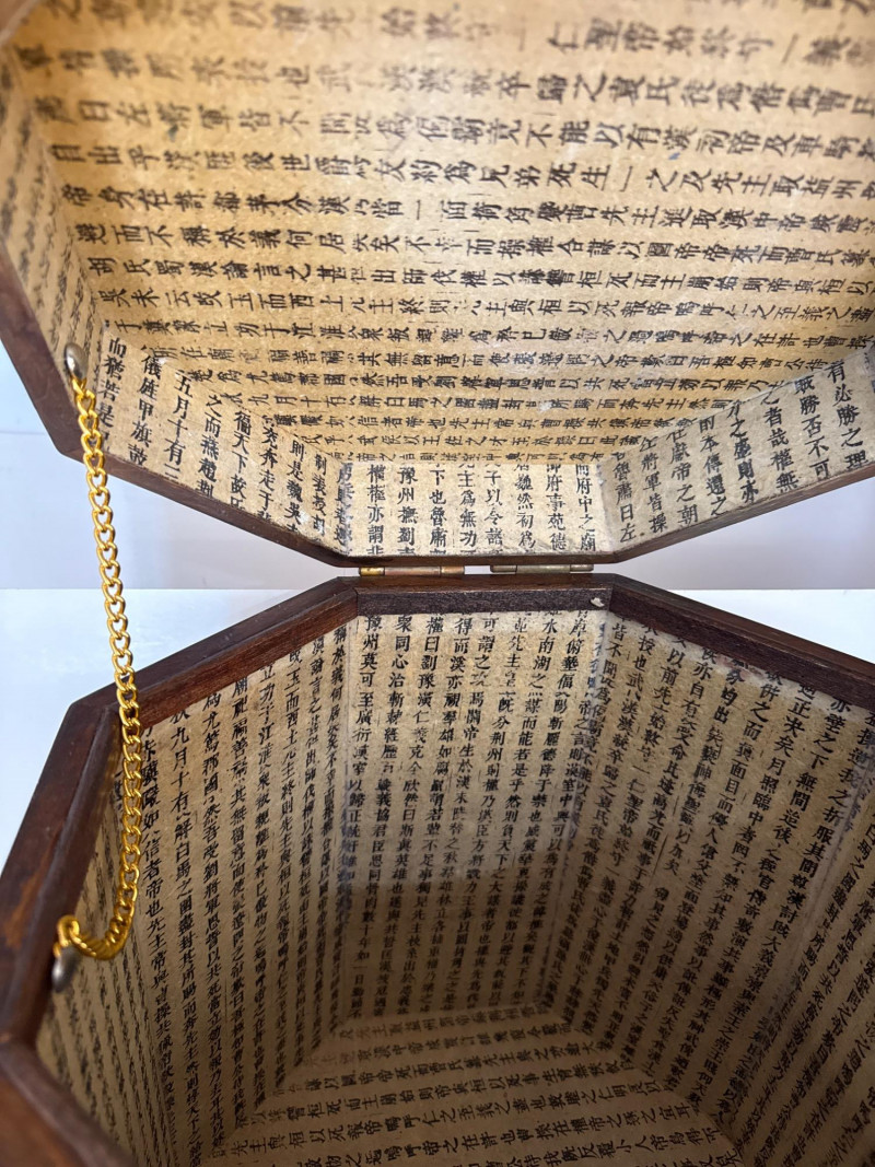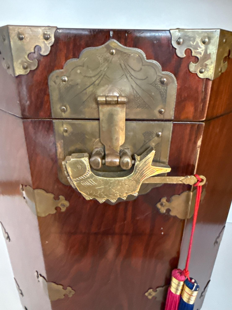 Design: Asian boutique octagonal box-style side table Aesthetic: A blend of vintage charm and Eastern-inspired elegance, highlighted by brass accents and calligraphy lining. Includes an authentic brass Koi fish pad lock. Functionality: Dual-purpose as a decorative accent and a small storage piece Presents in good vintage condition with minor wear consistent with age.Style