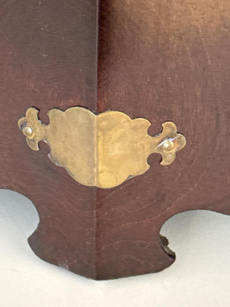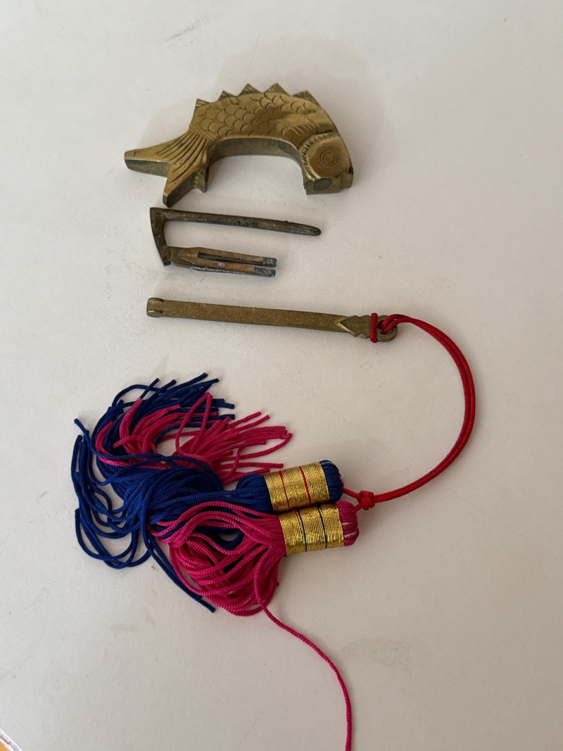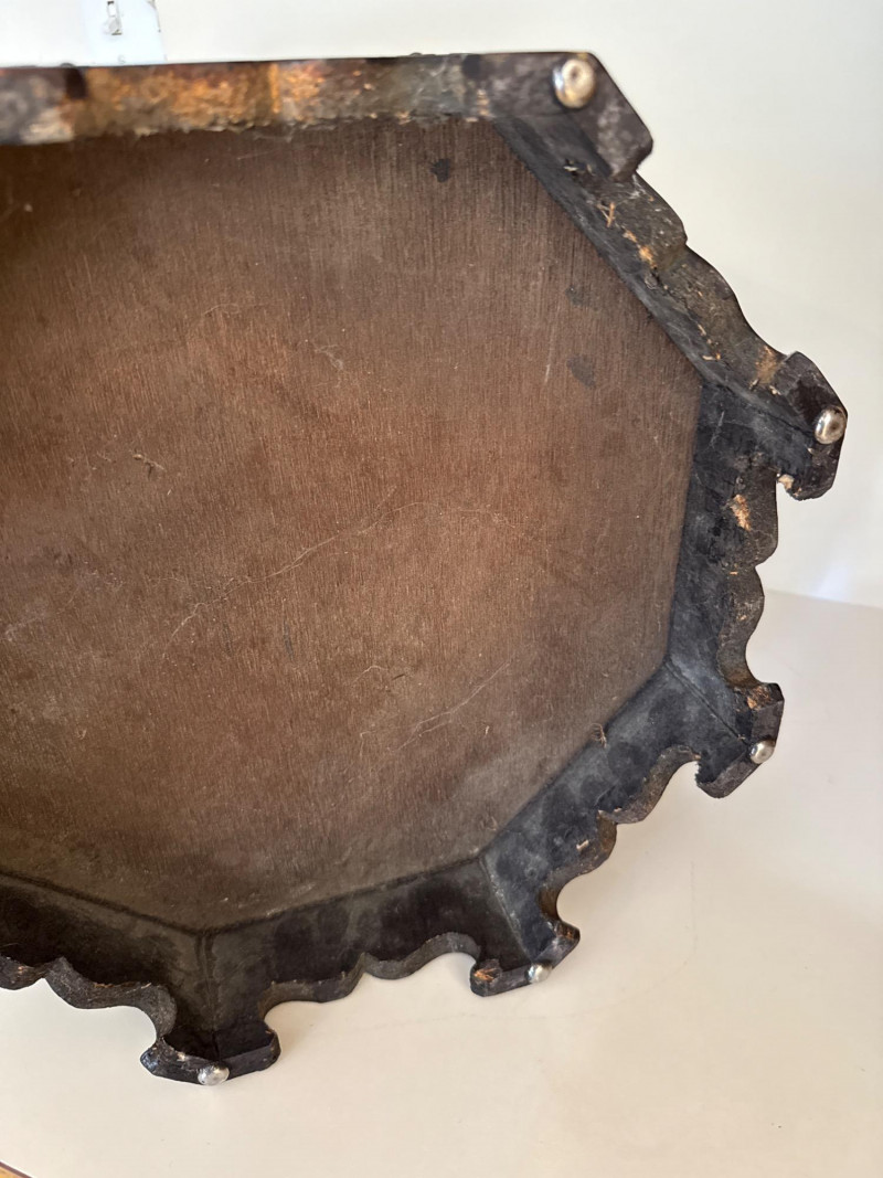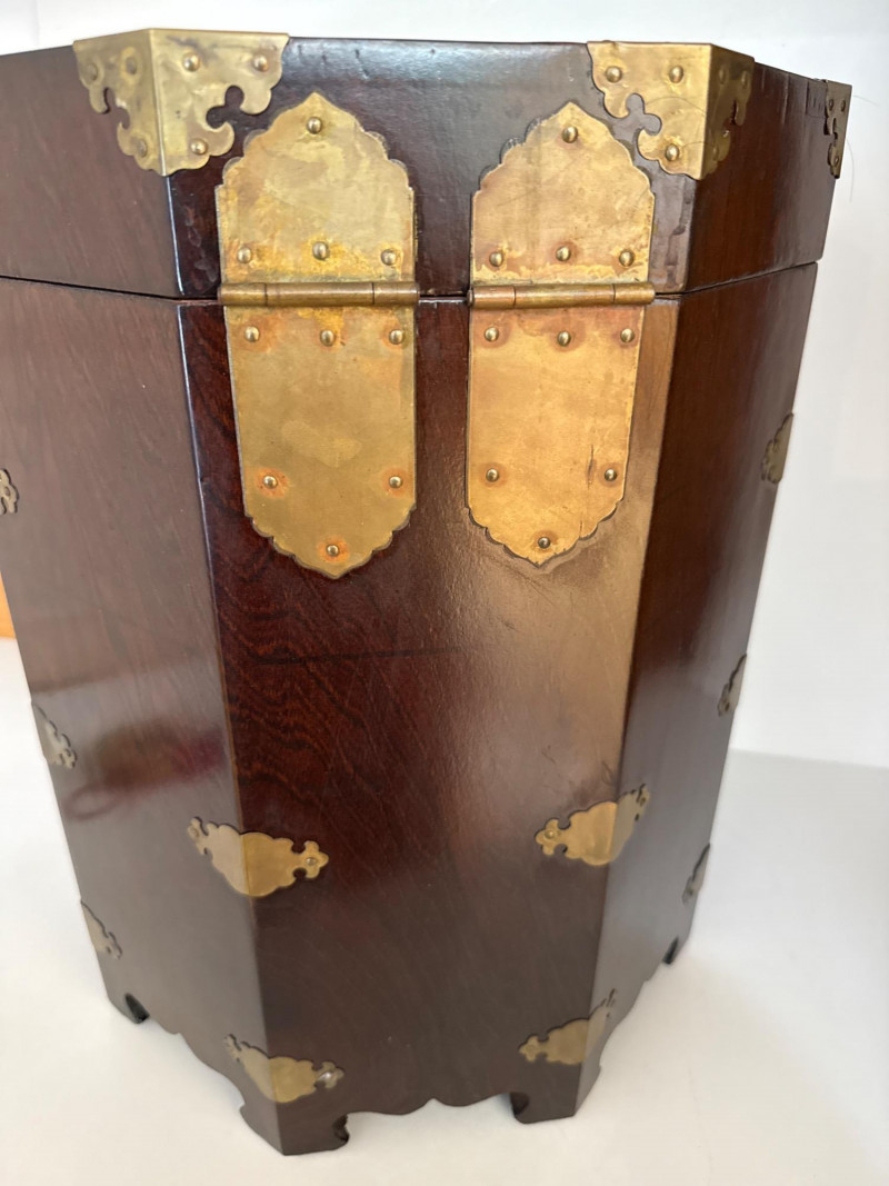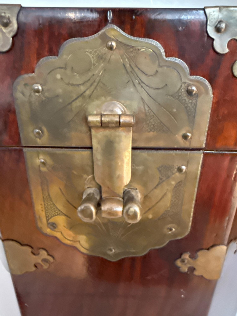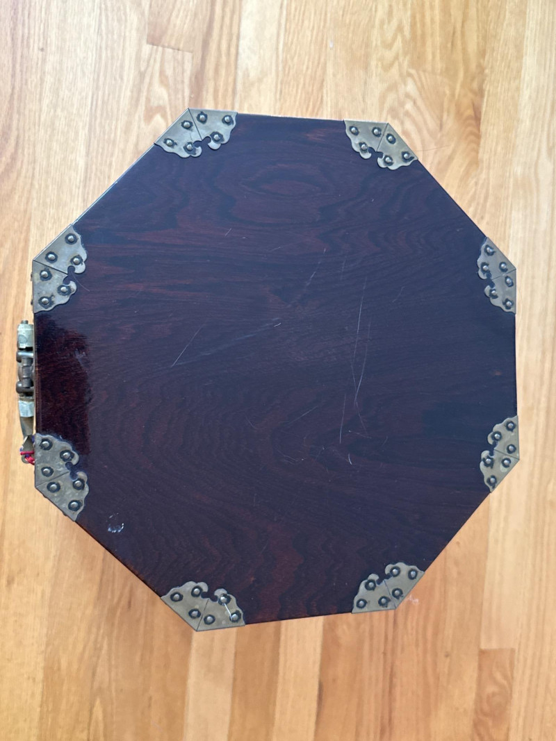 Design: Asian boutique octagonal box-style side table Aesthetic: A blend of vintage charm and Eastern-inspired elegance, highlighted by brass accents and calligraphy lining. Includes an authentic brass Koi fish pad lock. Functionality: Dual-purpose as a decorative accent and a small storage piece Presents in good vintage condition with minor wear consistent with age.Style