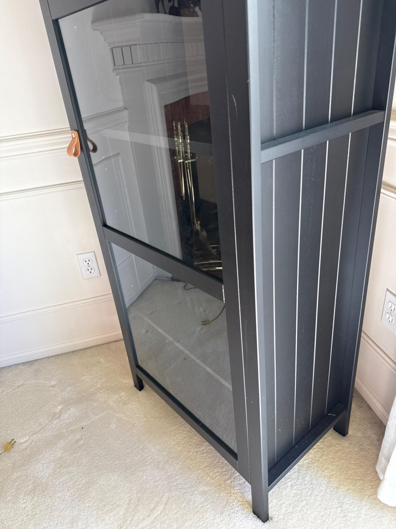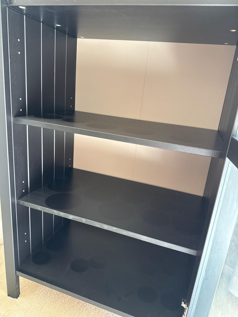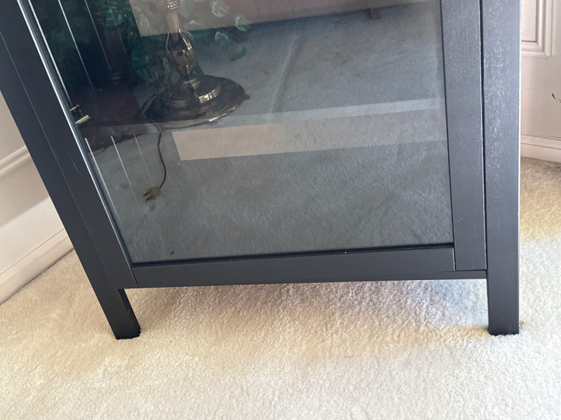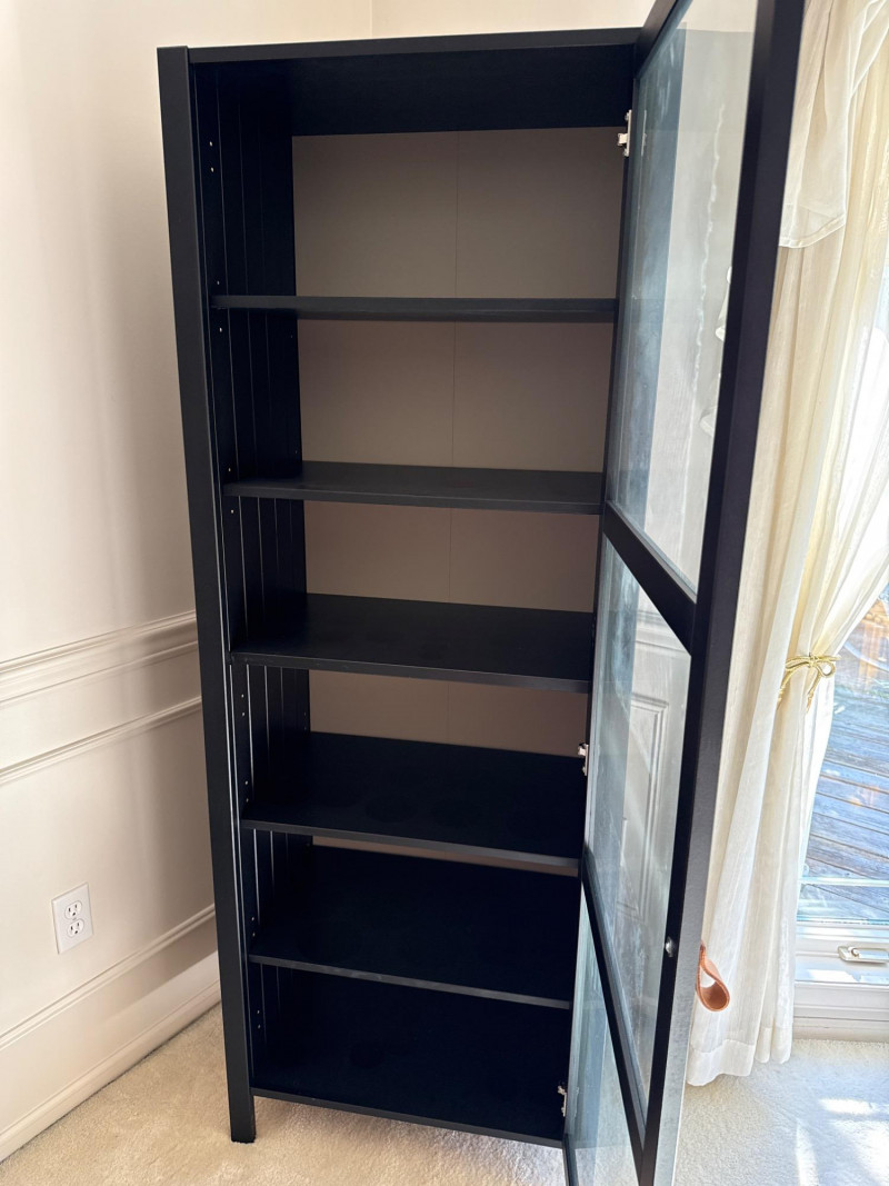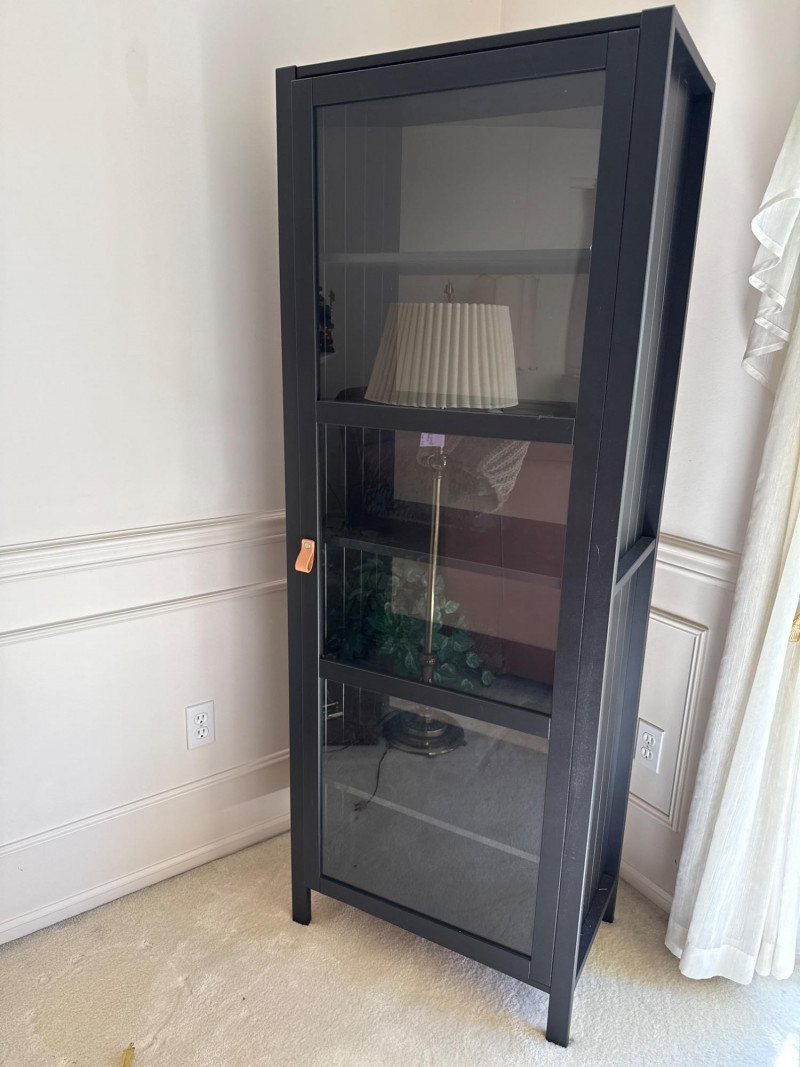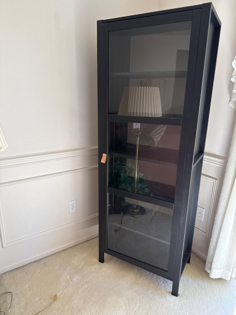 Elevate your space with the Bjorksnas Glass Front Cabinet by IKEA, blending Scandinavian charm with sleek functionality. Constructed from solid wood with clear glass door panels, this piece showcases your books, collectibles, or dishware while adding warmth and sophistication to any room. Color: Black Material: Wood with glass front doors Style: Modern Nordic – minimal lines, exposed grain finish Features: Adjustable interior shelves, glass panel doors, sturdy frame Ideal For: Living rooms, dining areas, offices, or boutique retail display Dimensions Length: 31 inches Width: 17 inches Height: 56 inches *Note: Must bring help to load. Per bidding contract, Staff is not able to load, lift or haul items.