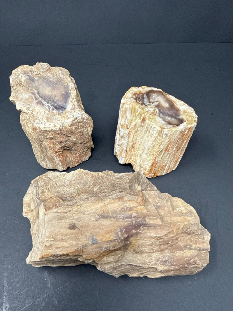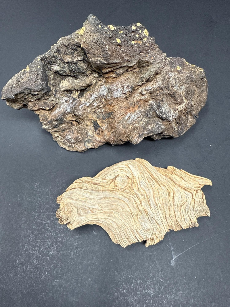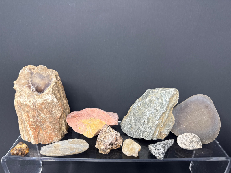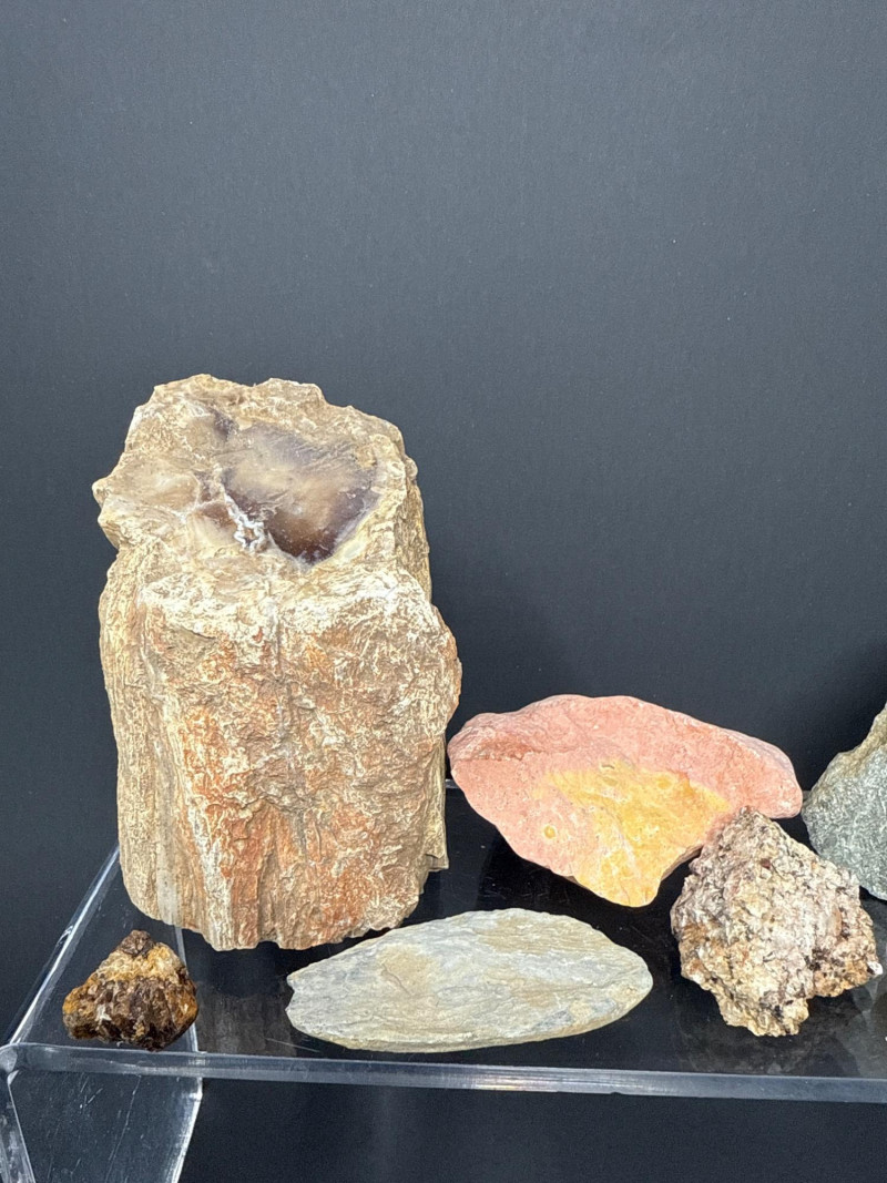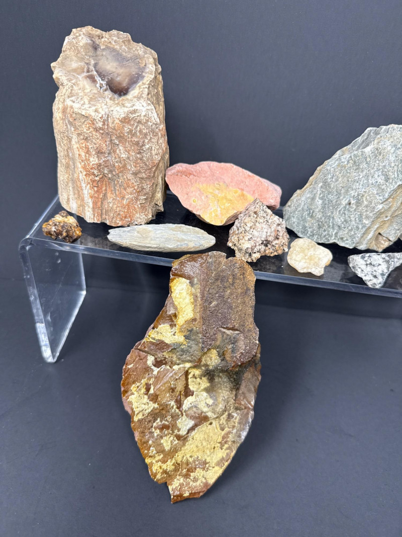 Variety: Fossil specimens, petrified wood fragments, assorted mineral rocks, and a hand-formed pottery bowl A curated selection of natural and crafted pieces, this lot includes: Fossils: Several small to medium-sized fossil specimens, likely marine in origin, showcasing visible striations and embedded textures. Petrified Wood: A few polished and raw fragments of petrified wood, with rich earthy tones and visible grain patterns. Some large pieces. Rocks: Assorted mineral and crystal specimens, possibly including quartz, agate, and other semi-precious varieties. Pottery Bowl: A rustic, hand-thrown ceramic bowl with a matte glaze, possibly Southwest or folk-art inspired, ideal for display or use. Size is 10.5in wide and 3in tallDescription