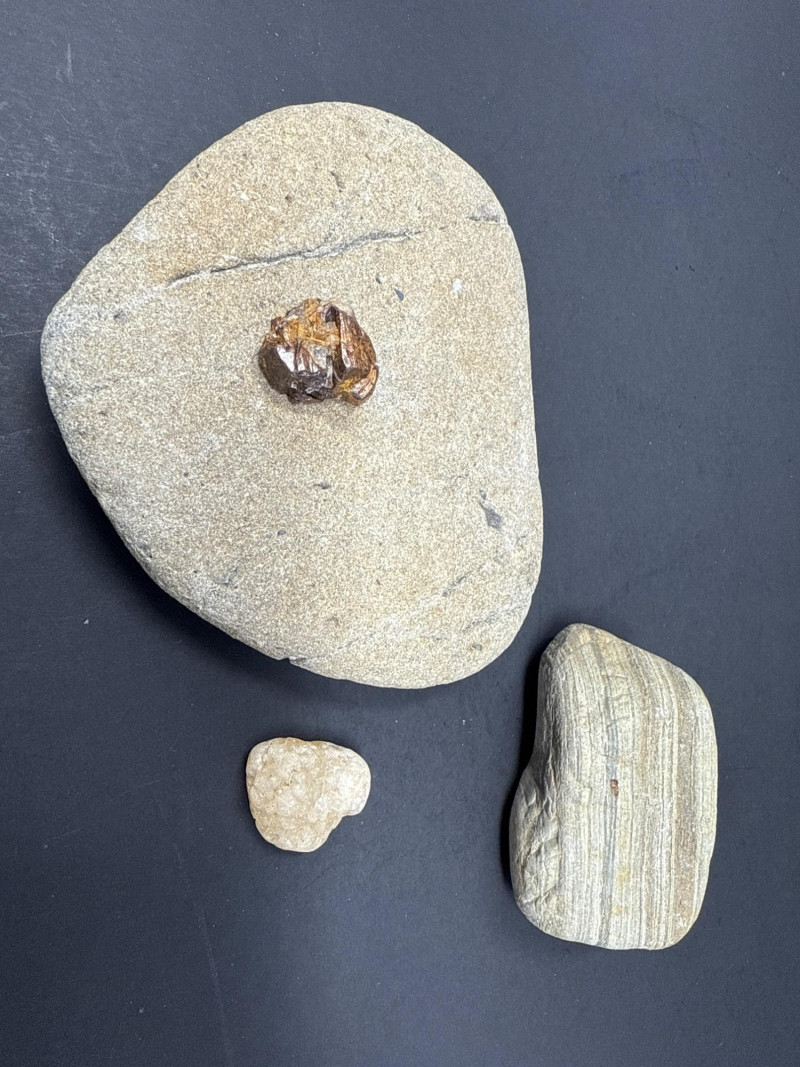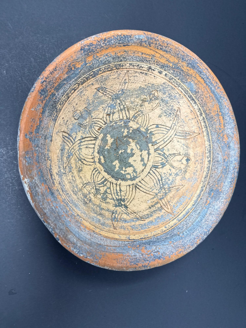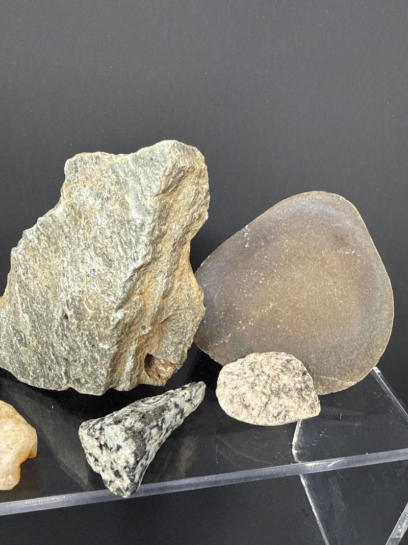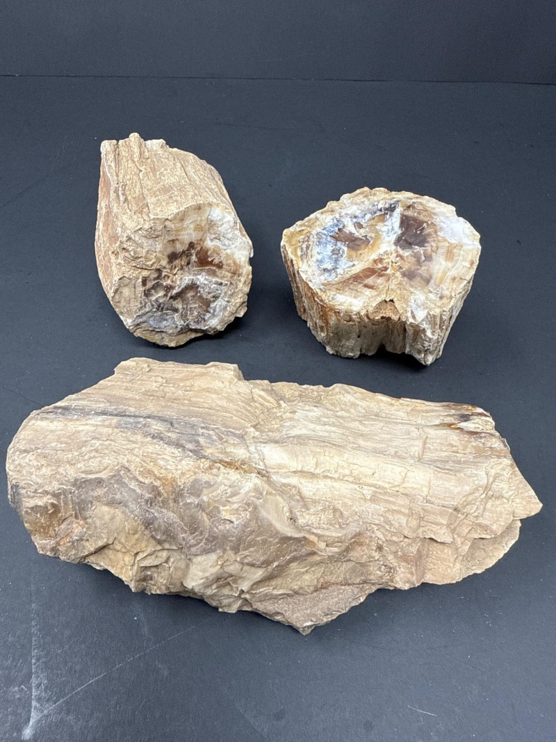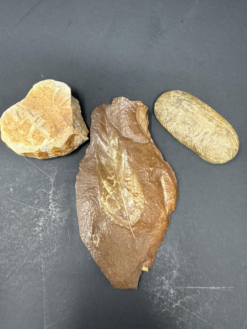 Variety: Fossil specimens, petrified wood fragments, assorted mineral rocks, and a hand-formed pottery bowl A curated selection of natural and crafted pieces, this lot includes: Fossils: Several small to medium-sized fossil specimens, likely marine in origin, showcasing visible striations and embedded textures. Petrified Wood: A few polished and raw fragments of petrified wood, with rich earthy tones and visible grain patterns. Some large pieces. Rocks: Assorted mineral and crystal specimens, possibly including quartz, agate, and other semi-precious varieties. Pottery Bowl: A rustic, hand-thrown ceramic bowl with a matte glaze, possibly Southwest or folk-art inspired, ideal for display or use. Size is 10.5in wide and 3in tallDescription