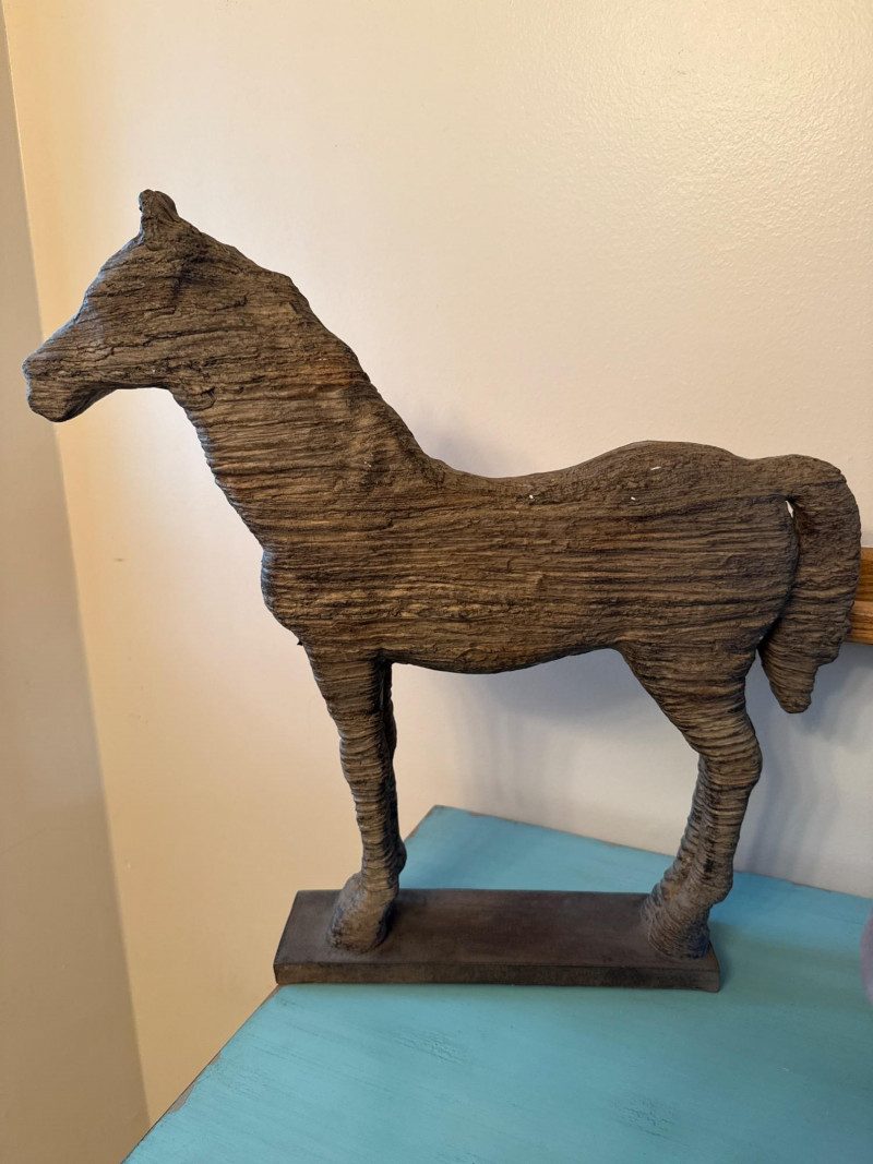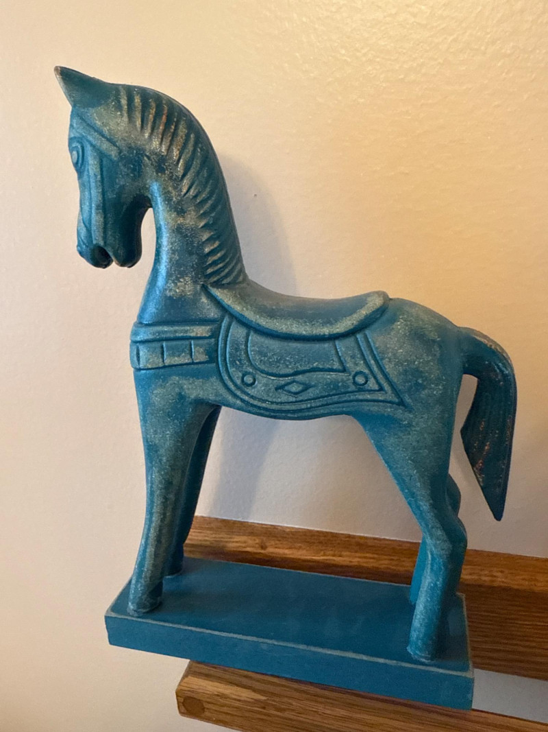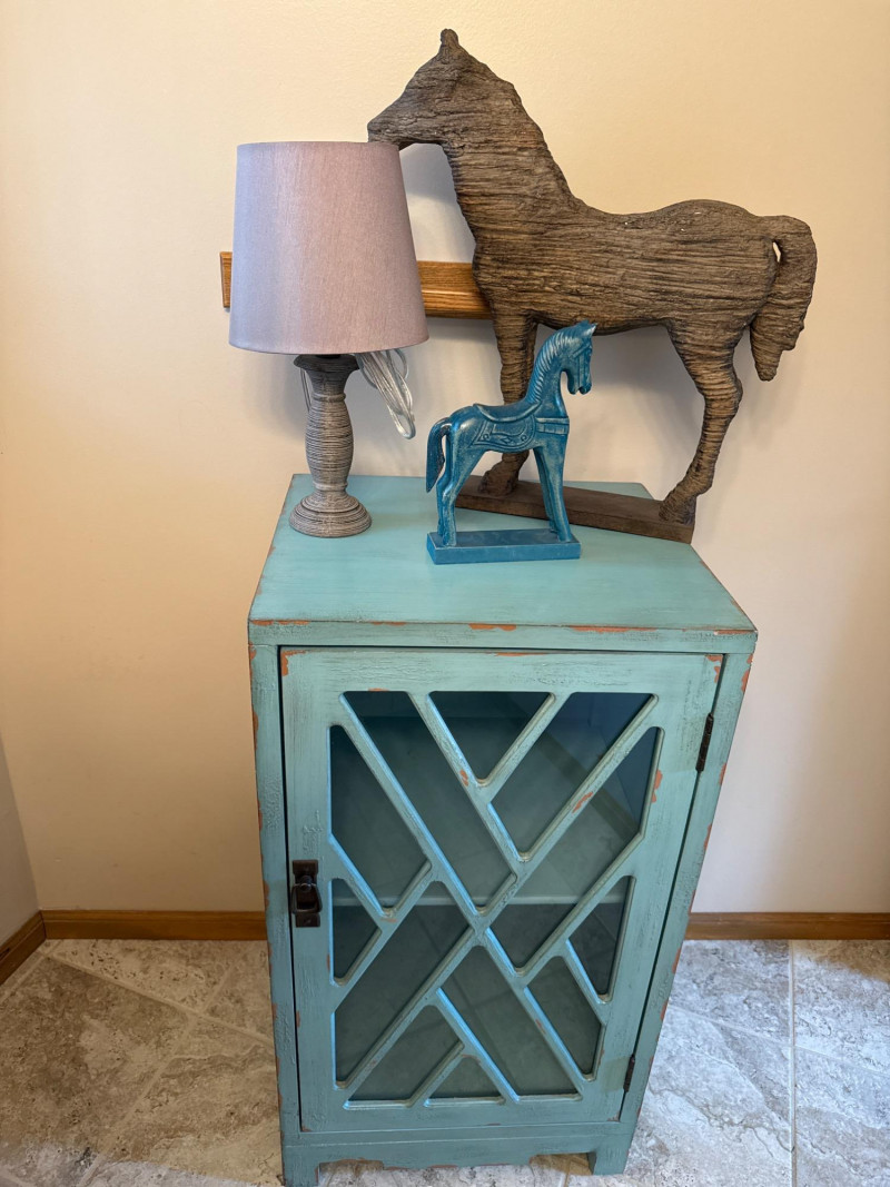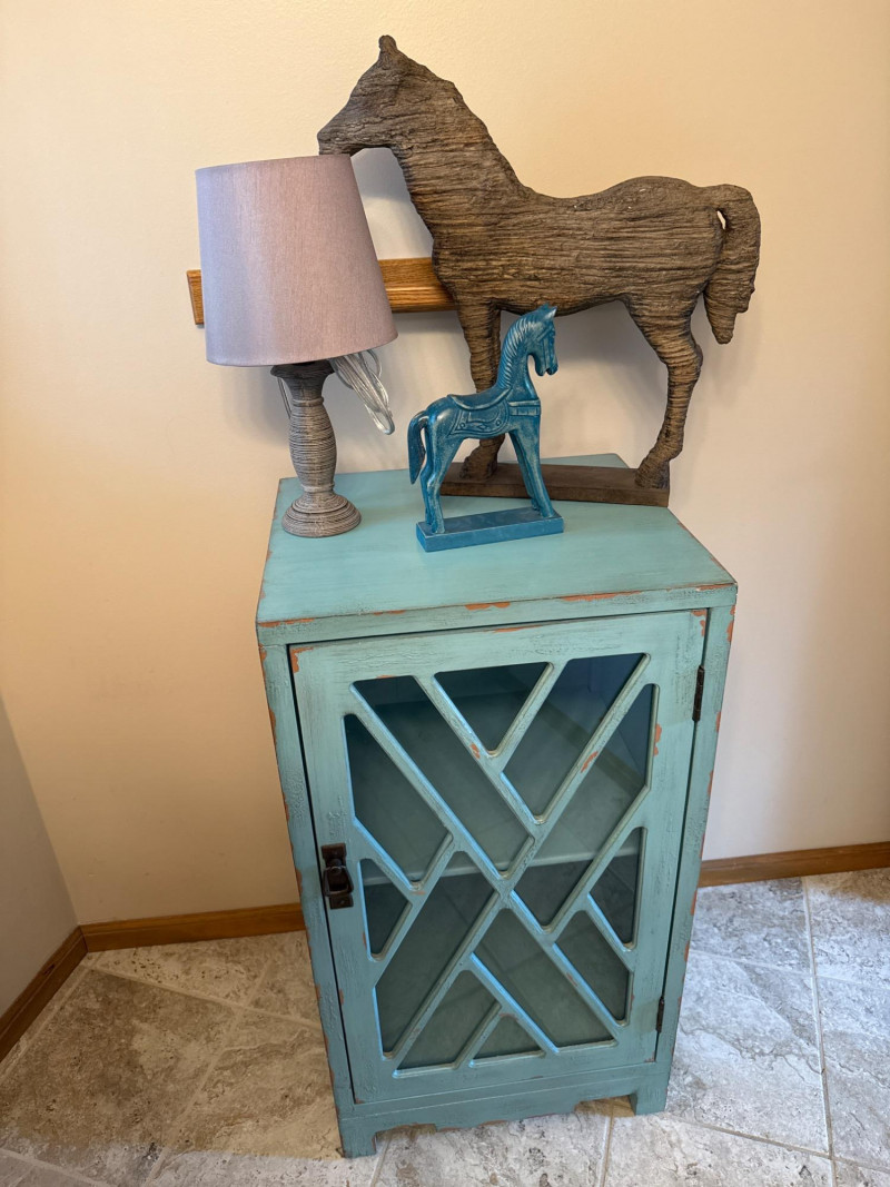Add a touch of rustic charm to your space with this teal-painted cabinet, styled in a shabby chic aesthetic. The distressed finish and soft color palette evoke a cozy, vintage-inspired ambiance perfect for cottage, farmhouse, or eclectic interiors. Contents Include: Teal wood cabinet with single door and lower storage compartment Assorted decorative items: Two wood, carved horses and wood table lamp Dimensions: Teal cabinet: Length: 18.5 inches Width: 16 inches Height: 34.5 inches Large Horse: Condition: Cabinet shows intentional wear consistent with shabby chic styling (minor surface scuffs and paint distressing) Decorative items in good vintage condition; no major flaws noted This lot is ideal for staging, home décor, or resale.