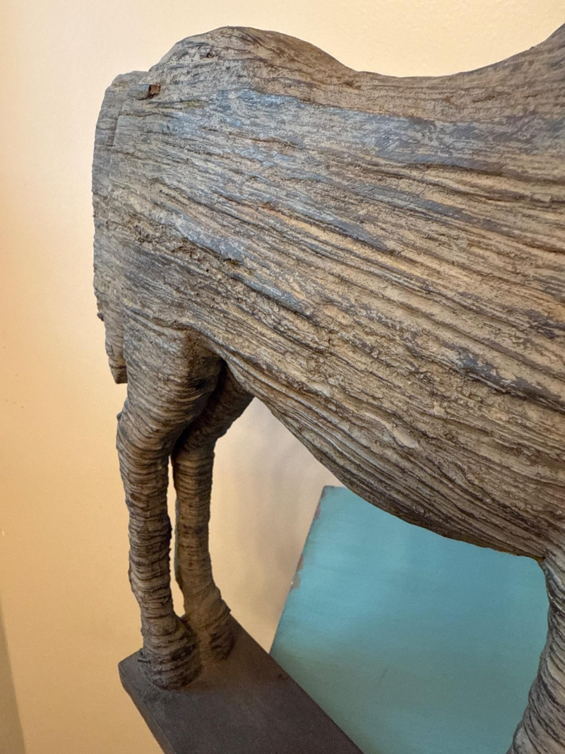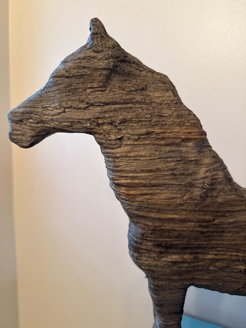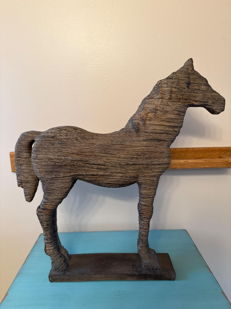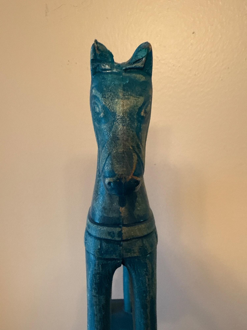 Add a touch of rustic charm to your space with this teal-painted cabinet, styled in a shabby chic aesthetic. The distressed finish and soft color palette evoke a cozy, vintage-inspired ambiance perfect for cottage, farmhouse, or eclectic interiors. Contents Include: Teal wood cabinet with single door and lower storage compartment Assorted decorative items: Two wood, carved horses and wood table lamp Dimensions: Teal cabinet: Length: 18.5 inches Width: 16 inches Height: 34.5 inches Large Horse: Condition: Cabinet shows intentional wear consistent with shabby chic styling (minor surface scuffs and paint distressing) Decorative items in good vintage condition; no major flaws noted This lot is ideal for staging, home décor, or resale.