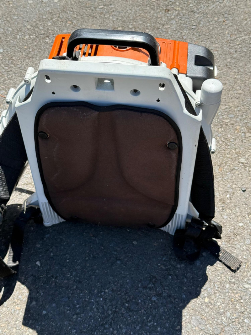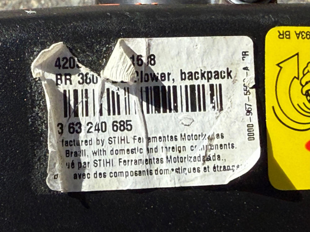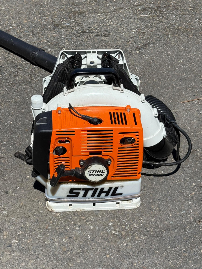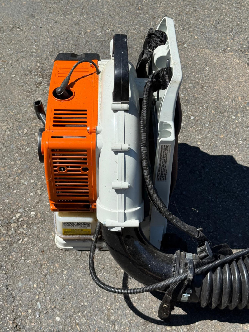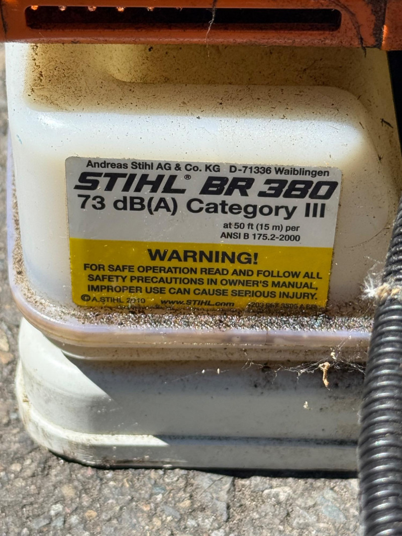 Make & Model: Manufacturer: Stihl Model: BR 380 Features & Components: Backpack-style design for ergonomic support and reduced operator fatigue High-powered gas engine for efficient leaf and debris clearing Durable plastic housing with integrated shoulder straps and padded backrest Throttle control handle with variable speed settings Air intake system designed for optimal airflow and cooling Fuel tank with secure cap and visible fill line Flexible blower tube with adjustable nozzle for directional control Condition: Appears to be in good used condition with typical signs of wear consistent with outdoor use No visible cracks or damage to housing or straps Functionality not fully tested due to-Lack of fuel Minor scuffs and surface residue from prior use All components present and securely attached