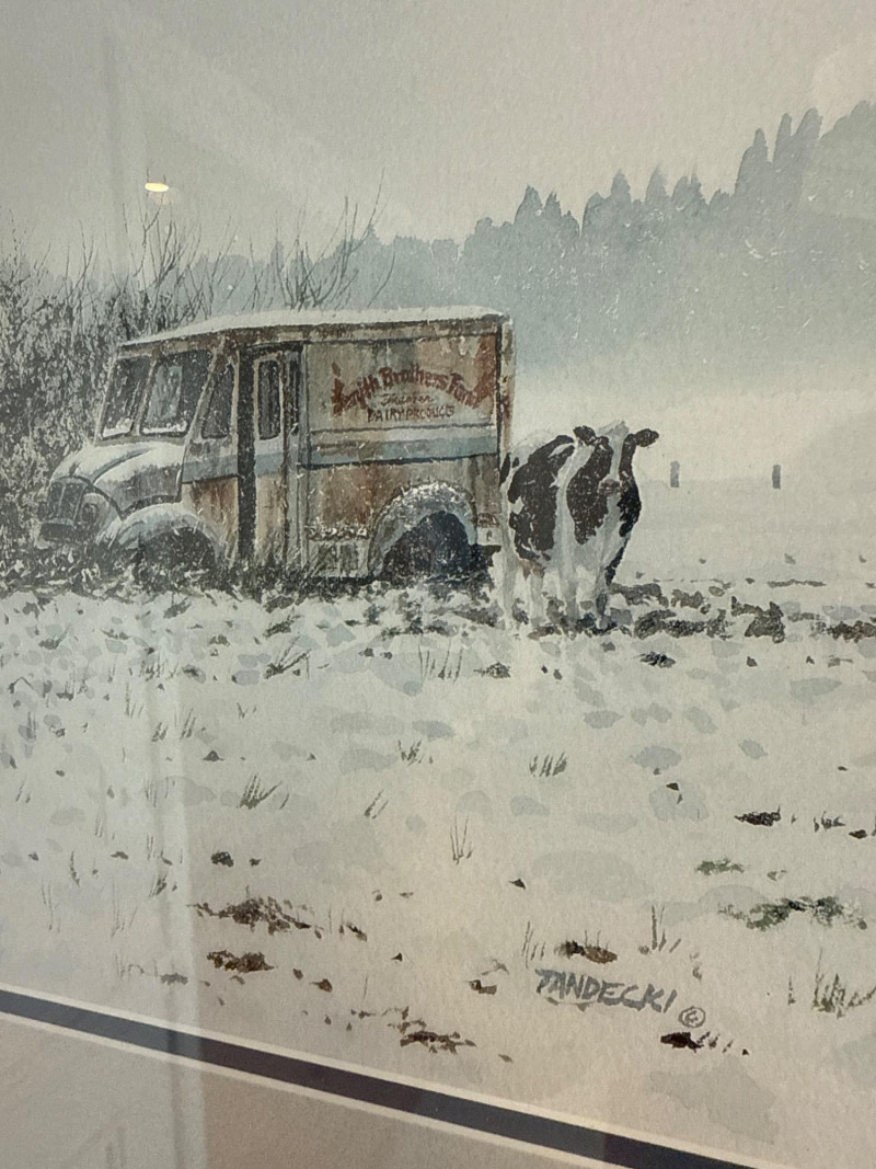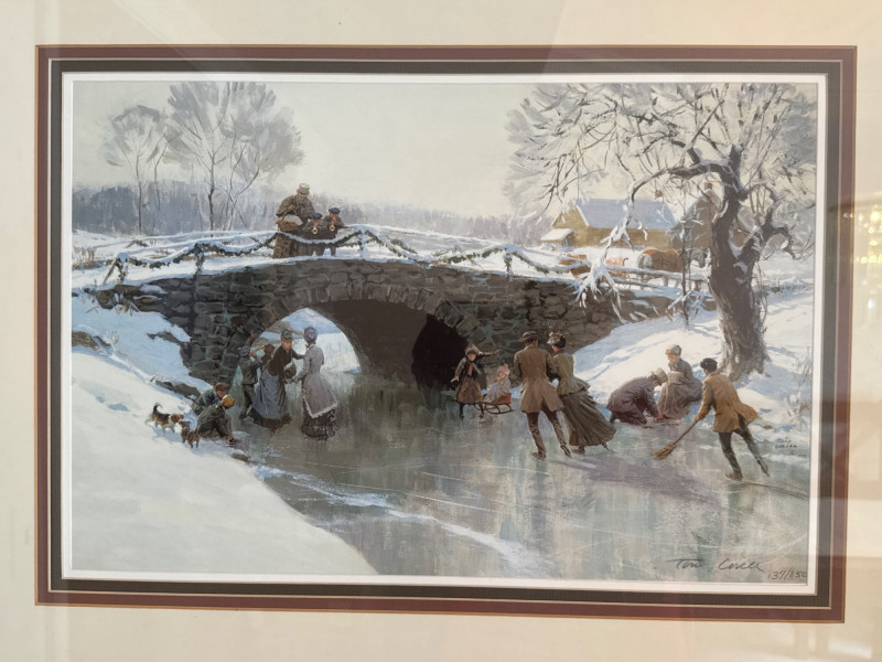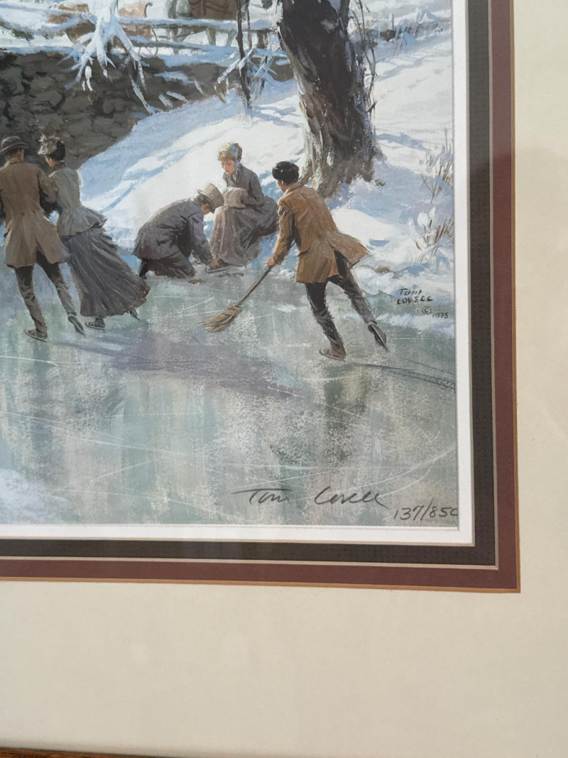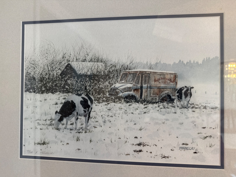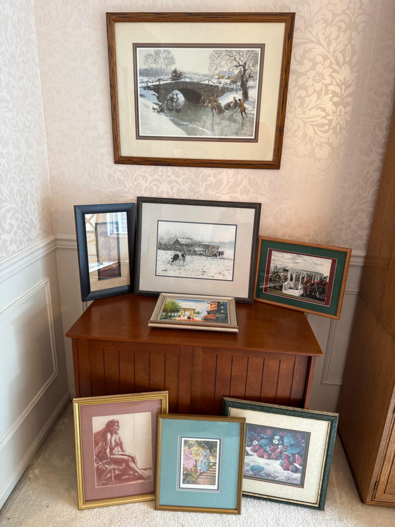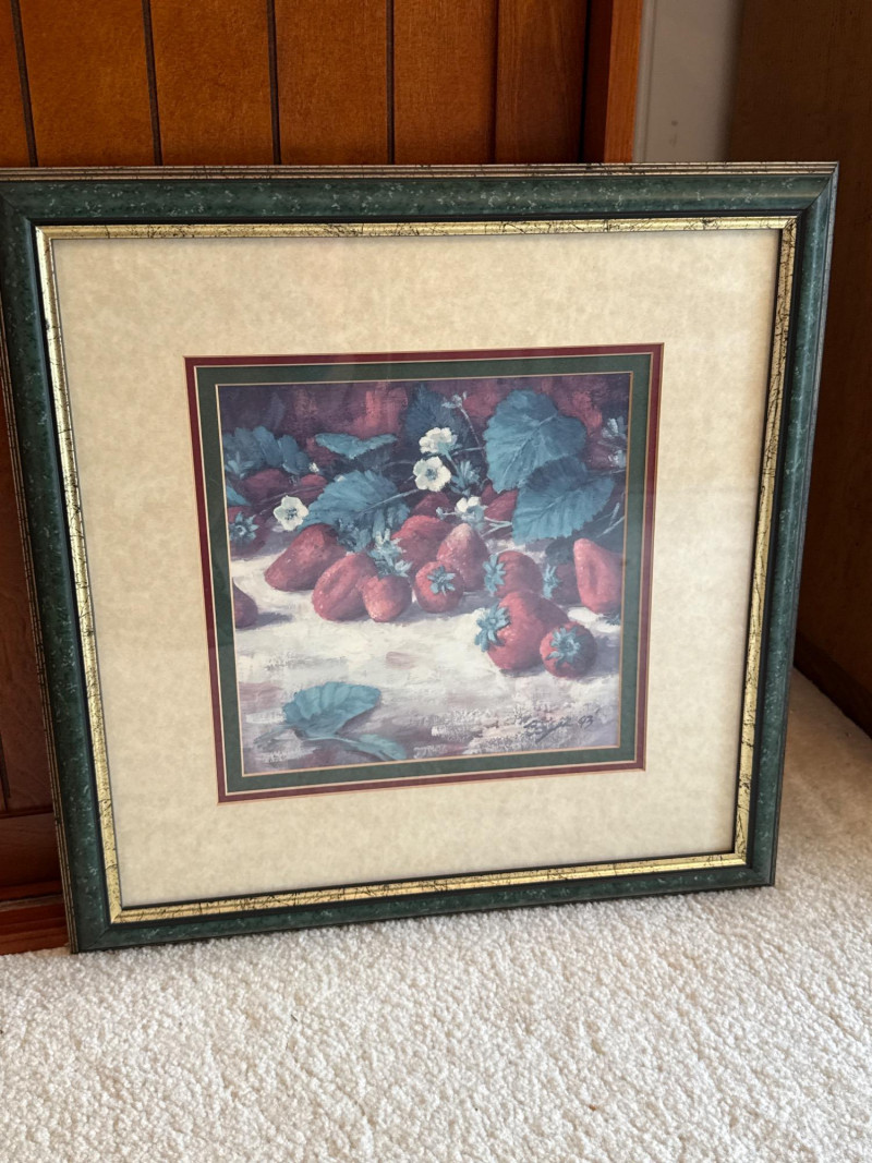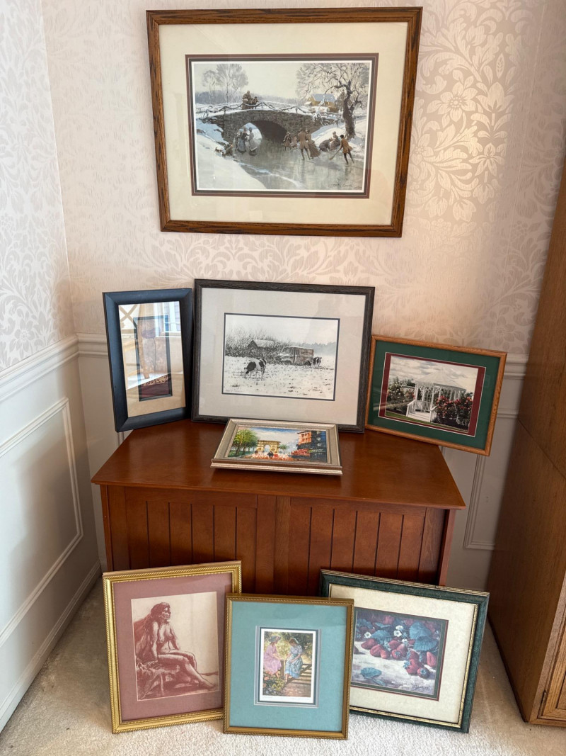 This lot comprises a curated selection of assorted framed artworks. While the individual pieces are not described in detail, the grouping suggests a mix of styles or subjects, potentially ideal for decorative or collector purposes. Contents: Eight eclectic framed art pieces Dimensions: Artist: Artist(s) legible- Boyer (Strawberries). Tom Lovell (Skate Scene) #137/850. Lynn Gertenbach (Secrets). Robert Tandecki (Cows in Snow) Josey ? (After the Bath) Condition: