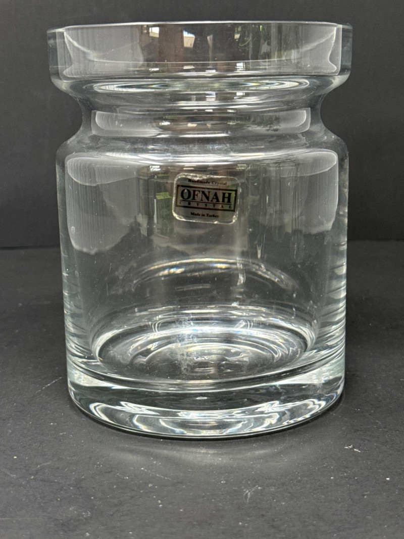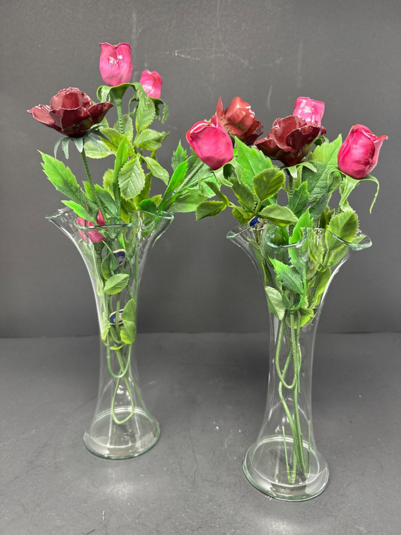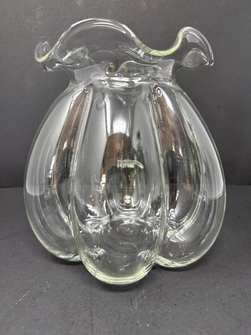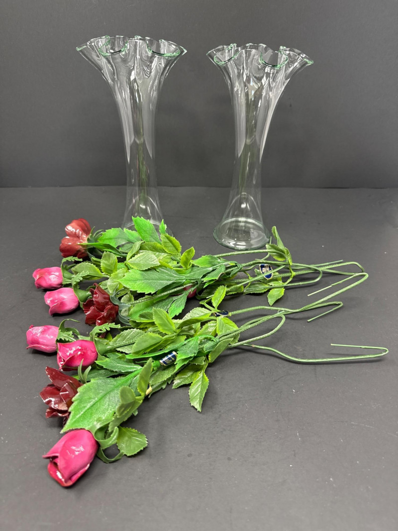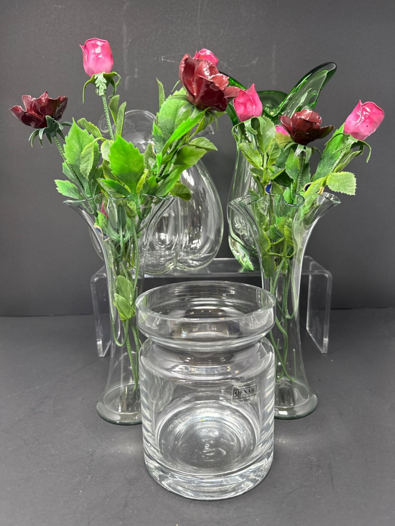 A charming mixed lot featuring decorative vases and ceramic floral accents, ideal for display or gifting. Contents & Brands: Heavy green glass vase – substantial and classic, with a smooth finish Fluted pumpkin-style vase – ribbed design, warm-toned glass Aynsley long-stem ceramic roses – delicate ceramic blooms with plastic stems. Fine ceramic, branded, known for quality craftsmanship Ofnah modern crystal vase – Refined with clean and simple design Two matching fluted flower vases – elegant shape with green-tint to glass Dimensions: Green glass vase: 9.75″ H × 6.5″ W Pumpkin-style vase: 8″ H × 6″ W Ofnah vase: 6″ H × 4.5″ W Other vases: dimensions not specified, but appear similarly sized Condition: