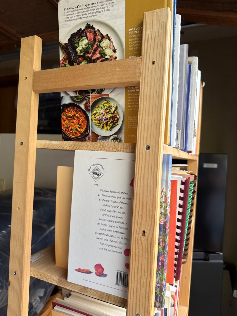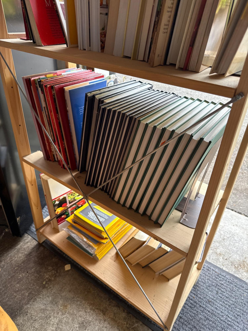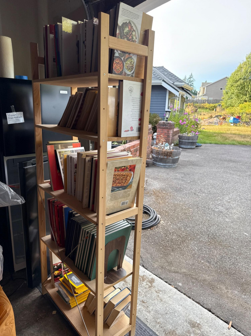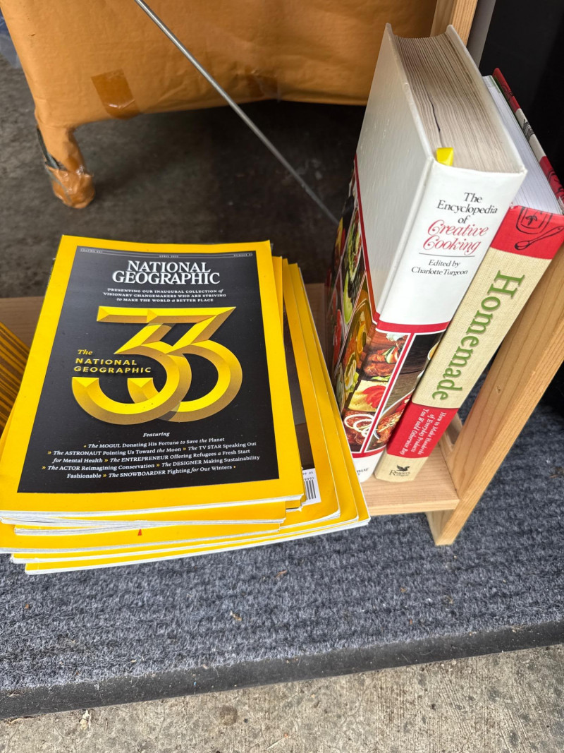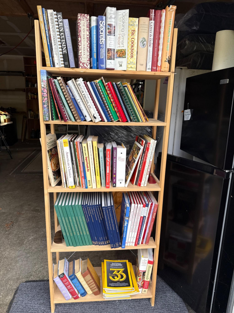A tall, narrow studio-style bookcase filled with assorted books, including a selection of National Geographic magazines. With its clean lines and compact footprint, this piece offers both storage and intellectual charm. Dimensions: 27" L × 11.5" W × 67" H Category: Books Contents: Mixed titles-cooking, travel, home maintenance, novels, health and National Geographic issues (specific volumes not listed) Finish: Natural wood with metal hardware and accents