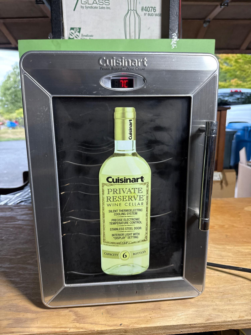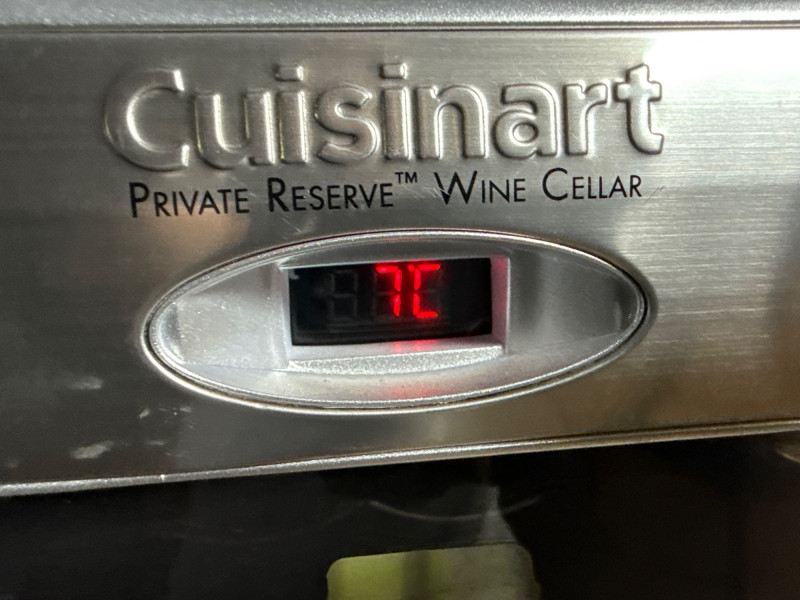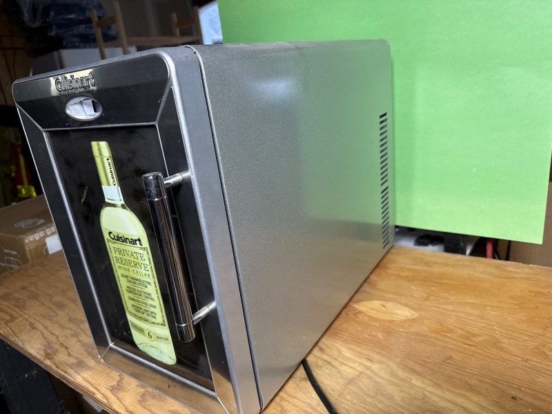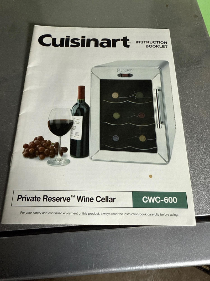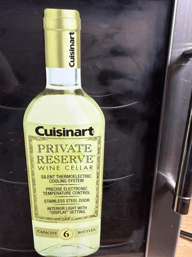 A compact and stylish Cuisinart Private Reserve wine cellar, tailored for small-space collectors or casual wine drinkers. With room for six bottles, this unit offers efficient cooling and elegant presentation. Dimensions: 11" L × 22" W × 16" H Category: General/Appliances Finish: Black with chrome trim (typical of the line) Features: Thermoelectric cooling, soft interior lighting, adjustable temperature settings Condition: