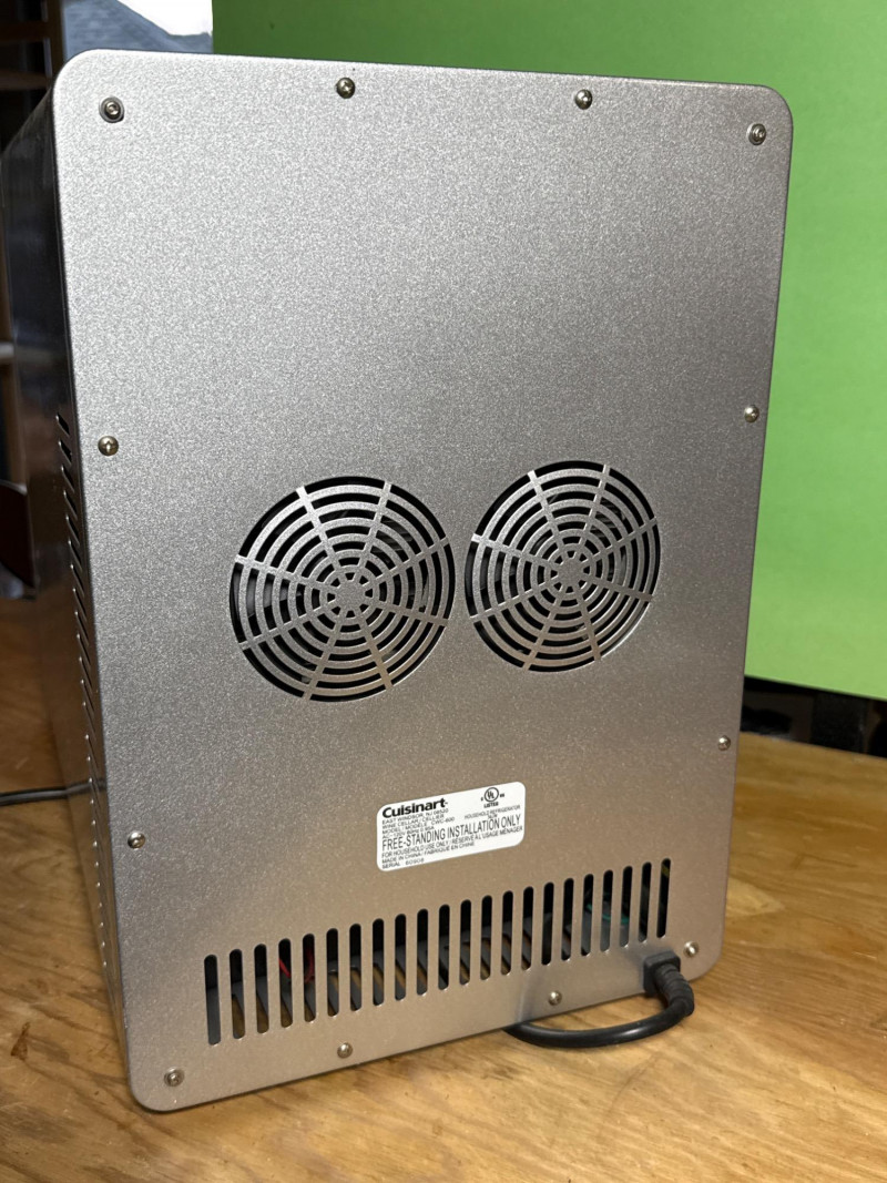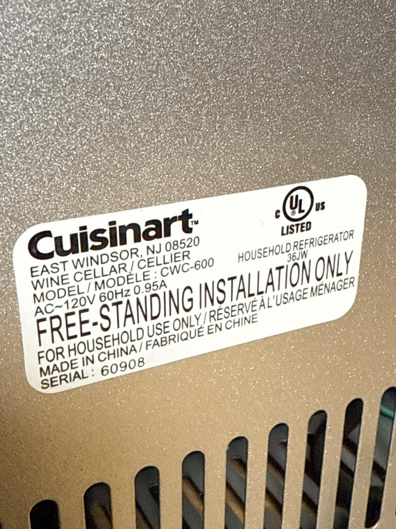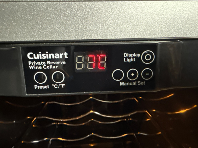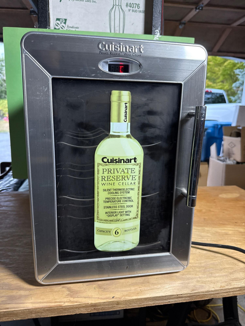 A compact and stylish Cuisinart Private Reserve wine cellar, tailored for small-space collectors or casual wine drinkers. With room for six bottles, this unit offers efficient cooling and elegant presentation. Dimensions: 11" L × 22" W × 16" H Category: General/Appliances Finish: Black with chrome trim (typical of the line) Features: Thermoelectric cooling, soft interior lighting, adjustable temperature settings Condition: