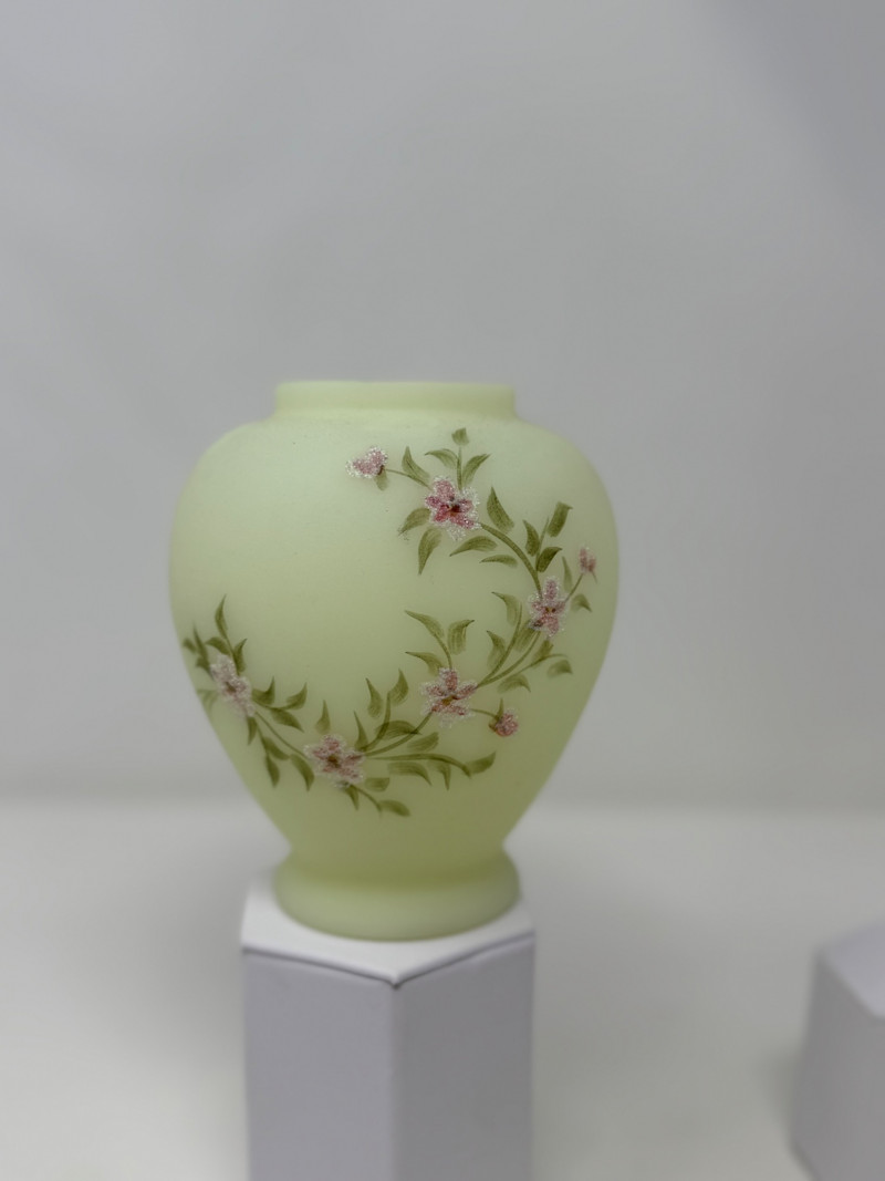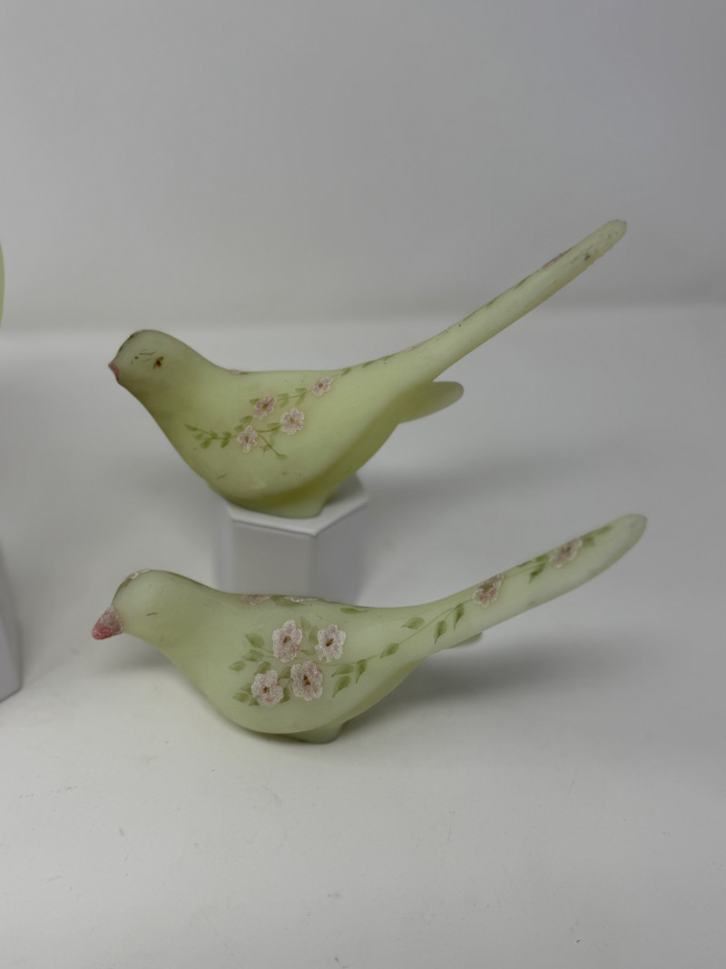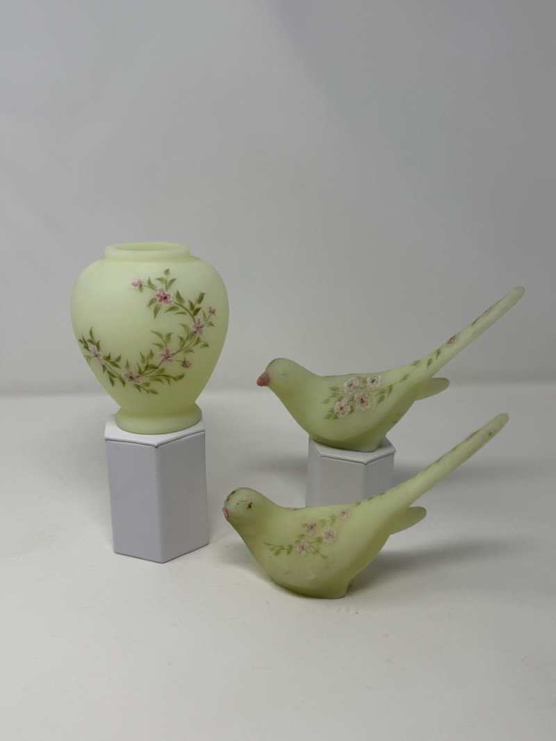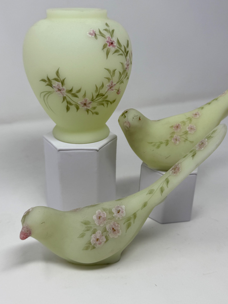 Hand-Painted Fenton Satin Glass Bird Figurines & Vase Set Charming three-piece set of Fenton satin glass, featuring two hand-painted bird figurines and a matching floral vase. Each piece showcases delicate pink blossoms and green foliage, beautifully detailed in traditional Fenton style. The soft satin glass finish adds a vintage elegance, making this a lovely addition to any glass or collectible display. All pieces are in excellent condition. Measurement's: Vase measures 5"H x 4"W Birds measure 5"H at tail