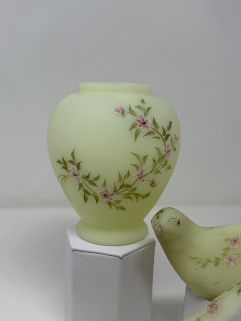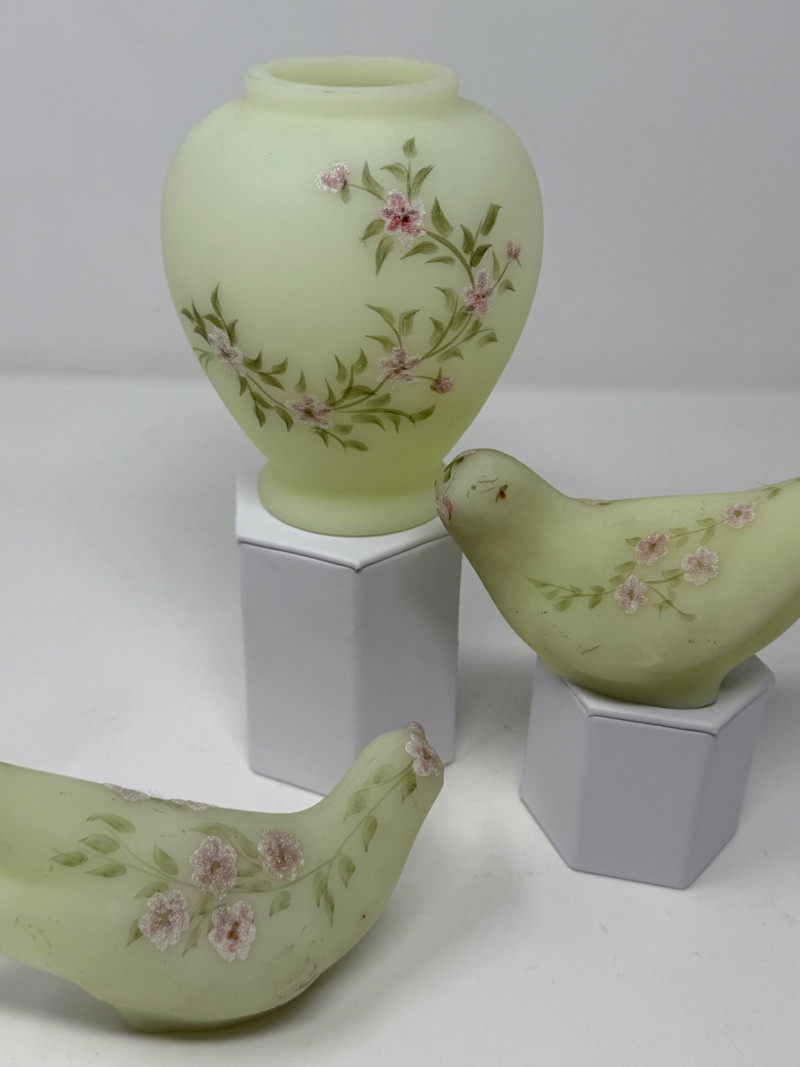 Lot # 84 - Hand-Painted Fenton Satin Glass Bird Figurines & Vase Set