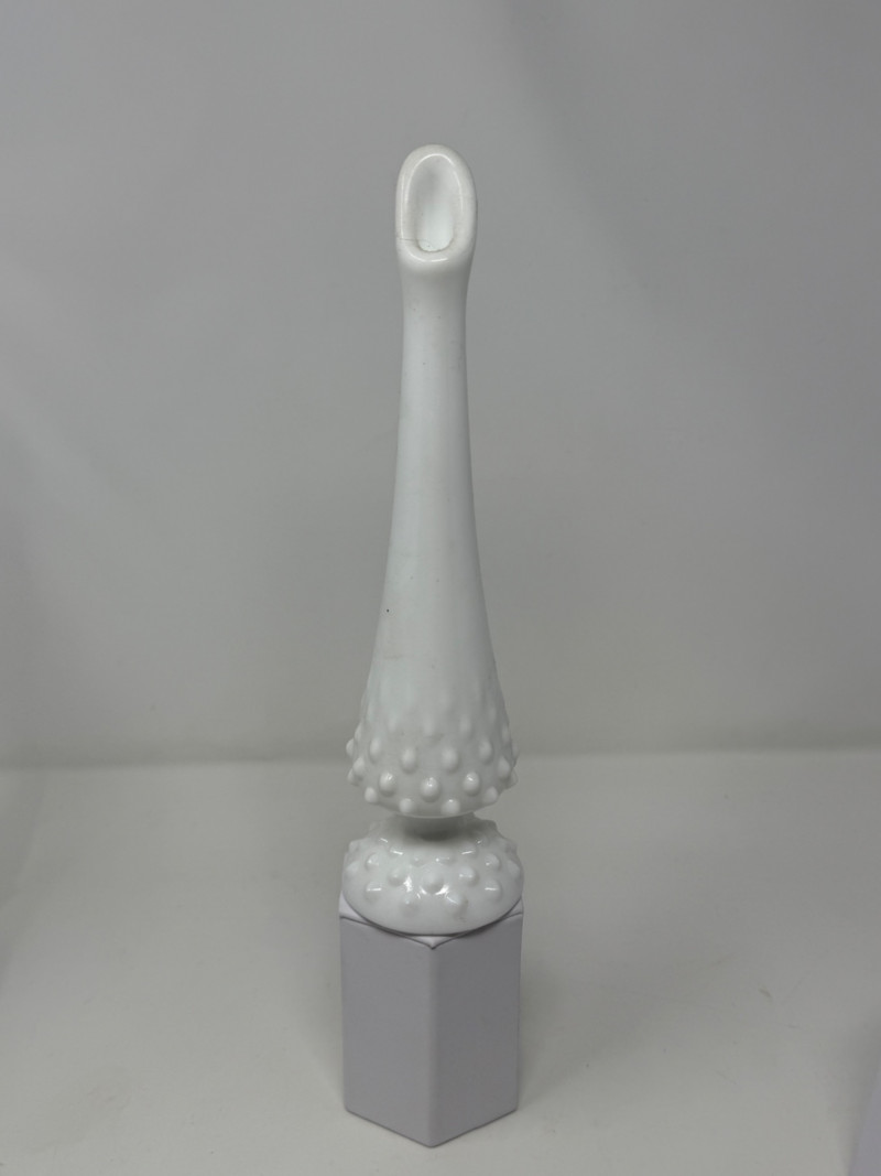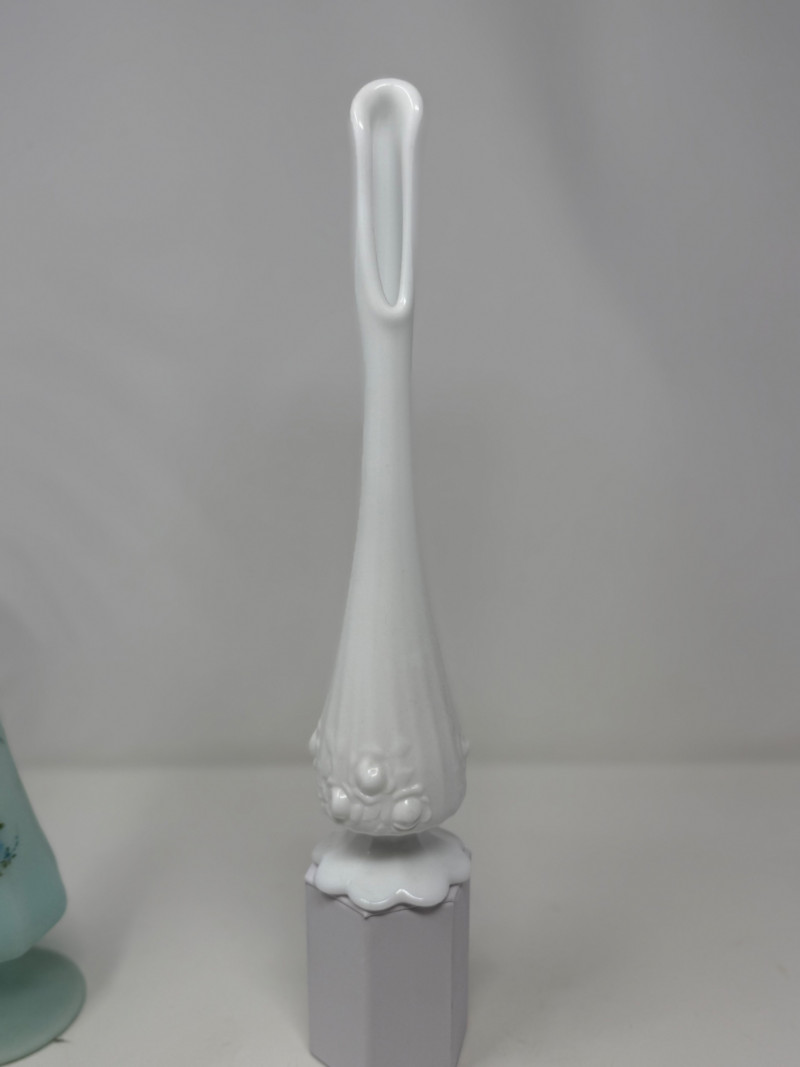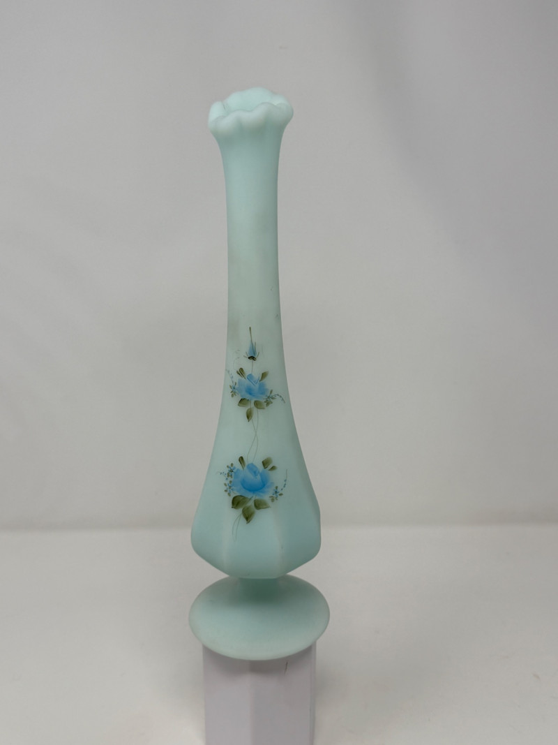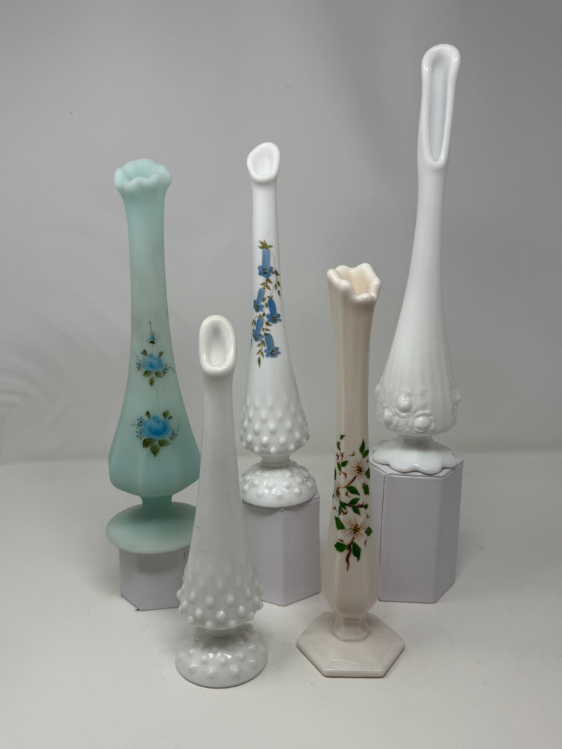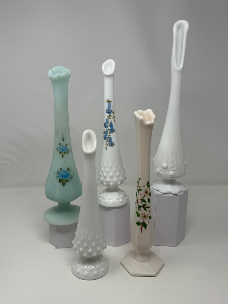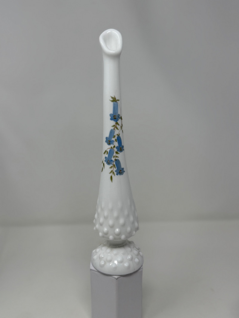 Fenton Art Glass Company, founded by brothers Frank and John Fenton in 1905, is well-known for its decorative and collectible glass pieces, including bud vases. Initially, the company focused on decorating glass blanks from other manufacturers, but they later established their own factory in Williamstown, West Virginia, in 1906, and began producing their own glass in 1907. Fenton is particularly recognized for introducing carnival glass in 1907 and for its hobnail patterns, which became a popular design in the mid-20th century. All are different and in very good condition. Some are hand painted and signed Smallest bud vase is 10'H x 2.5"W Largest is 12"H x 3"W