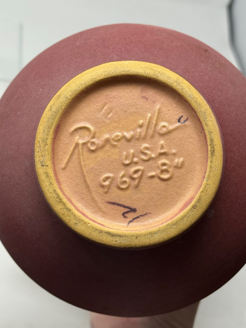 Roseville Pottery was established in Roseville, Ohio, in 1890. Over the years, the company expanded its production to include a wide range of decorative wares, and by the early 20th century, Roseville had shifted its focus toward producing finely crafted art pottery in response to the growing Arts and Crafts movement. Many popular patterns and styles helped establish Roseville as a leading American art pottery maker, known for its high-quality craftsmanship and distinctive, nature-inspired designs. Roseville Pottery ceased operations in 1954, largely due to changing consumer tastes and increased competition from mass-produced ceramics. Despite its closure, Roseville pottery remains highly sought after by collectors due to their historical significance, artistic appeal, and the wide variety of shapes and patterns. Collectors prize Roseville for its floral motifs and elegant designs. These factors continue to make Roseville Pottery a staple in the American art pottery collecting world. 8.5"H x 7"W