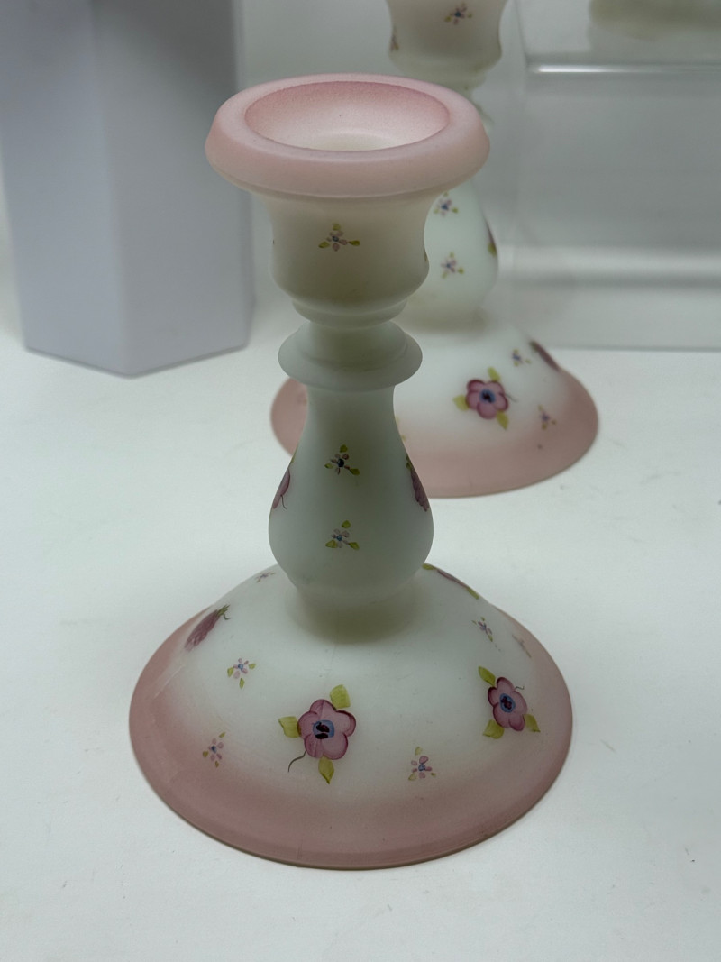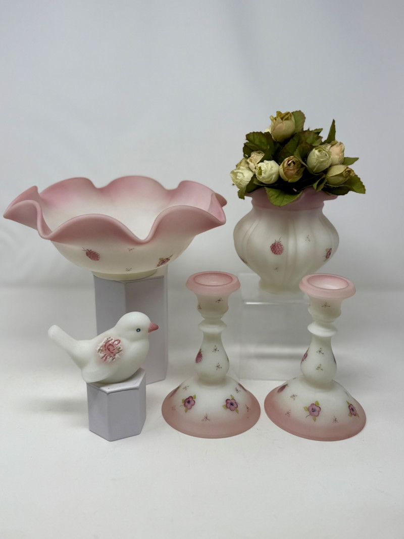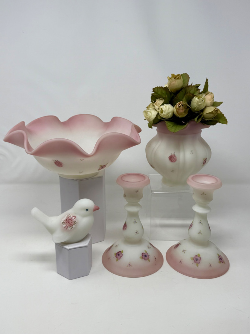 Fenton's "Berries and Blossoms" is a popular pattern featuring delicate floral designs, often seen on various Fenton glass pieces like vases, bowls, and pitchers. It was a common design element used to enhance the beauty of their glassware, especially during the mid-20th century. The pattern's popularity has made it a sought-after collectible among Fenton enthusiasts. This Vintage Fenton Berries and Blossoms Satin Set includes an Opal Satin Compote and a Bell. All are in great condition. Candlesticks measure 6"H x 4.5"W Large Bowl measures 4"H x 9.5"W