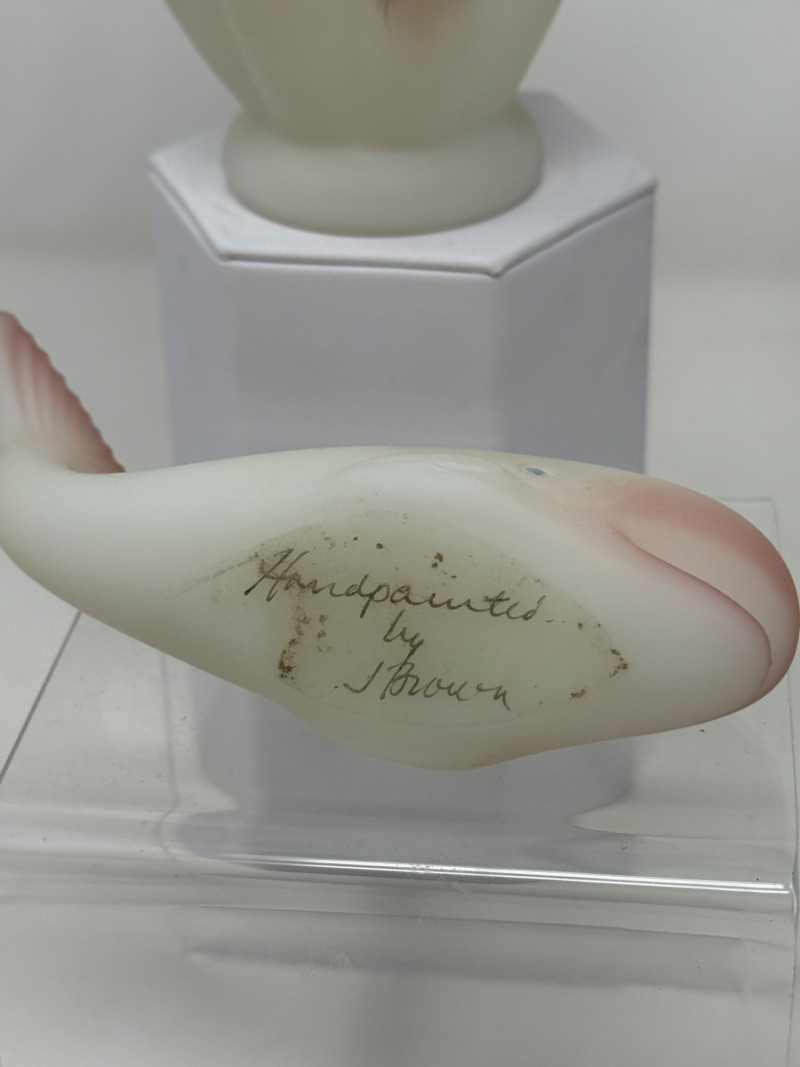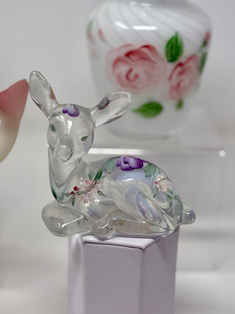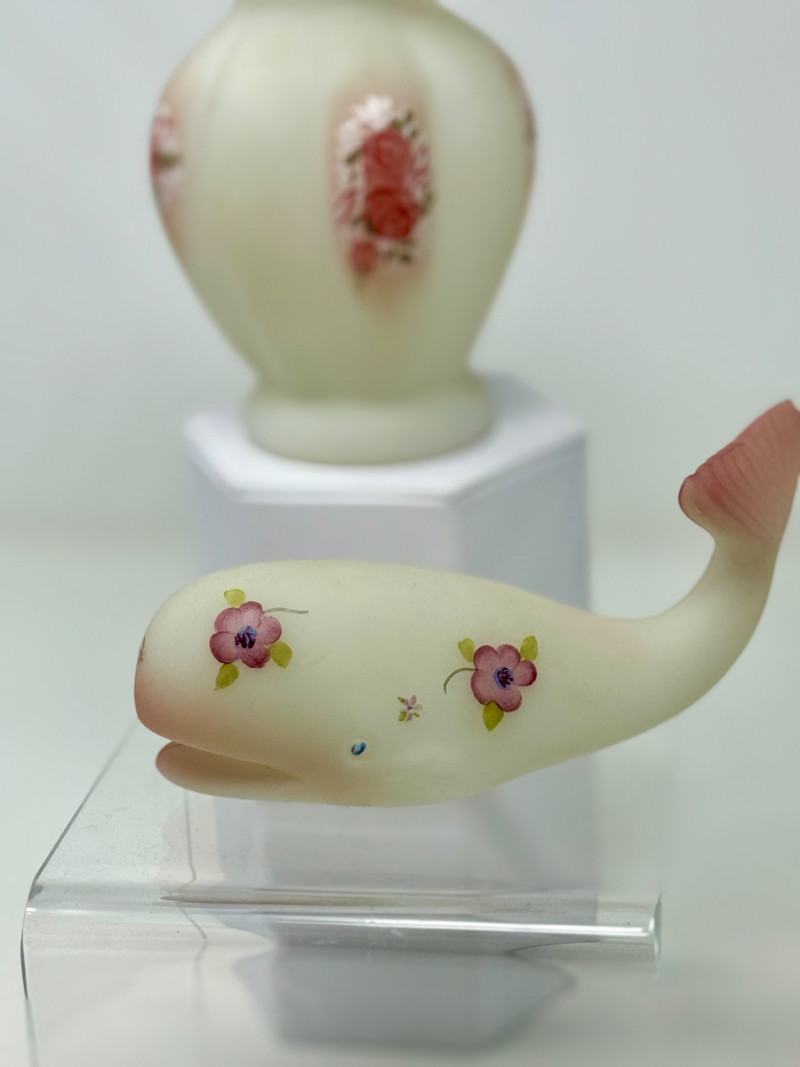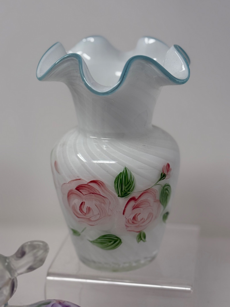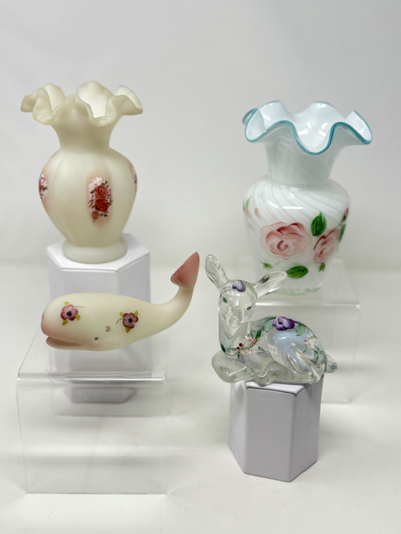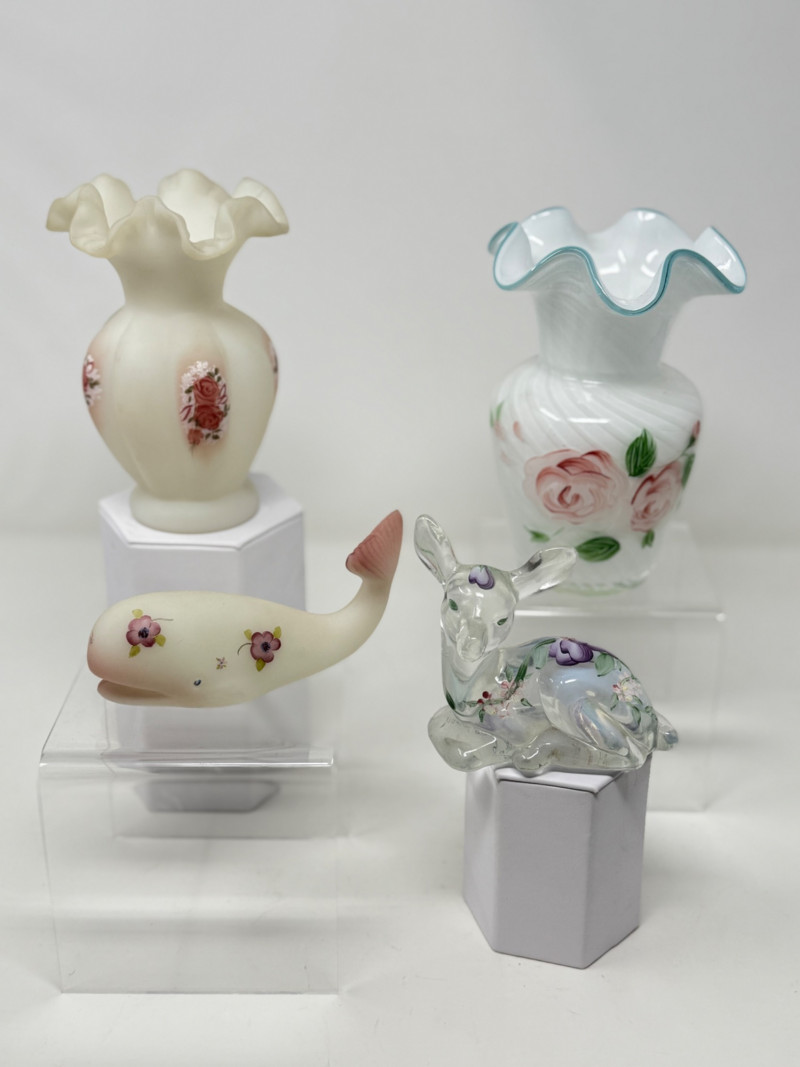 An adorable lot of 4 Fenton Art Glass hand painted animals and small vases!! Measurement's range from 5"W x 2.5"H to 6"H x 4"W