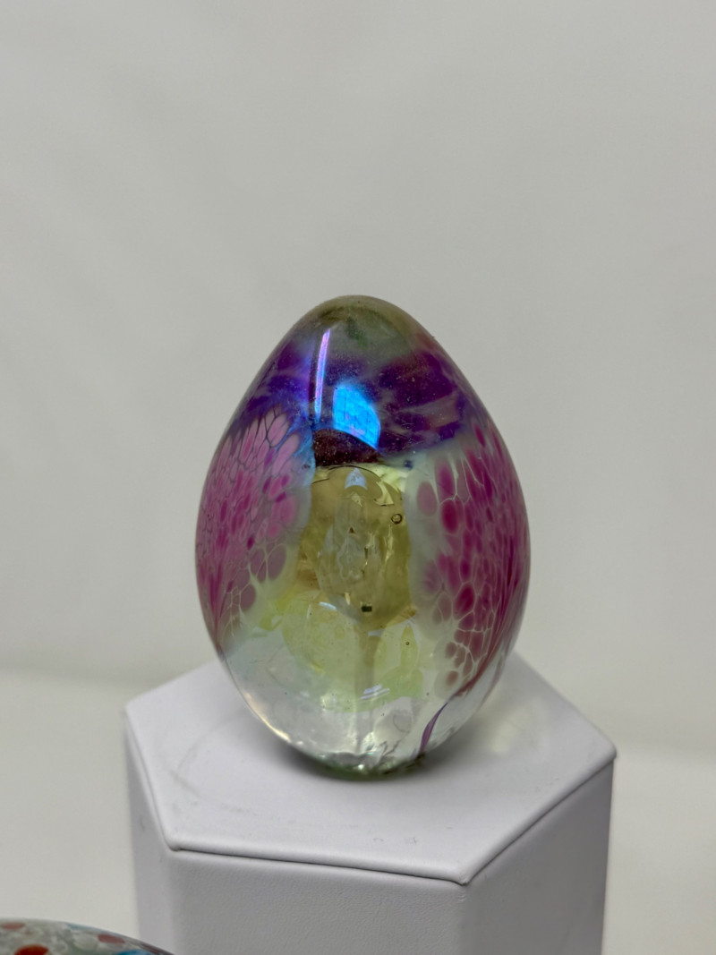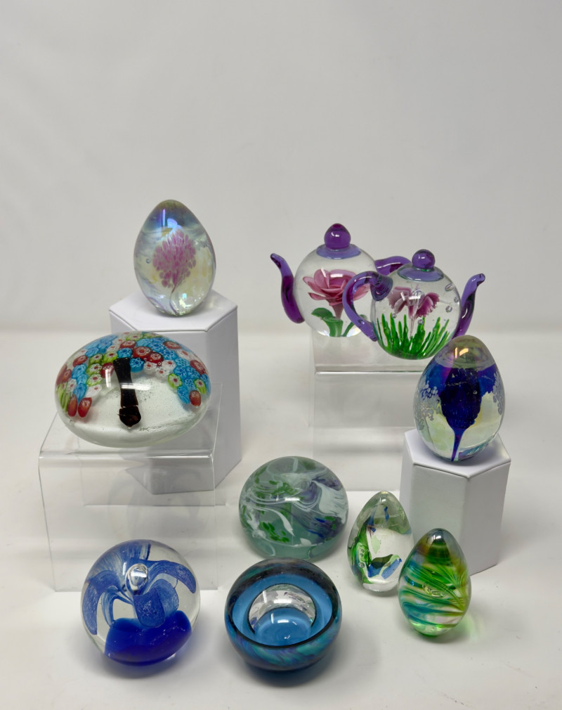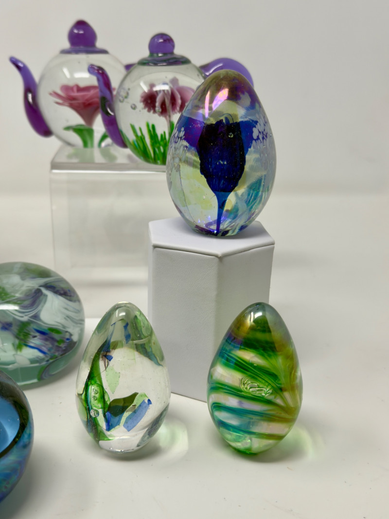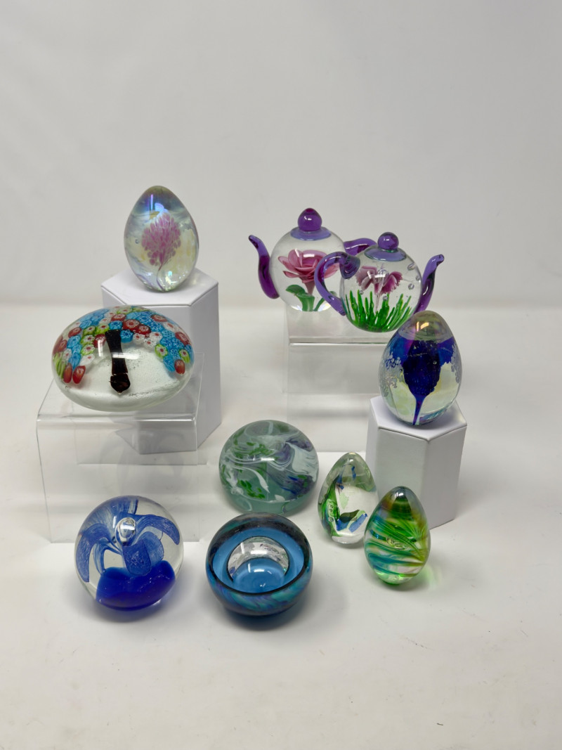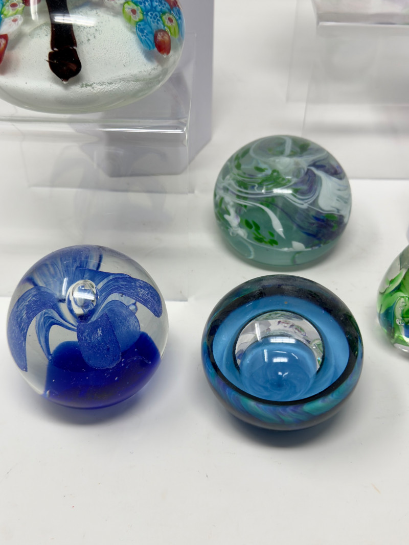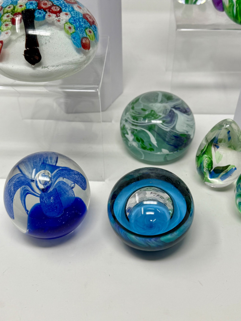 Collection of Art Glass Paperweights Assorted collection of decorative art glass paperweights in various colors and patterns, including millefiori-style canes, controlled bubbles, and swirled inclusions. The group features both clear and colored bases with intricate internal designs. Measurement's: Measurement's range from 3"H x 2"W to 3"H x 4"W